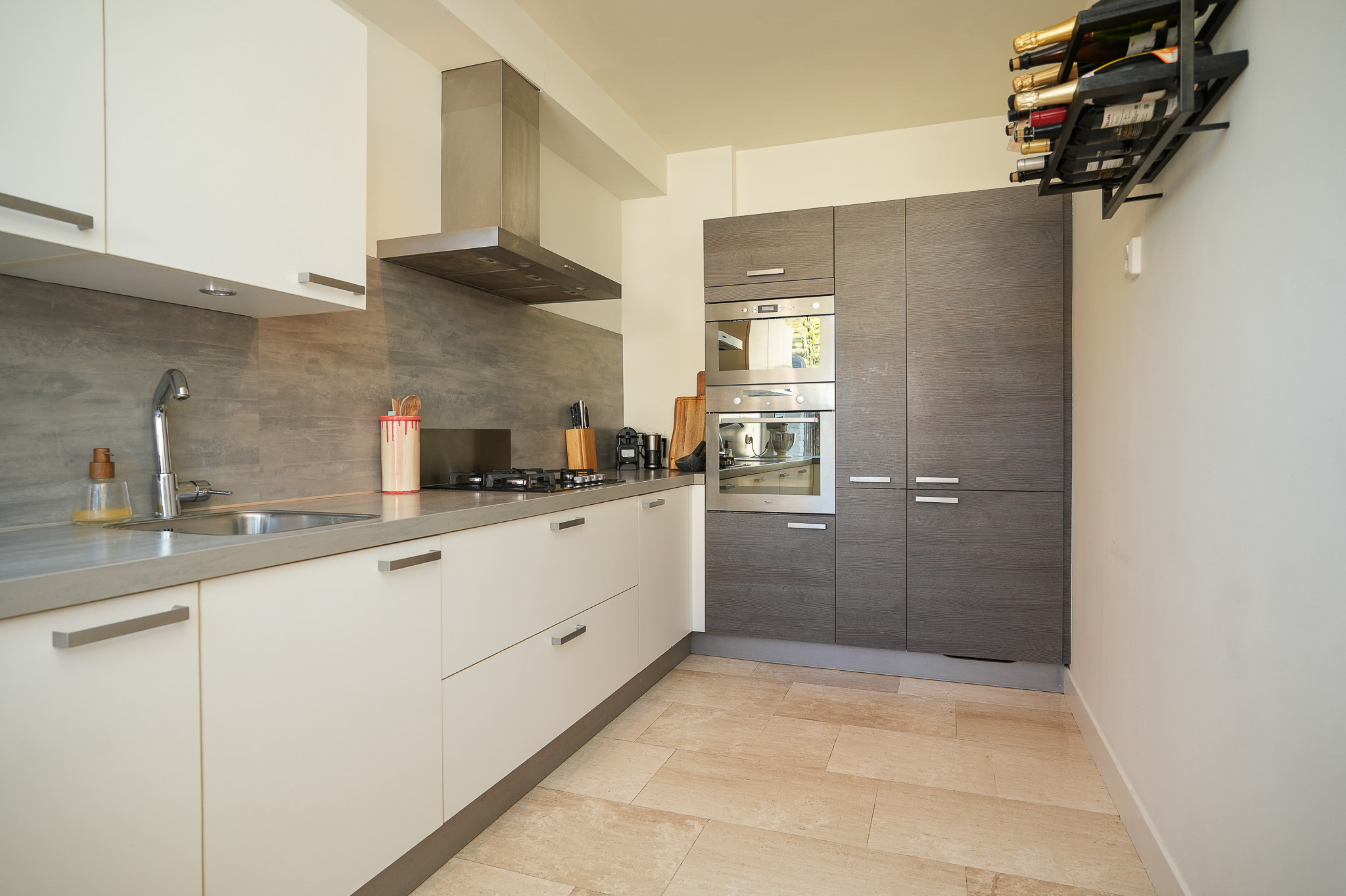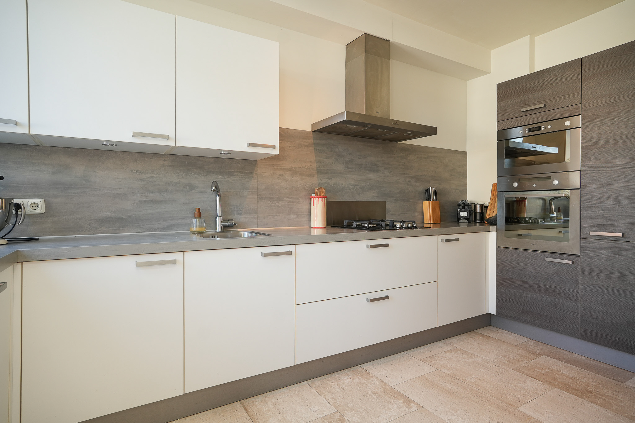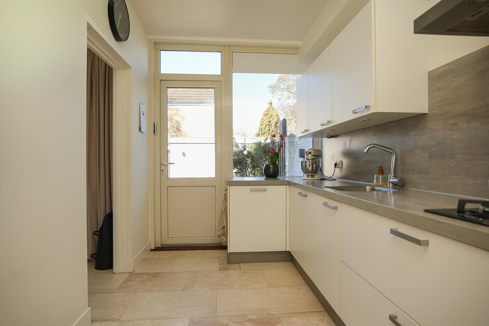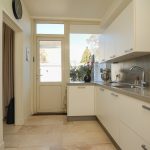 De keuken ligt aan de achterzijde van de woning en heeft een praktische opstelling met een moderne uitstraling. De keuken is voorzien van een ingebouwde oven, ingebouwde magnetron, 4 pits gaskookplaat, losse afzuigkap, ingebouwde vaatwasser en spoelbak met kraan. Vanuit de keuken stap je zo de achtertuin in, waar je volop kunt genieten van de middag en avondzon. De achtertuin heeft een achterom en een ruime schuur die voorzien is van elektra.