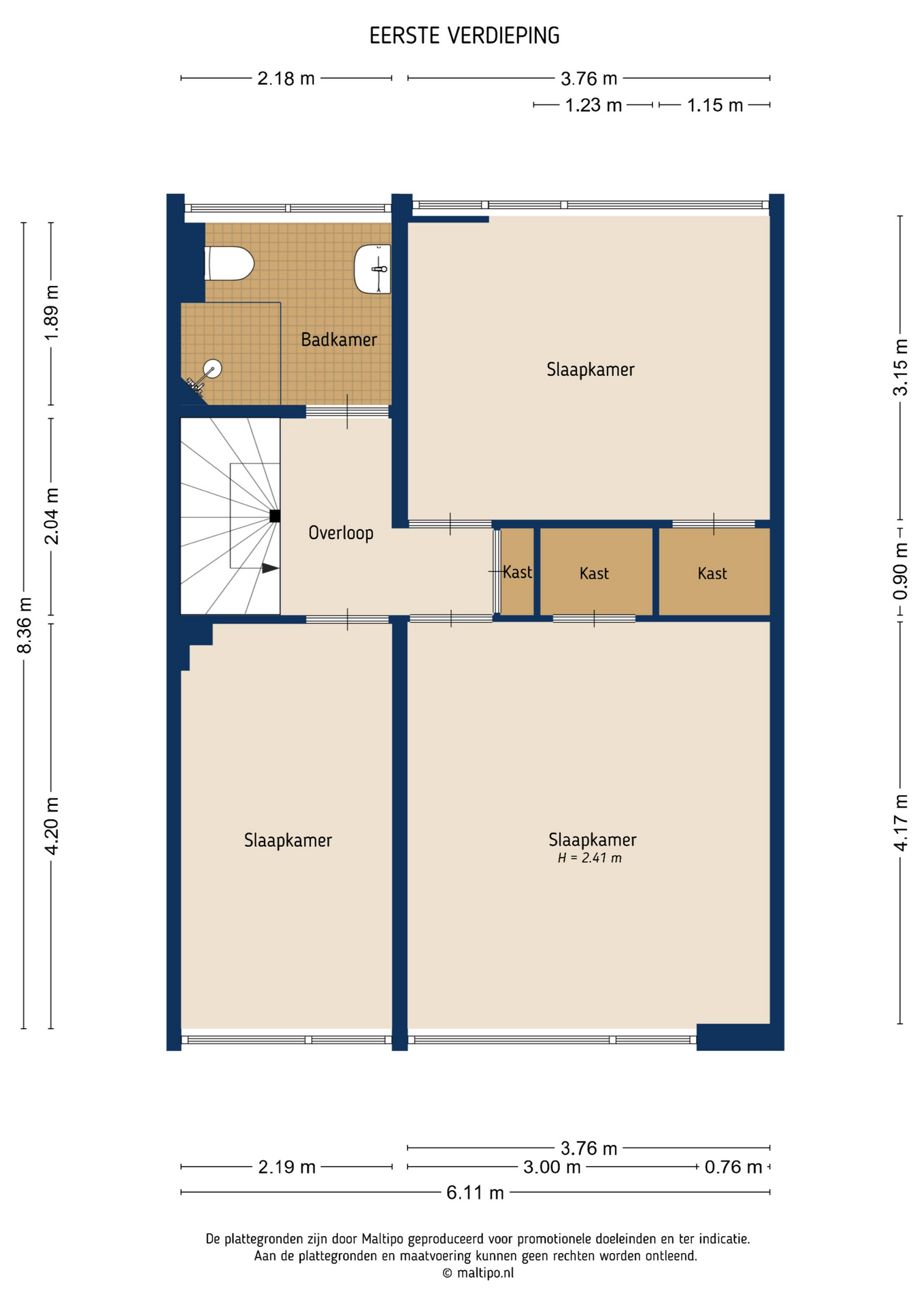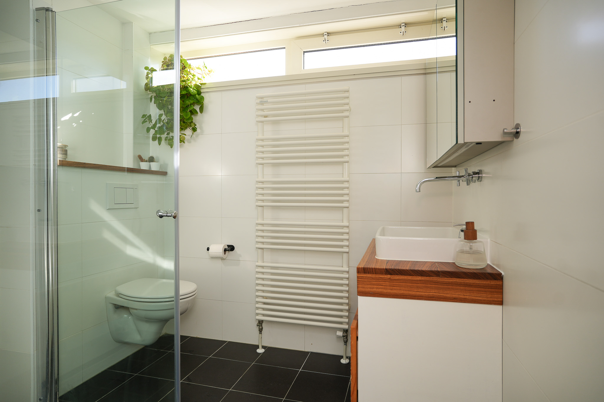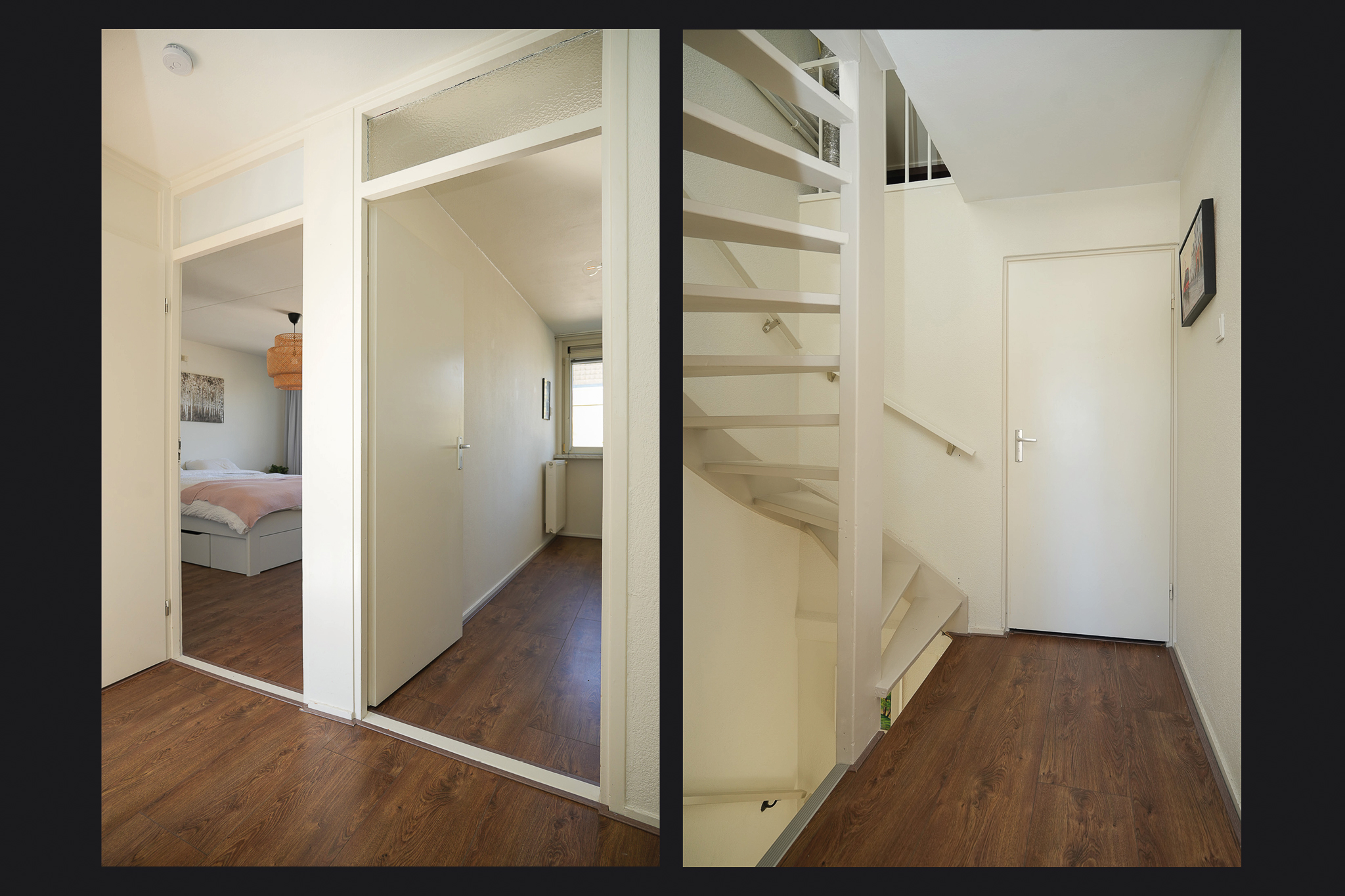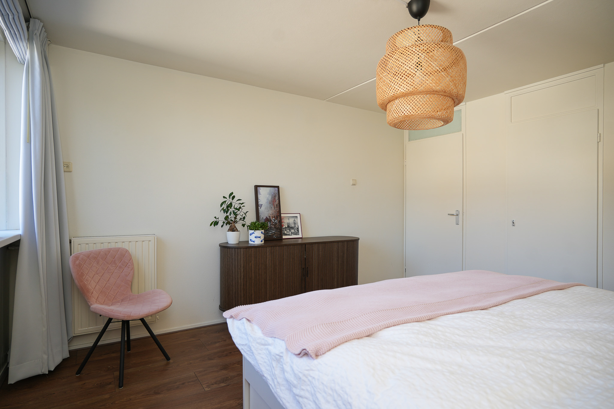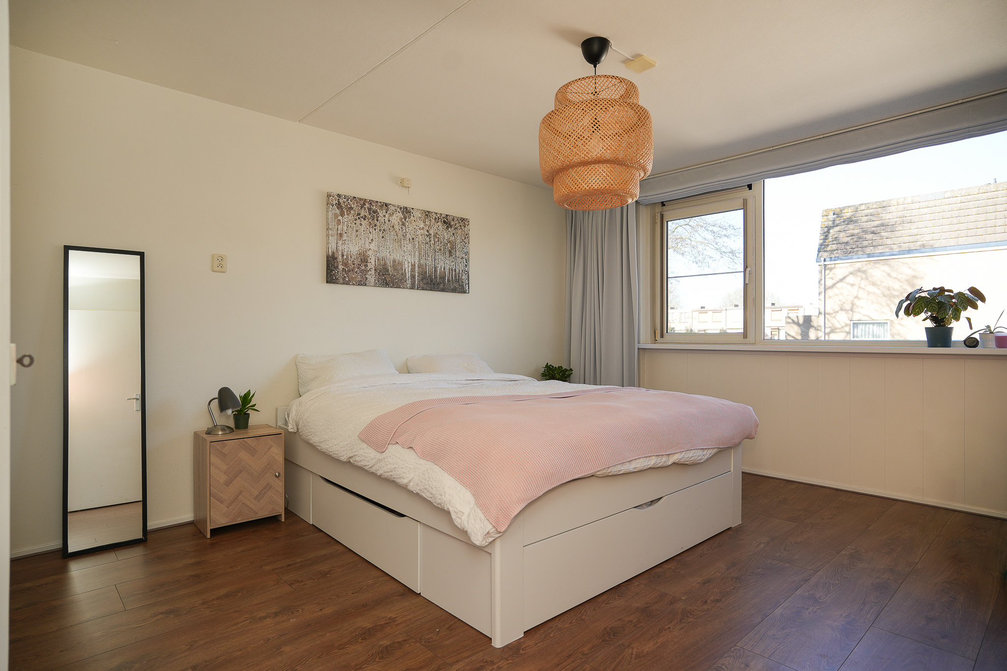 Op de eerste verdieping geeft de overloop toegang tot drie slaapkamers en de badkamer. Dankzij de fijne breedte van de woning zijn ook deze kamers prettig van formaat. Dat maakt deze verdieping bijzonder geschikt voor een gezin, maar ook voor wie extra ruimte zoekt voor een werk of hobbykamer. De badkamer is compleet ingericht met een inloopdouche, wastafel, toilet en een handdoekradiator.