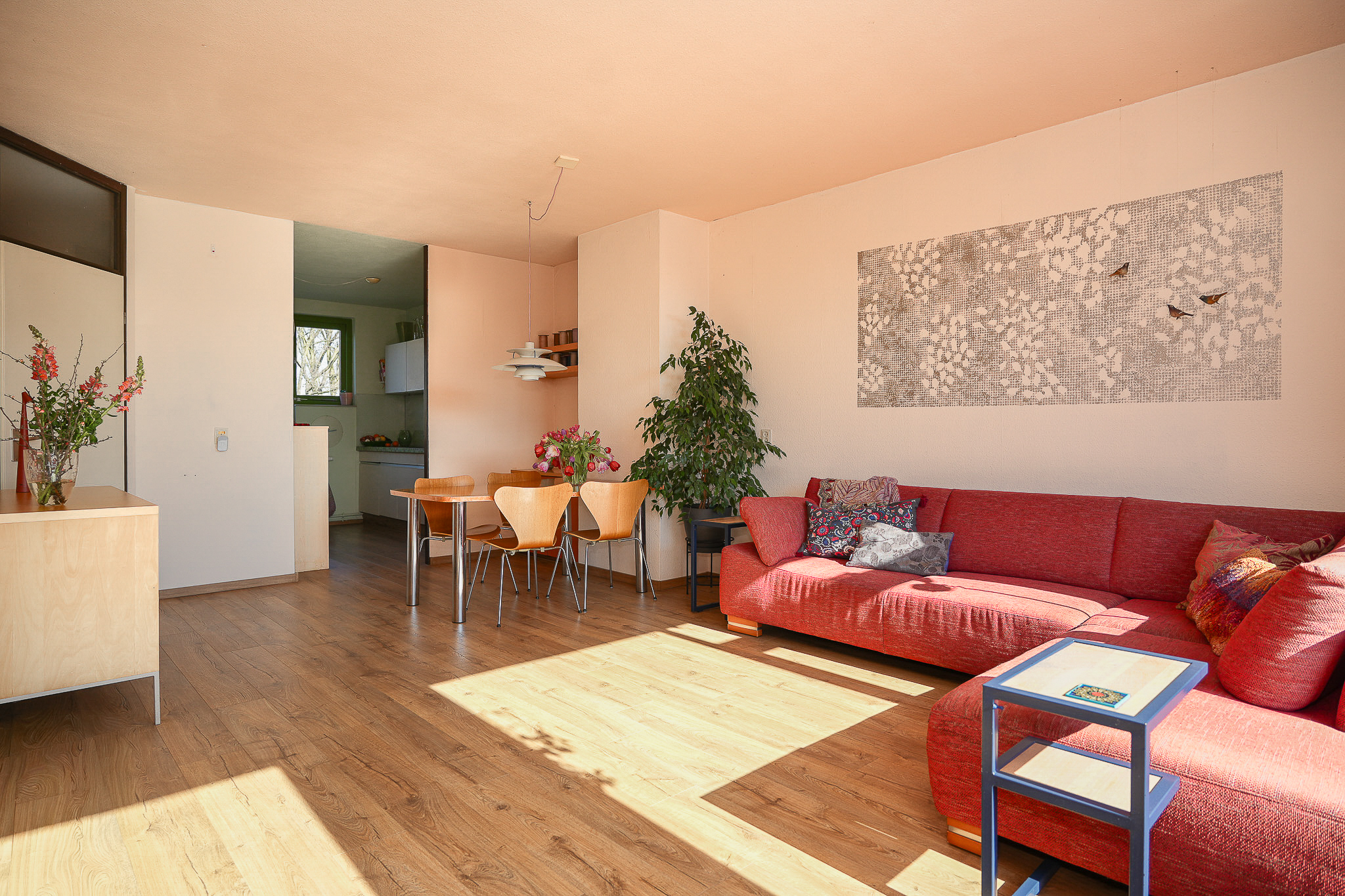 Entree met toilet, garderobekast en trap naar boven. De woonkamer is opvallend licht door de grote raampartijen en biedt een prettige leefruimte met voldoende plek voor een royale eettafel en een comfortabele zithoek.