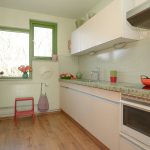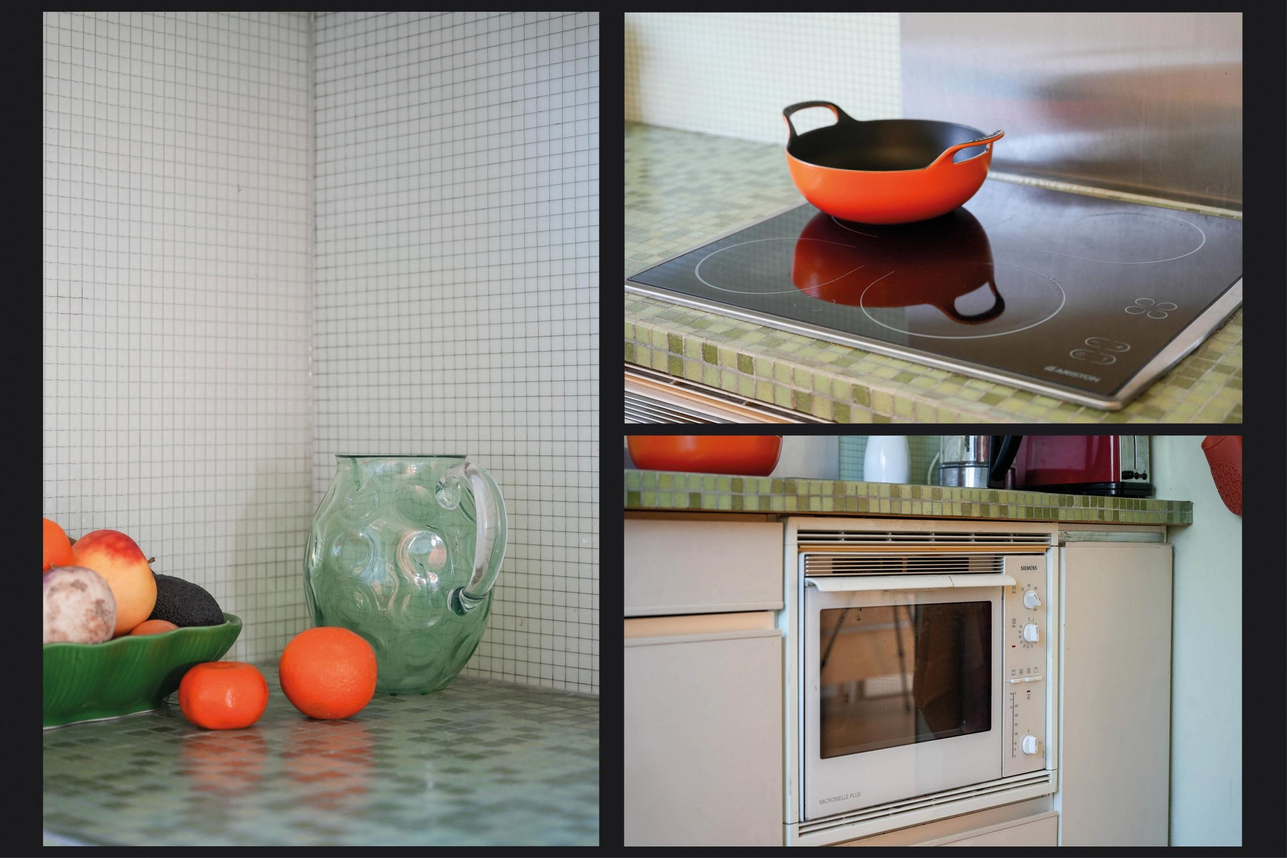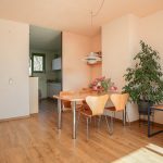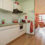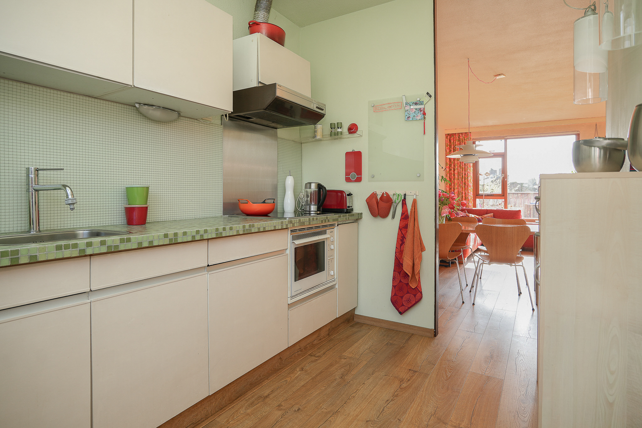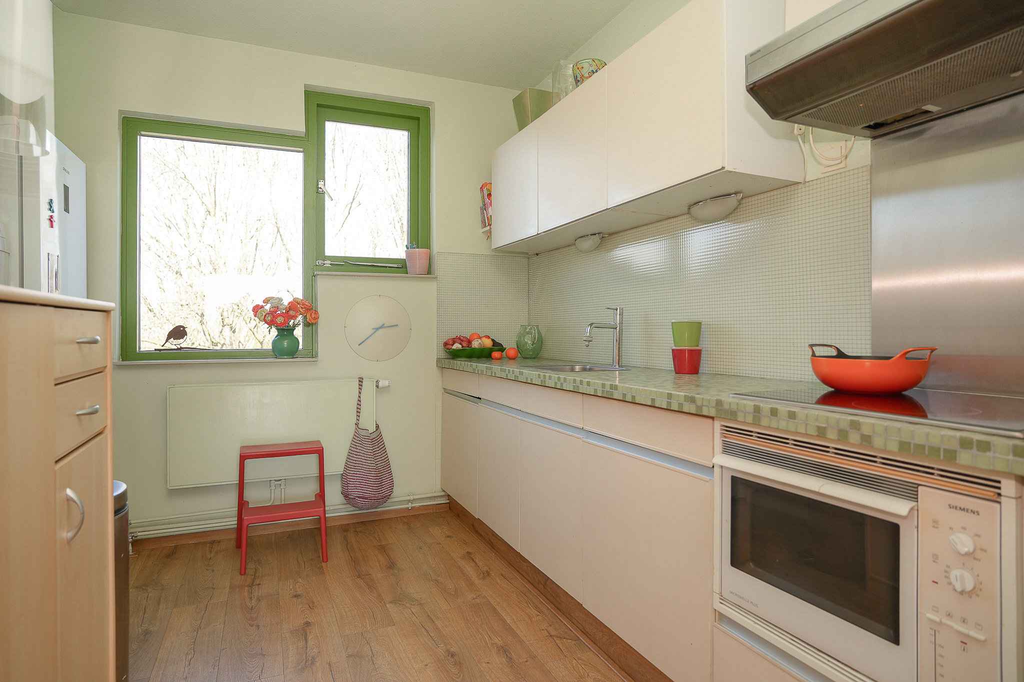 Vanuit de woonkamer stap je direct het zuidwestelijk geörienteerde balkon op. Een zonnige, windluwe plek met groen uitzicht, voorzien van een elektrisch zonnescherm ideaal om al vroeg in het seizoen buiten te zitten. De halfopen keuken aan de voorzijde is functioneel ingericht met een 4-pits elektrische kookplaat en inbouwoven.