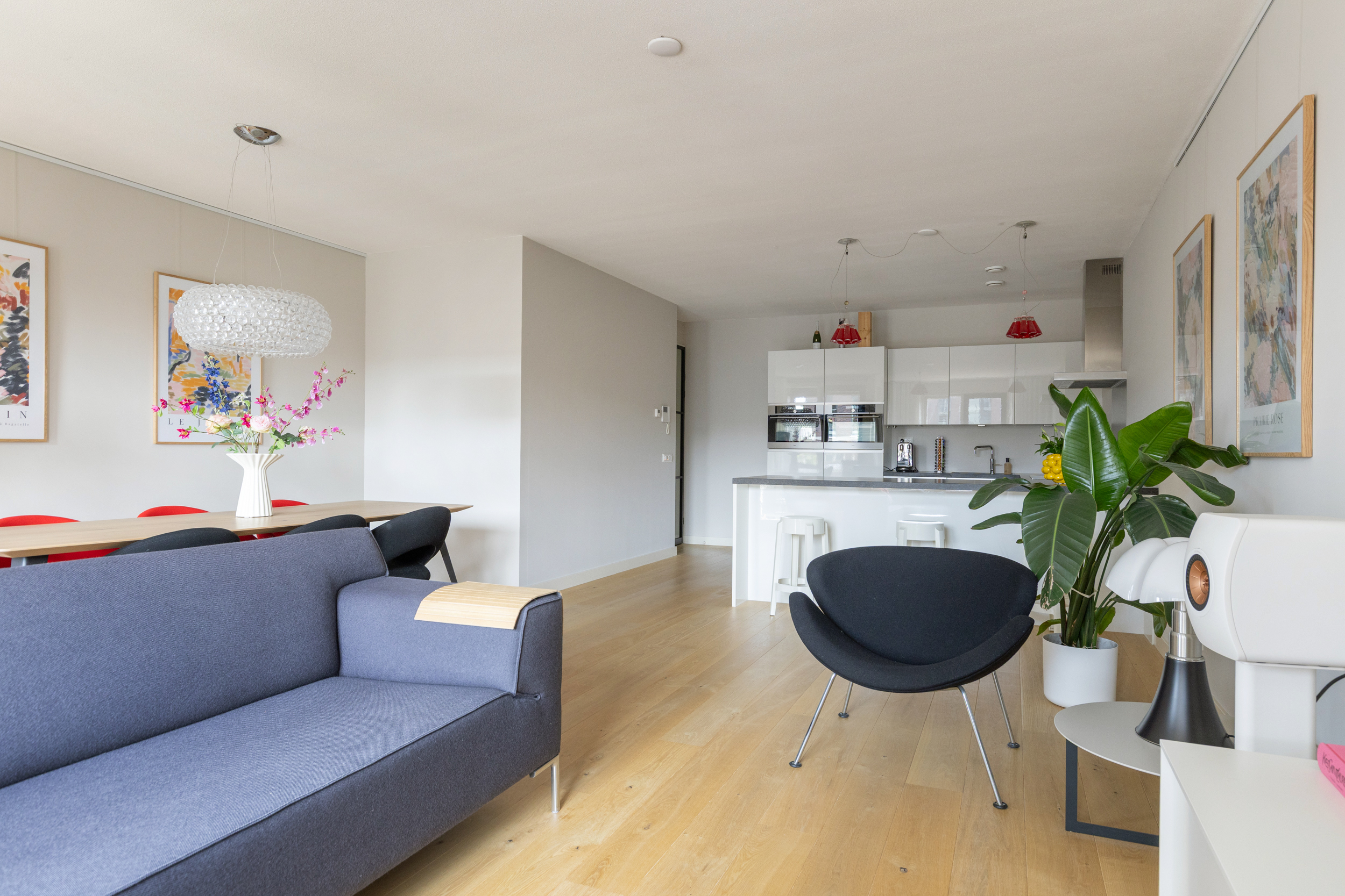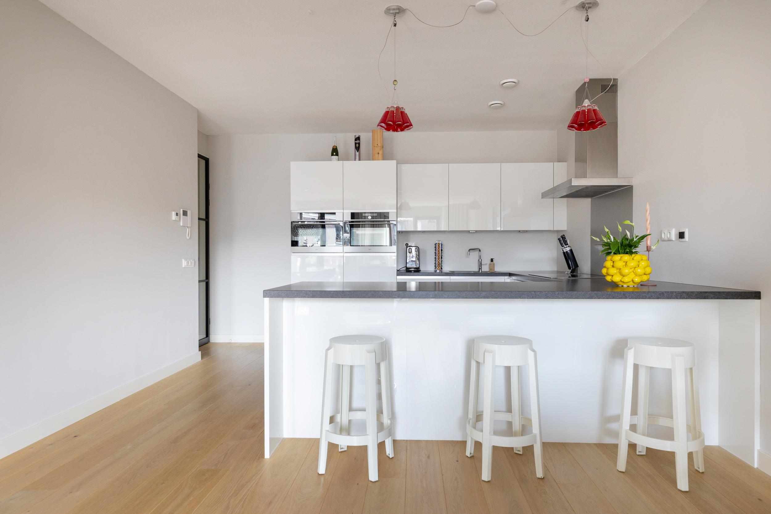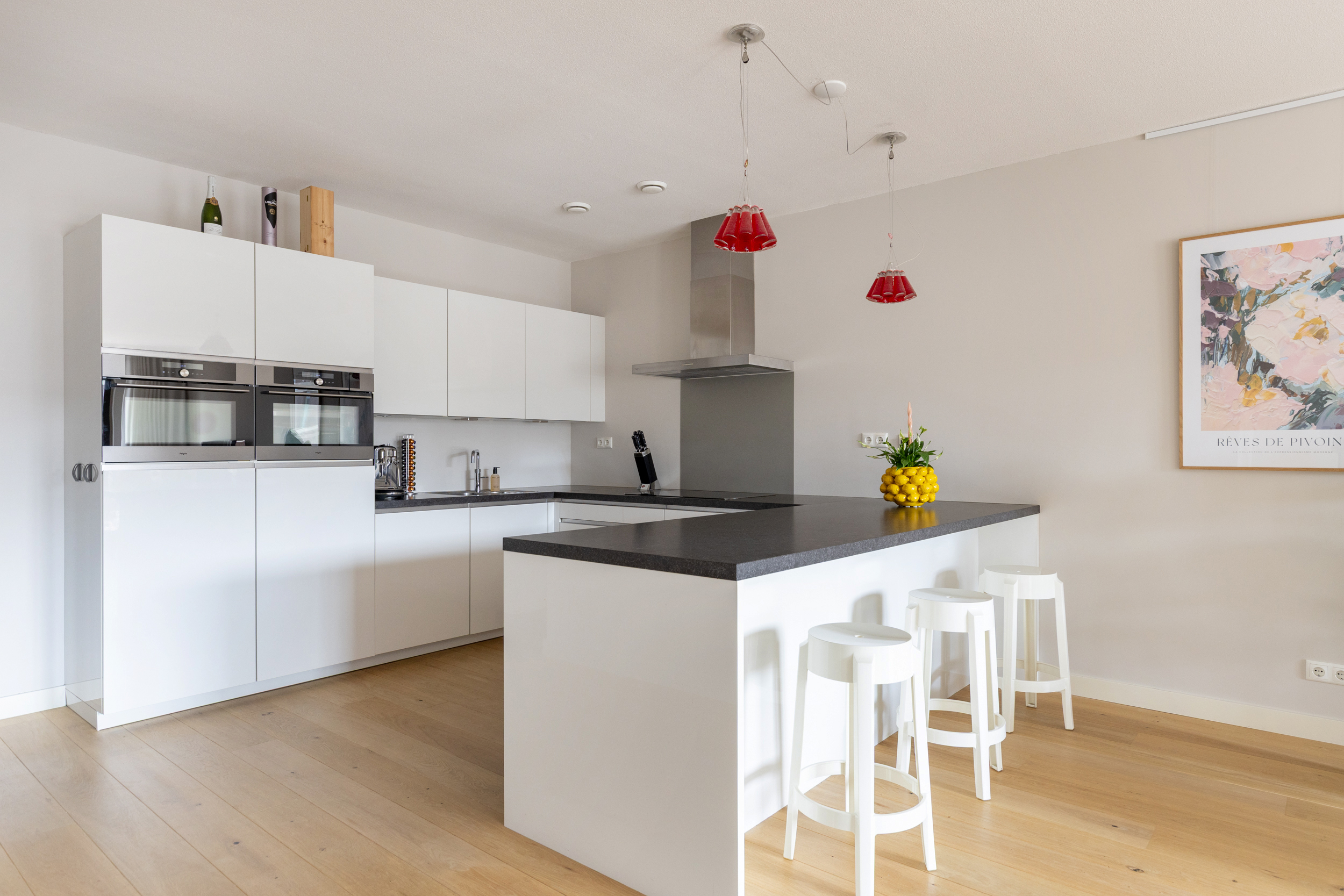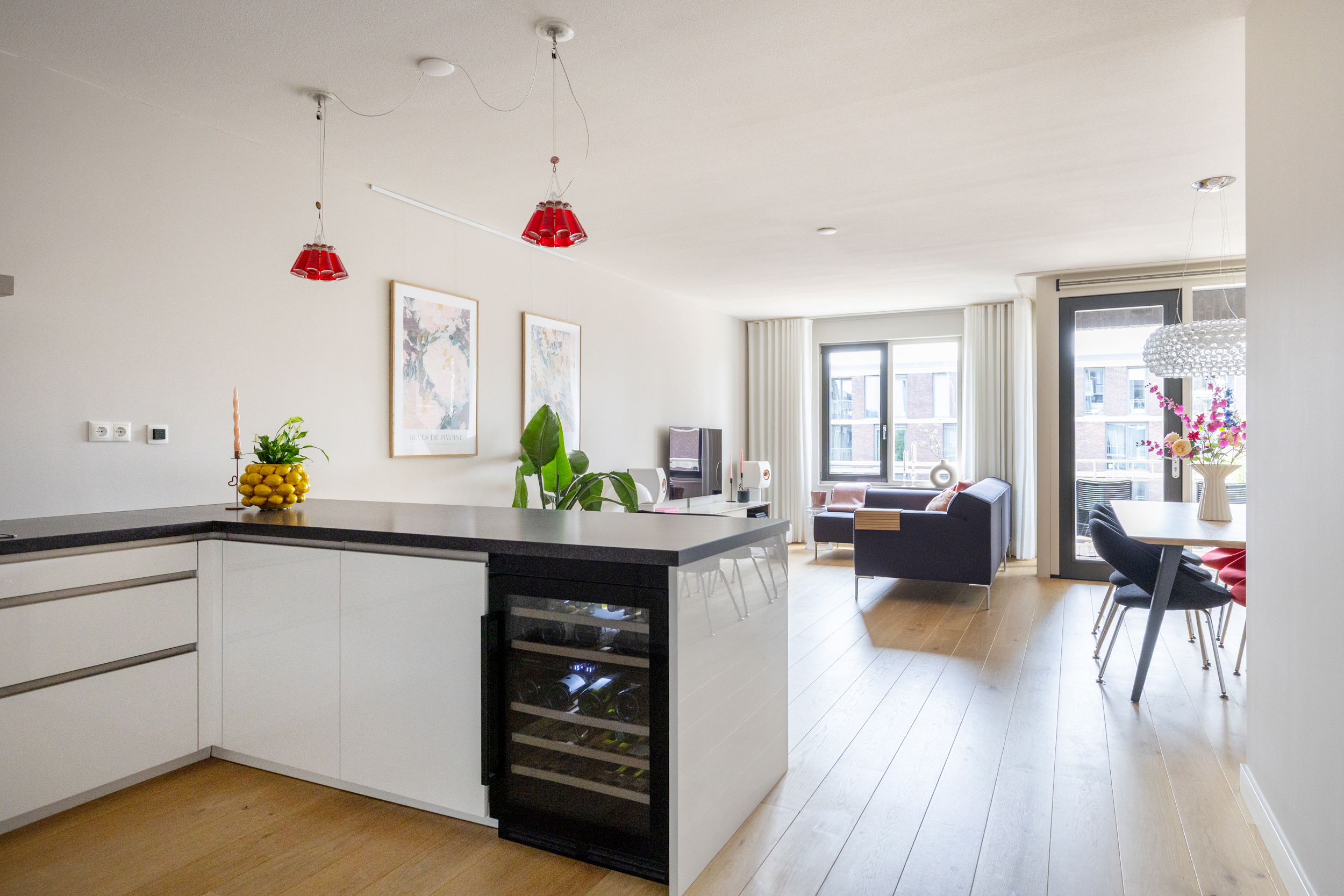 Derde verdieping: via de lift of het trappenhuis kom je op de derde etage. Je komt binnen in een ruime hal die toegang geeft tot alle vertrekken. Op het einde van de hal geeft een zwarte stalen deur toegang tot de ruime keuken- en woonkamer. De woonkamer is een echte eyecatcher: groot, licht en met een open indeling. De luxe en open keuken beschikt over een semi-eiland met eetgedeelte. De keuken is voorzien van moderne inbouwapparatuur waaronder een Quooker, stoomoven, combi-magnetron, twee koelkasten, losse vriezer, grote inductiekookplaat, wijnklimaatkast en veel werk- en bergruimte. De muren zijn gestuct en door het gehele appartement ligt een houten parketvloer die eind 2021 is gelegd.