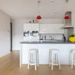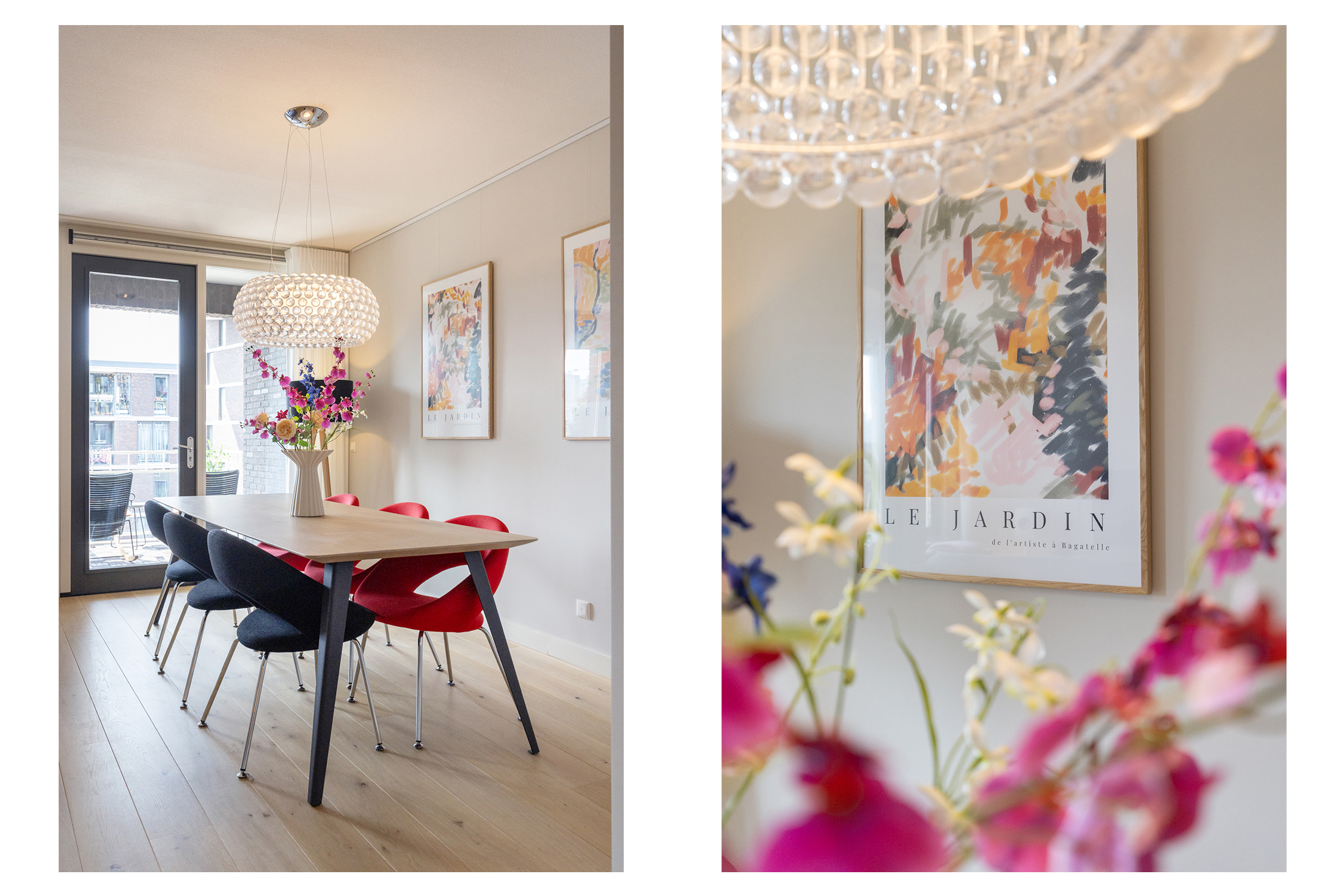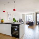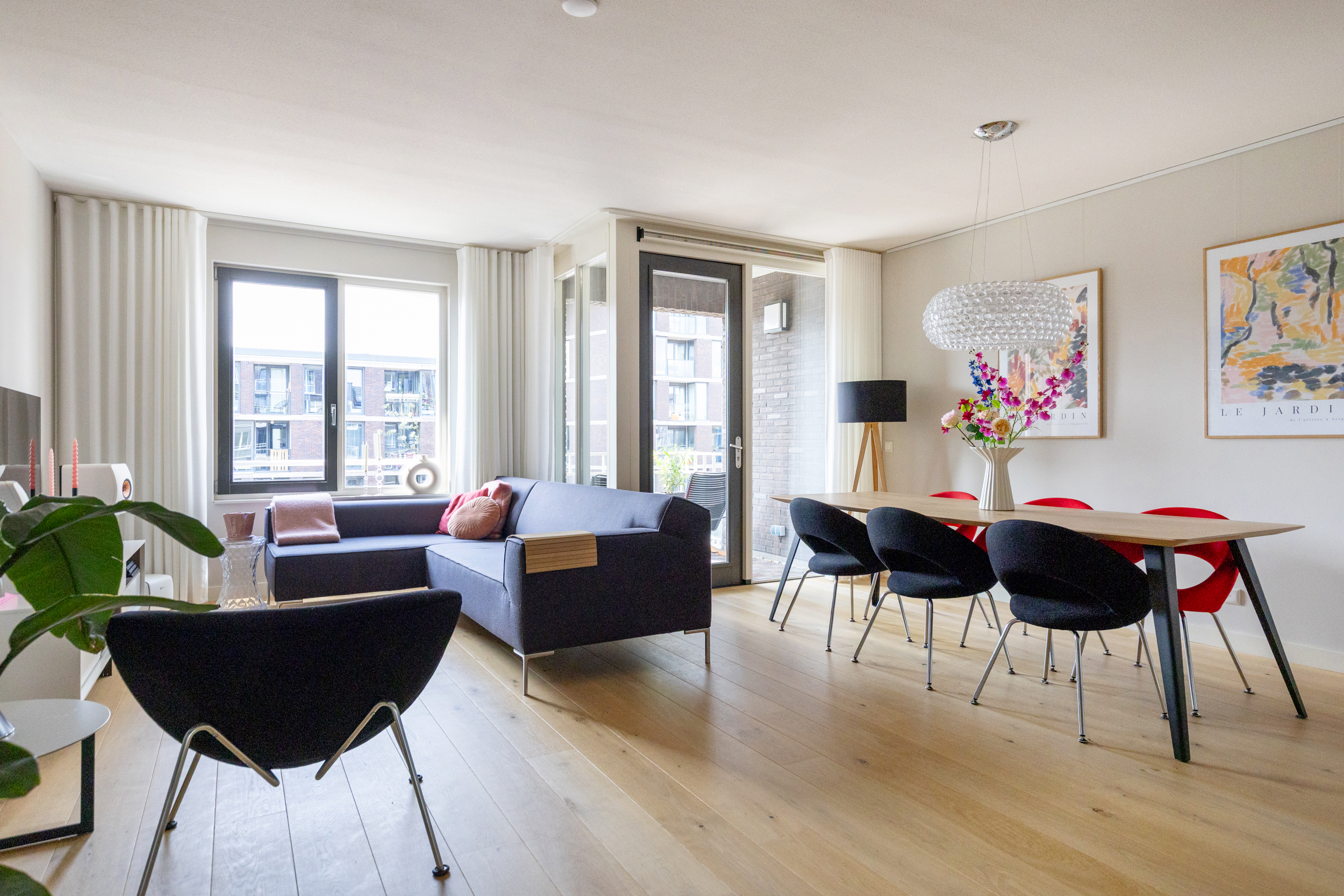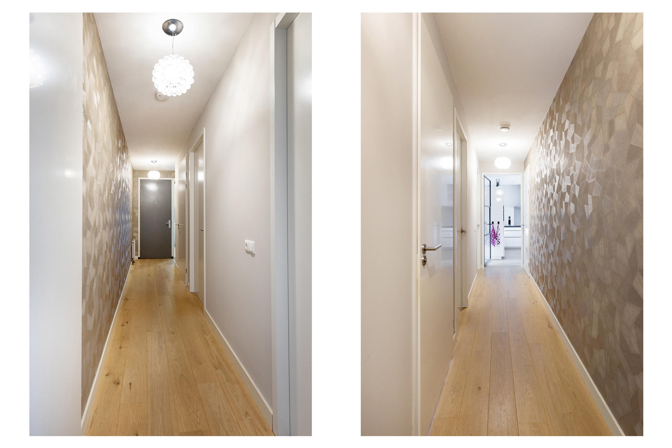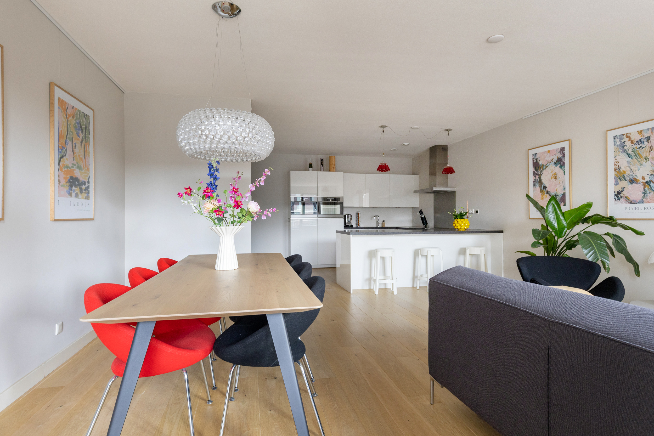 Derde verdieping: via de lift of het trappenhuis kom je op de derde etage. Je komt binnen in een ruime hal die toegang geeft tot alle vertrekken. Op het einde van de hal geeft een zwarte stalen deur toegang tot de ruime keuken- en woonkamer. De woonkamer is een echte eyecatcher: groot, licht en met een open indeling. De luxe en open keuken beschikt over een semi-eiland met eetgedeelte. De keuken is voorzien van moderne inbouwapparatuur waaronder een Quooker, stoomoven, combi-magnetron, twee koelkasten, losse vriezer, grote inductiekookplaat, wijnklimaatkast en veel werk- en bergruimte. De muren zijn gestuct en door het gehele appartement ligt een houten parketvloer die eind 2021 is gelegd.