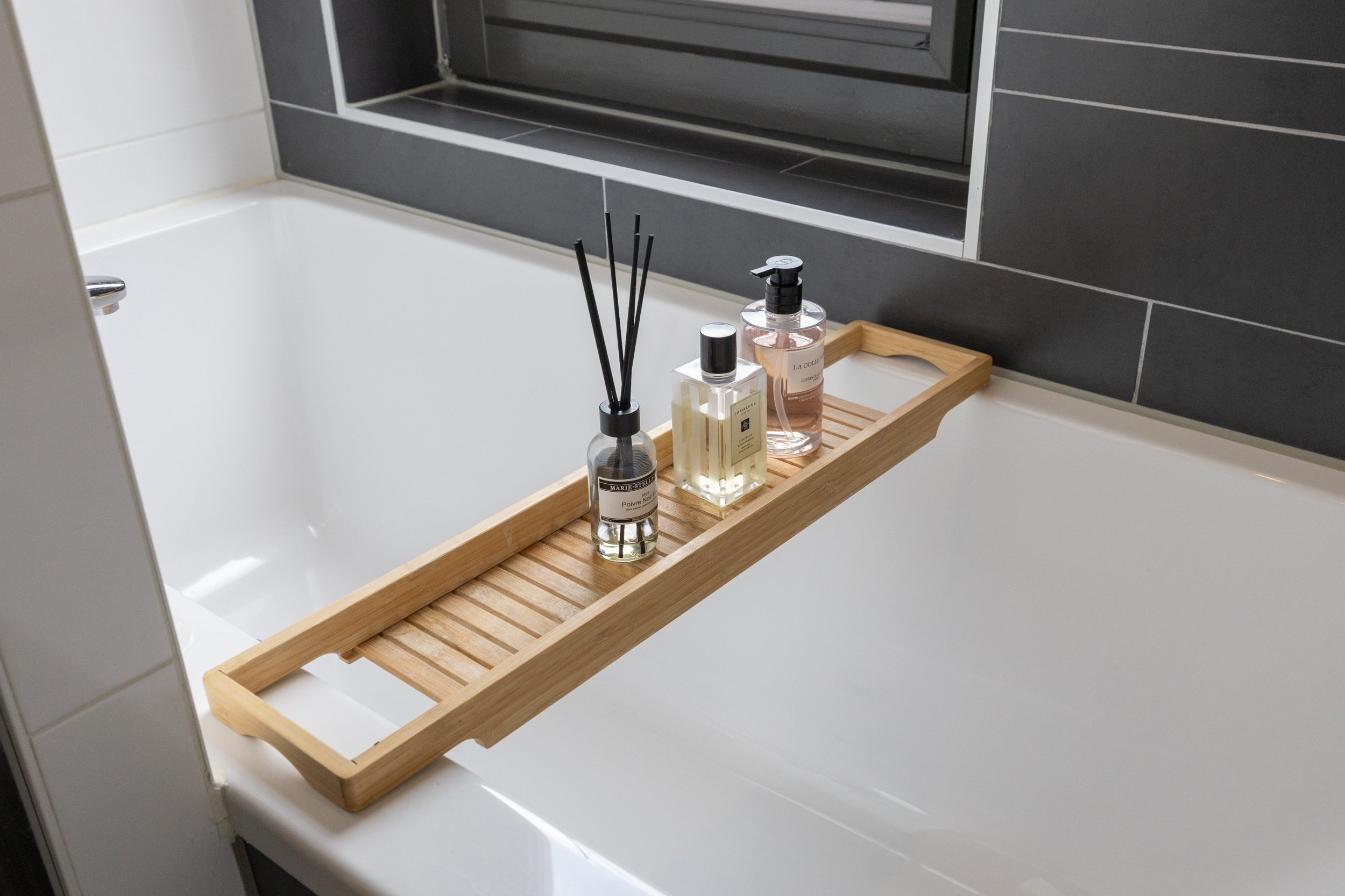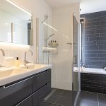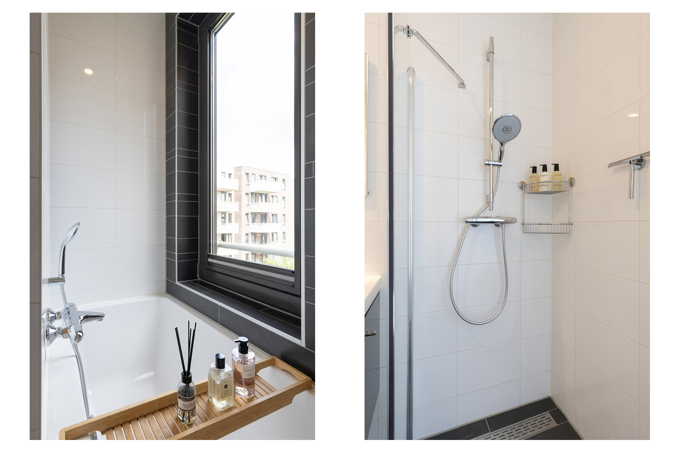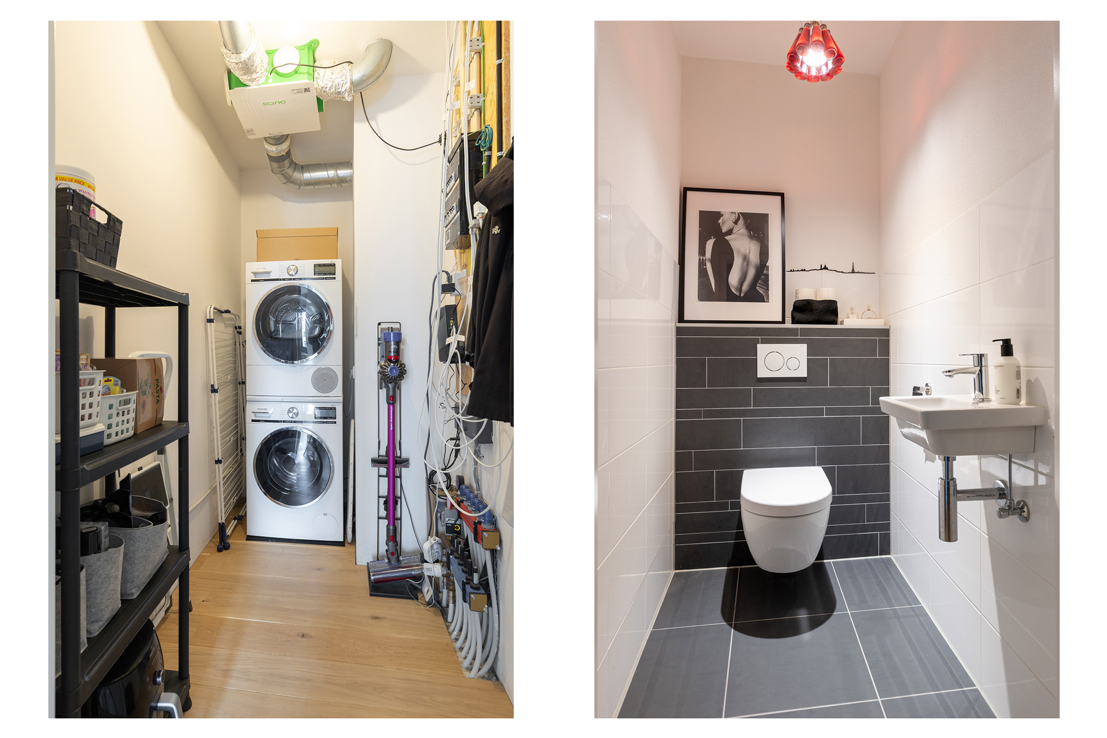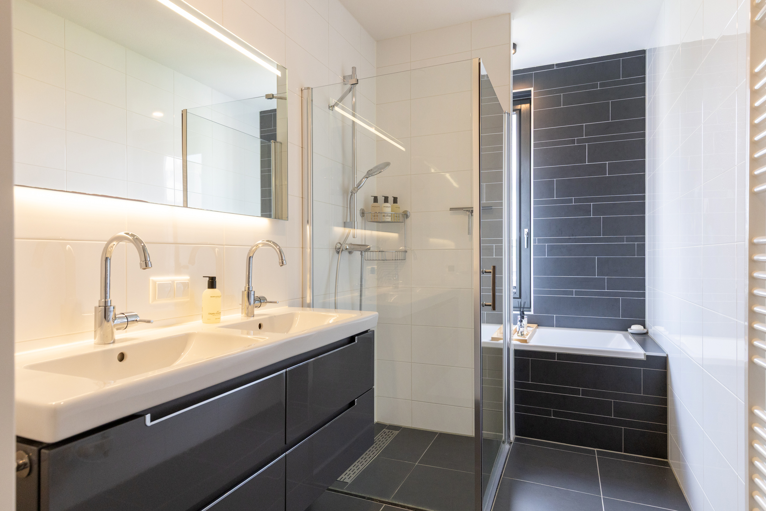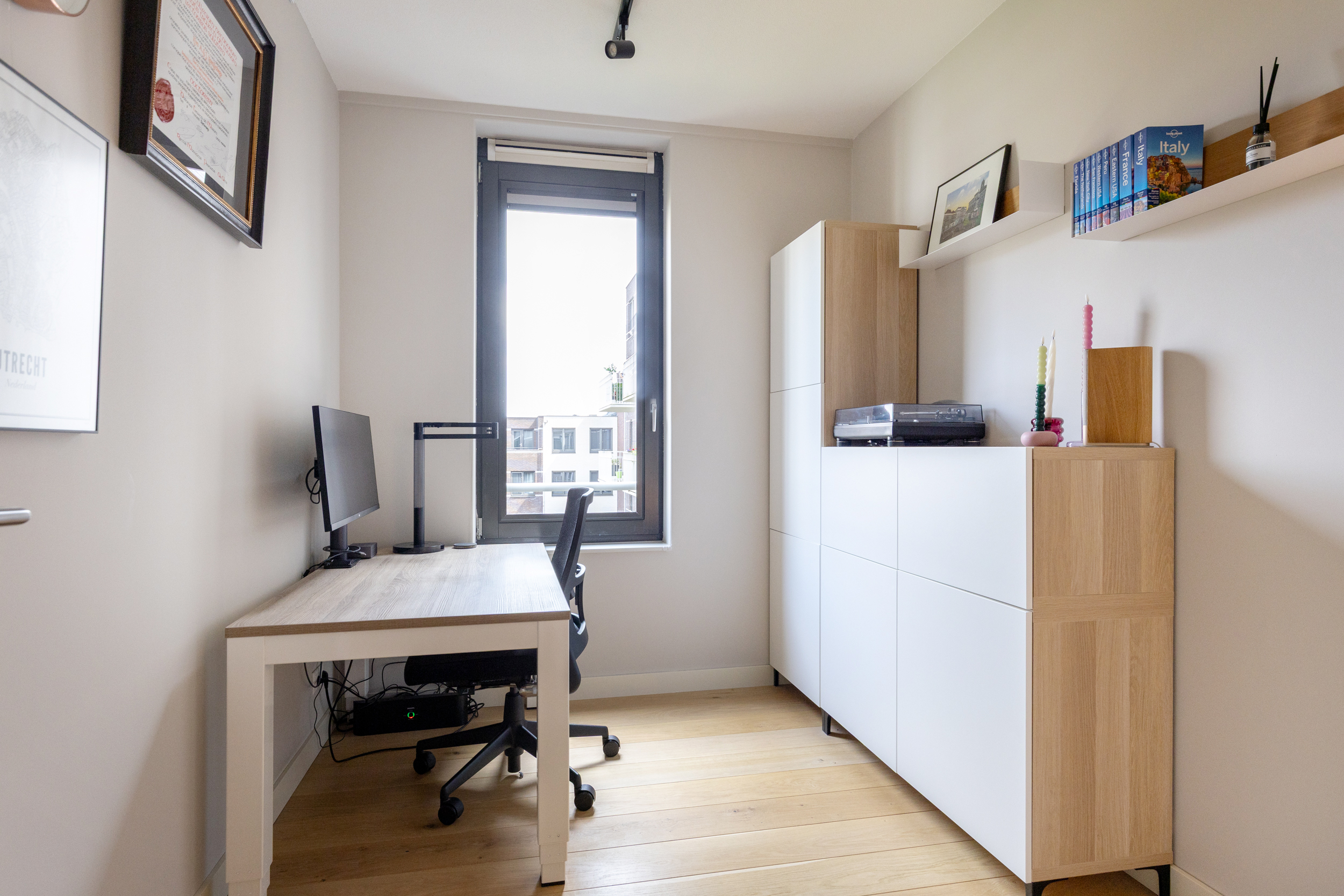 Aan de achterzijde bevinden zich twee slaapkamers (potentieel voor drie slaapkamers), waarvan één momenteel als werkkamer is ingericht. De badkamer is modern uitgevoerd met een ligbad, inloopdouche, dubbele wastafel met daarboven een verlichte en verwarmde spiegel en strak tegelwerk. Daarnaast is er een apart toilet en een praktische inpandige berging met wasmachineaansluiting.