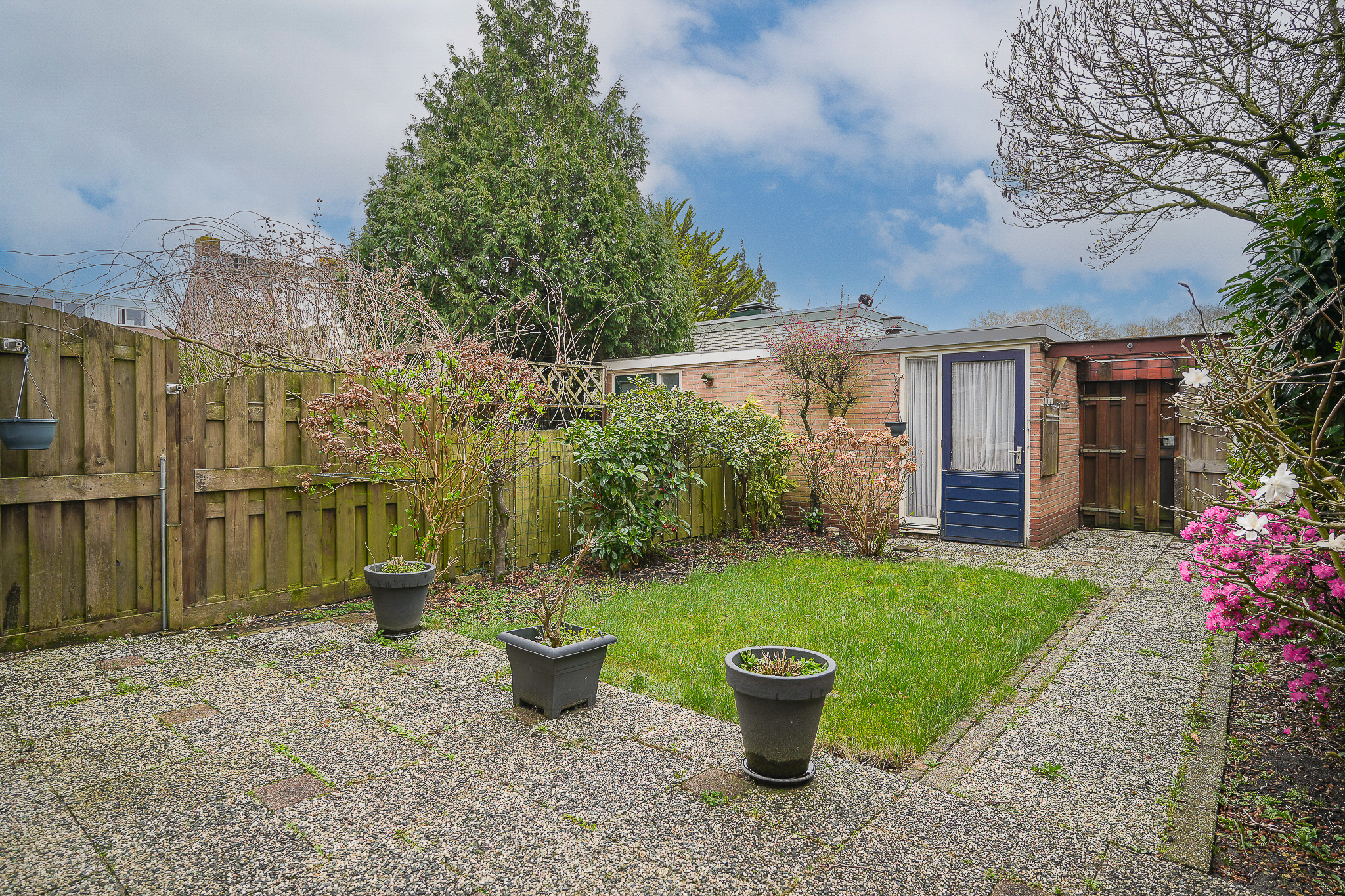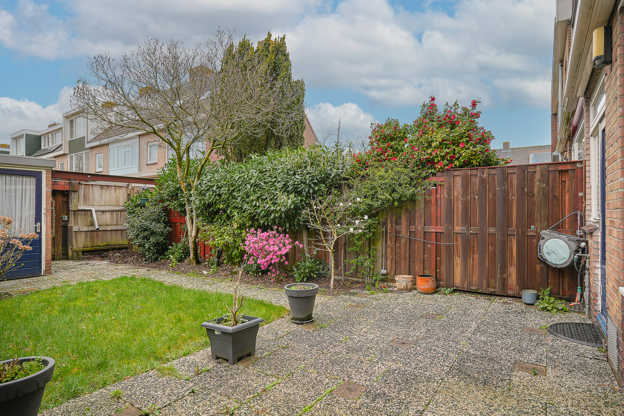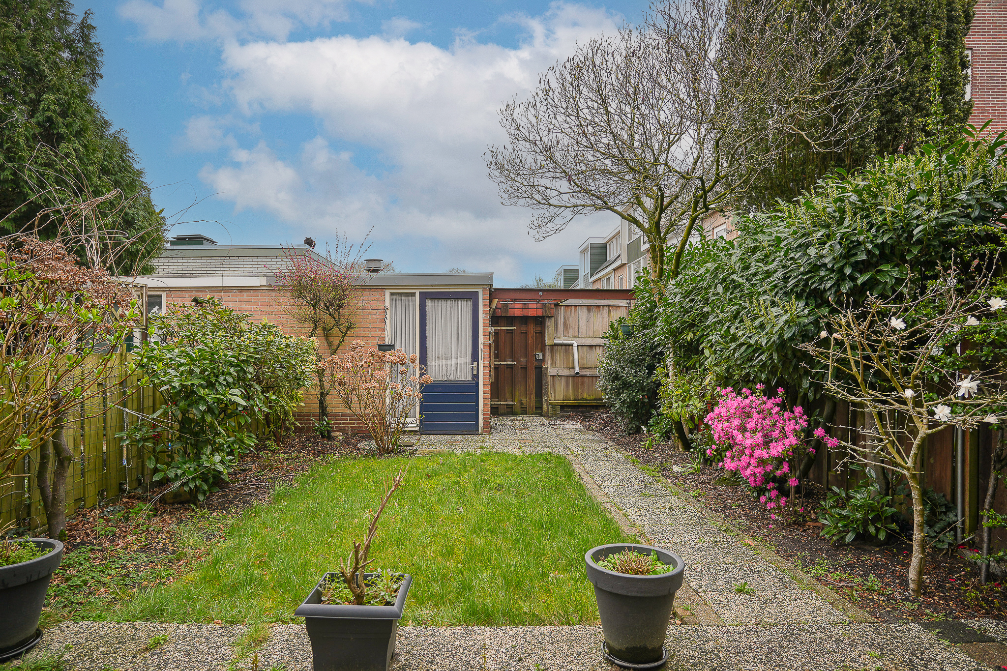 De achtertuin ligt op het zonnige zuidwesten, waardoor je hier heerlijk kunt genieten van de middag en avondzon. Met een zonnescherm creëer je eenvoudig een fijne schaduwplek op warme dagen. Achterin de tuin staat een stenen berging en dankzij de achterom is de tuin ook praktisch in gebruik.