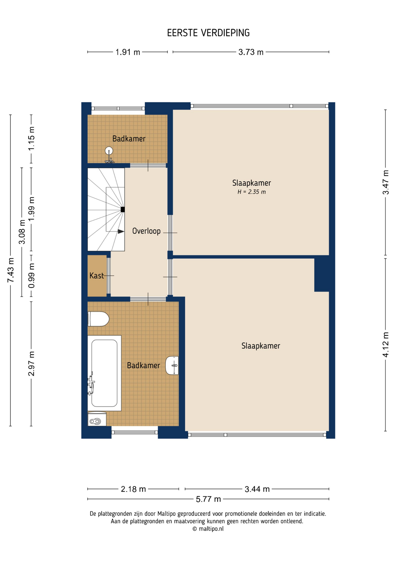 Op de eerste verdieping bevinden zich twee ruime en lichte slaapkamers. De badkamer aan de achterzijde is compleet ingericht met een ligbad, toilet en wastafel. Ook vind je hier de cv opstelling en de aansluiting voor wasmachine aansluiting. Aan de voorzijde is een tweede badkamer aanwezig met een douche, wat zorgt voor extra comfort in het dagelijks gebruik.