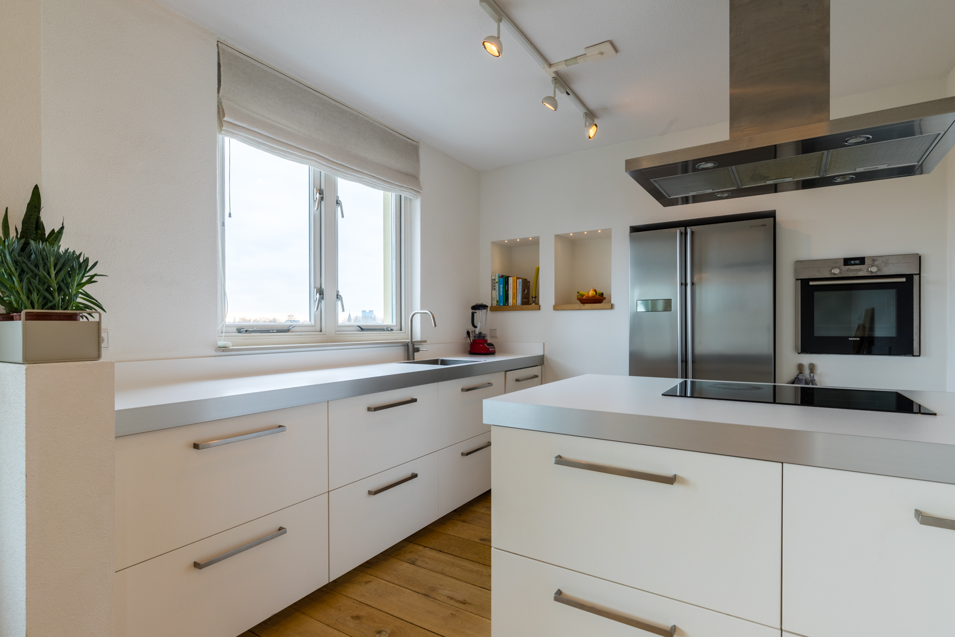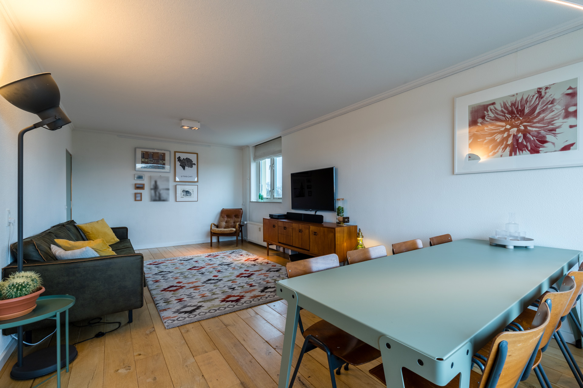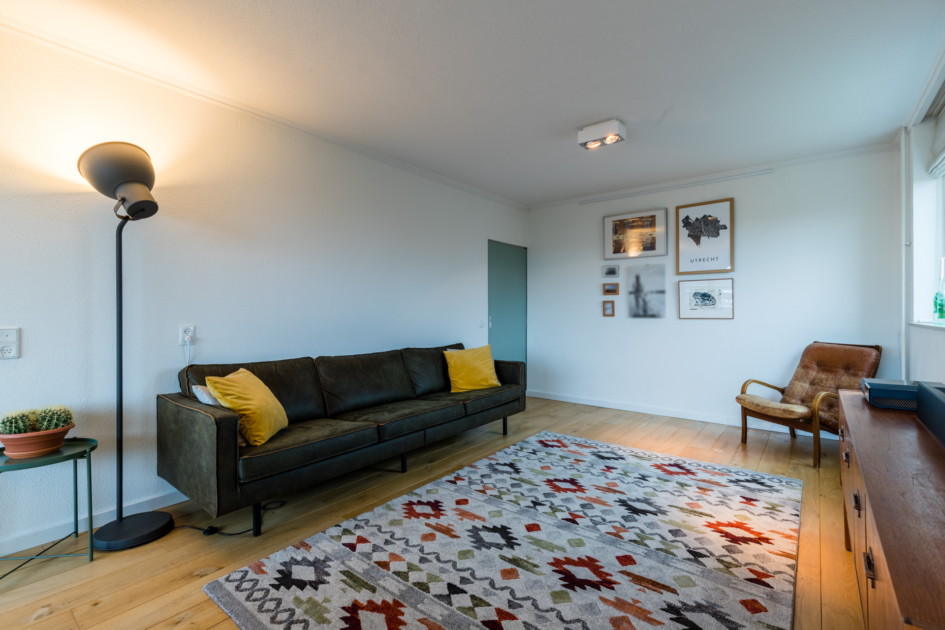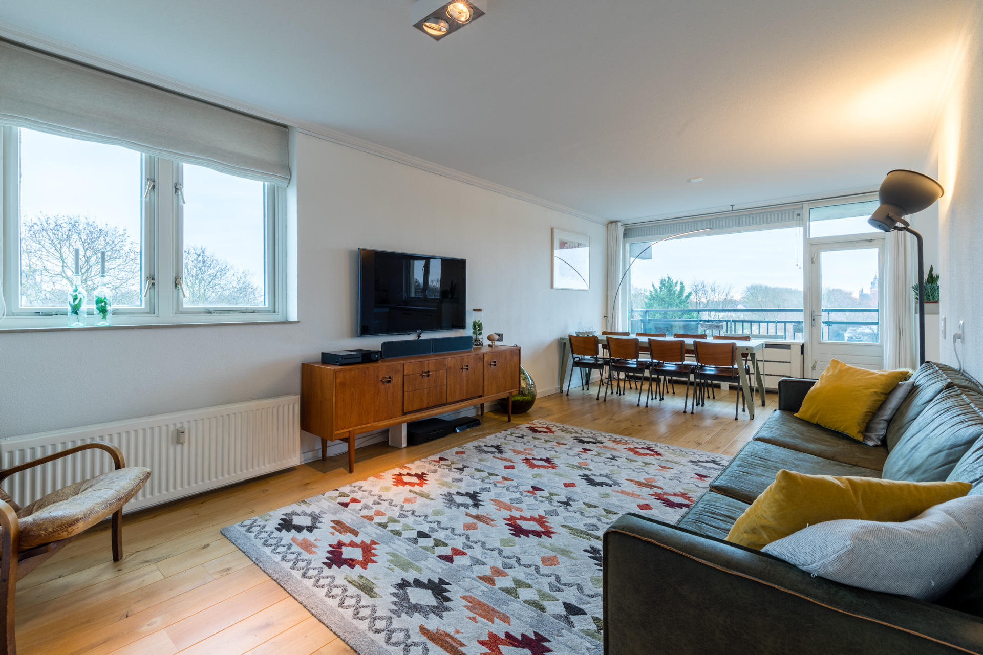 De woonkamer is licht en ruim en vormt een fijne plek om te ontspannen of gezellig samen te zijn. Dankzij de grote raampartijen en de hoekligging voelt de ruimte extra open en prettig aan. Vanuit de woonkamer loop je zo het balkon op het zuiden op. Hier geniet je van de zon en een vrij uitzicht over de omgeving en in de verte de domtoren!