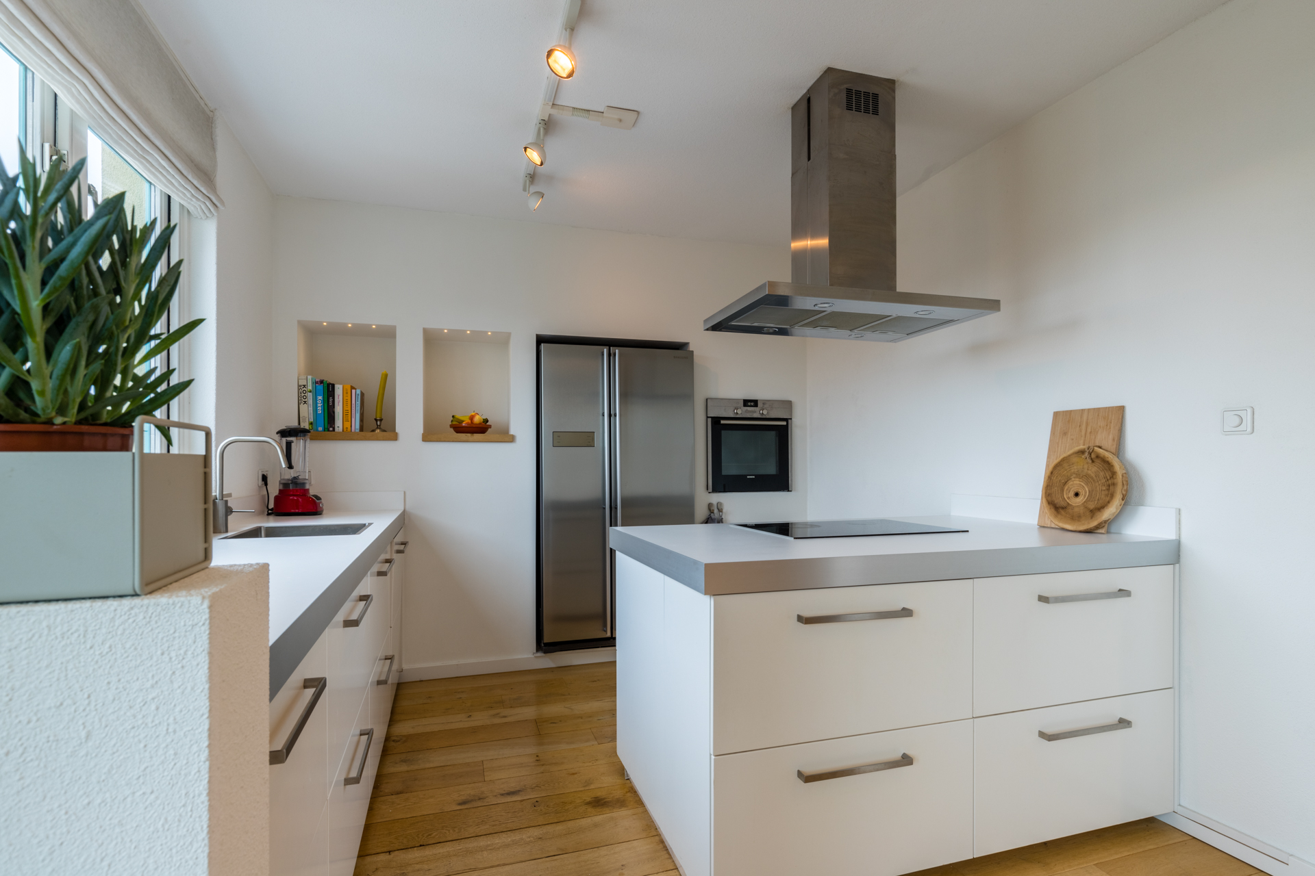 De keuken is modern en praktisch ingericht met een kookeiland en veel werkruimte. Hier kook je met gemak je favoriete gerechten terwijl je in contact blijft met de woonkamer. De keuken is voorzien van diverse apparatuur, waaronder een inductiekookplaat met afzuigkap, een oven en een ruime Amerikaanse koelkast.