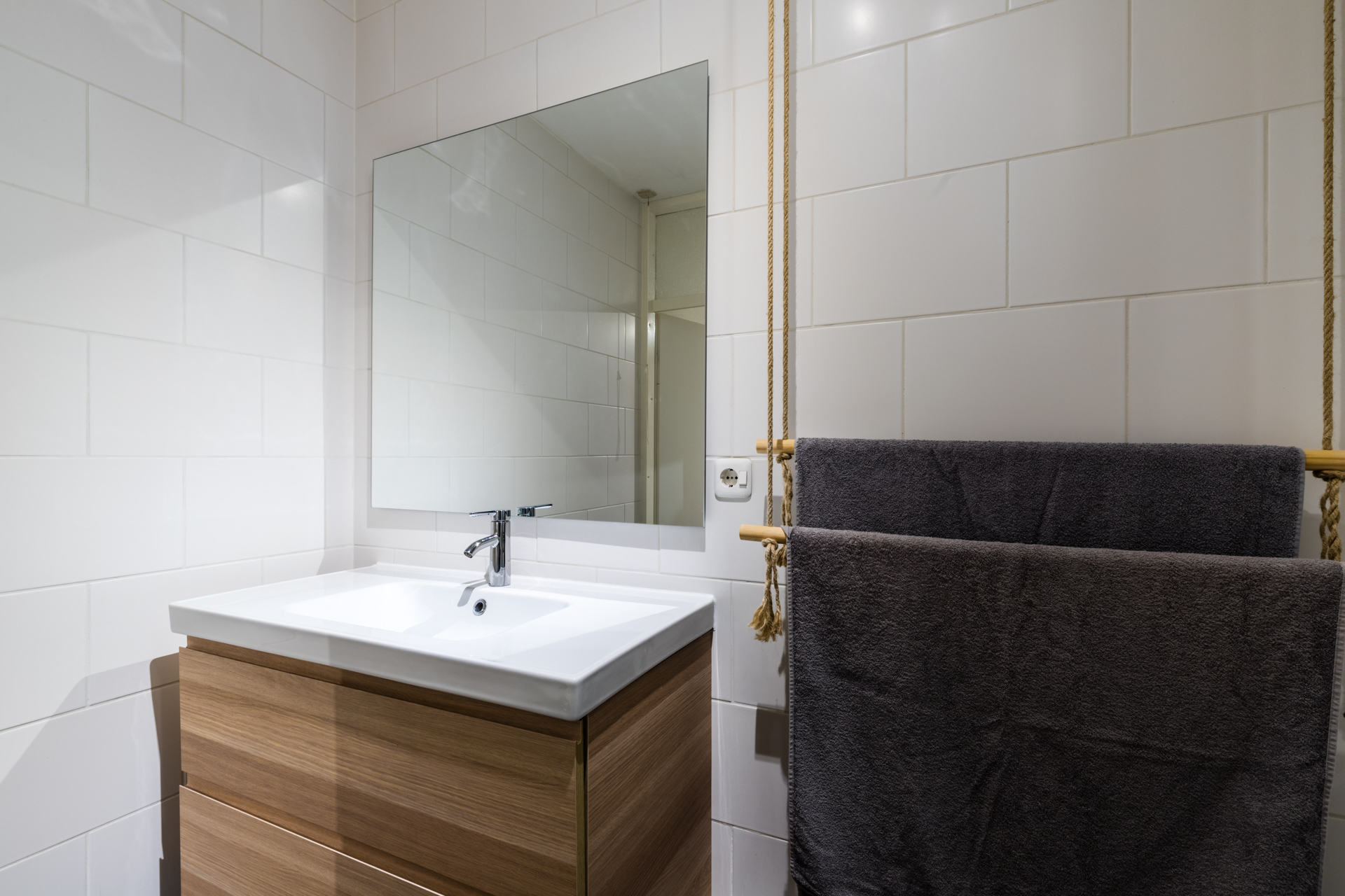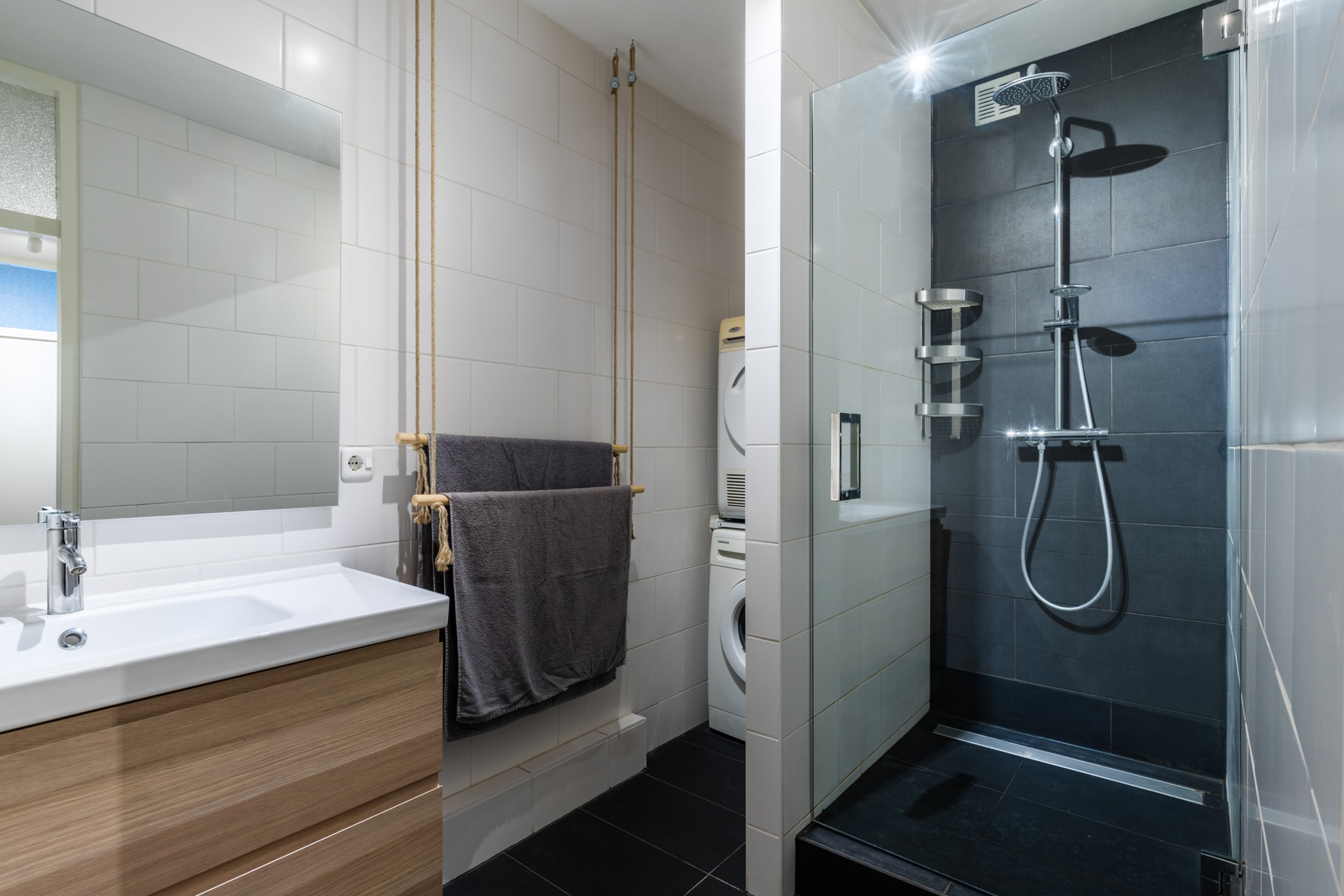 De badkamer is netjes afgewerkt en voorzien van een douche, een wastafelmeubel en aansluitingen voor zowel een wasmachine als een droger.