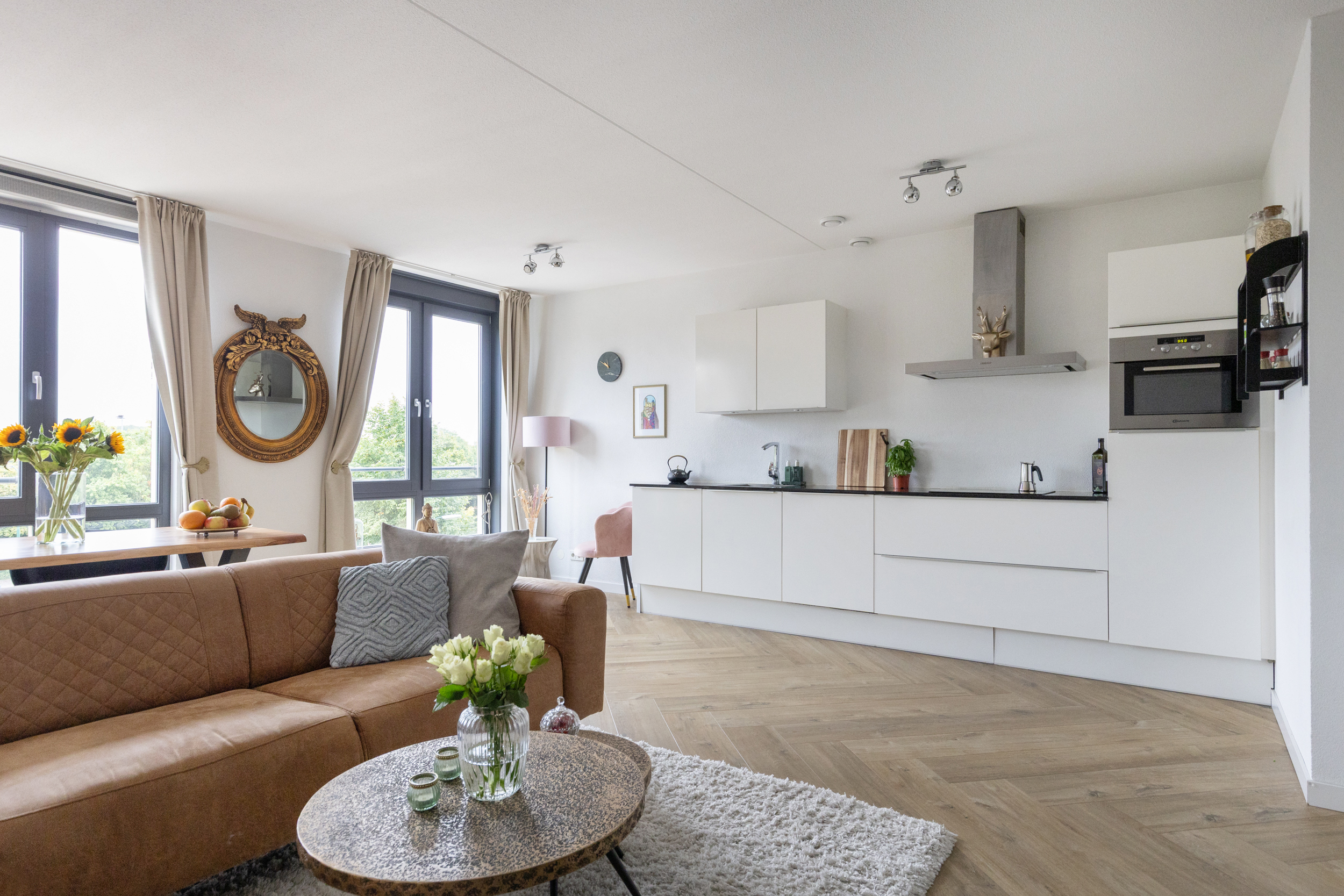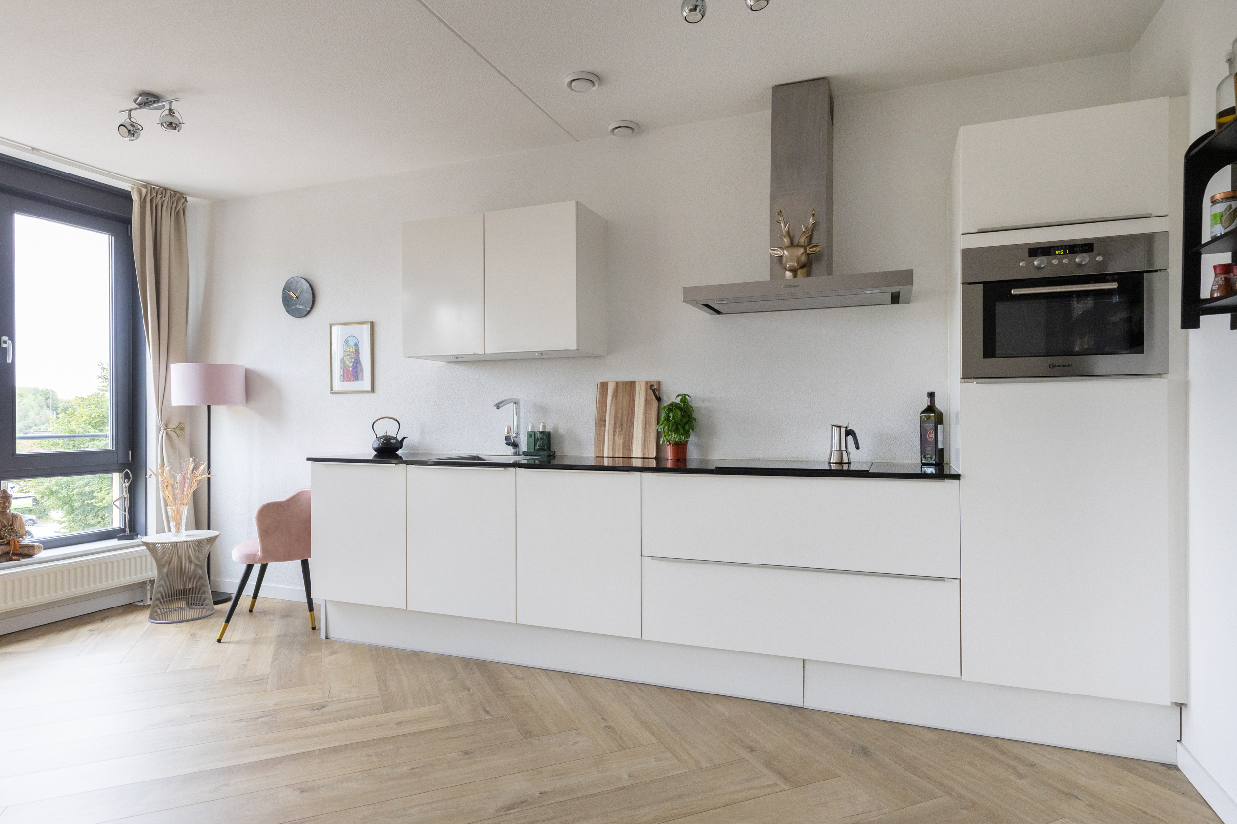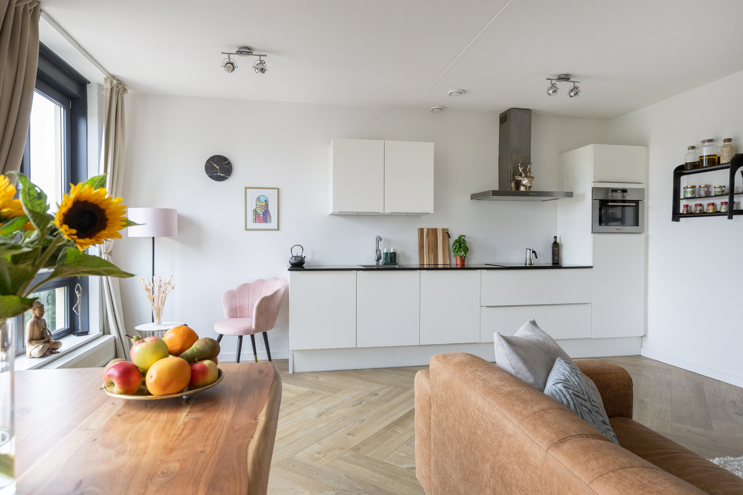De woonkamer is heerlijk licht dankzij de grote raampartijen aan de voorzijde en biedt een vrij en groen uitzicht. Met voldoende ruimte voor een royale zithoek en eettafel is dit een fijne plek om thuis te komen. De open keuken sluit hier naadloos op aan en is uitgerust met een modern wit keukenblok, inductiekookplaat, RVS-afzuigkap, combimagnetron, koel-vriescombinatie en de vaatwasser. Samen vormen de woonkamer en keuken een royale leefruimte van circa 30 m².