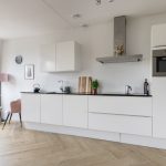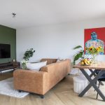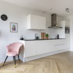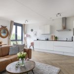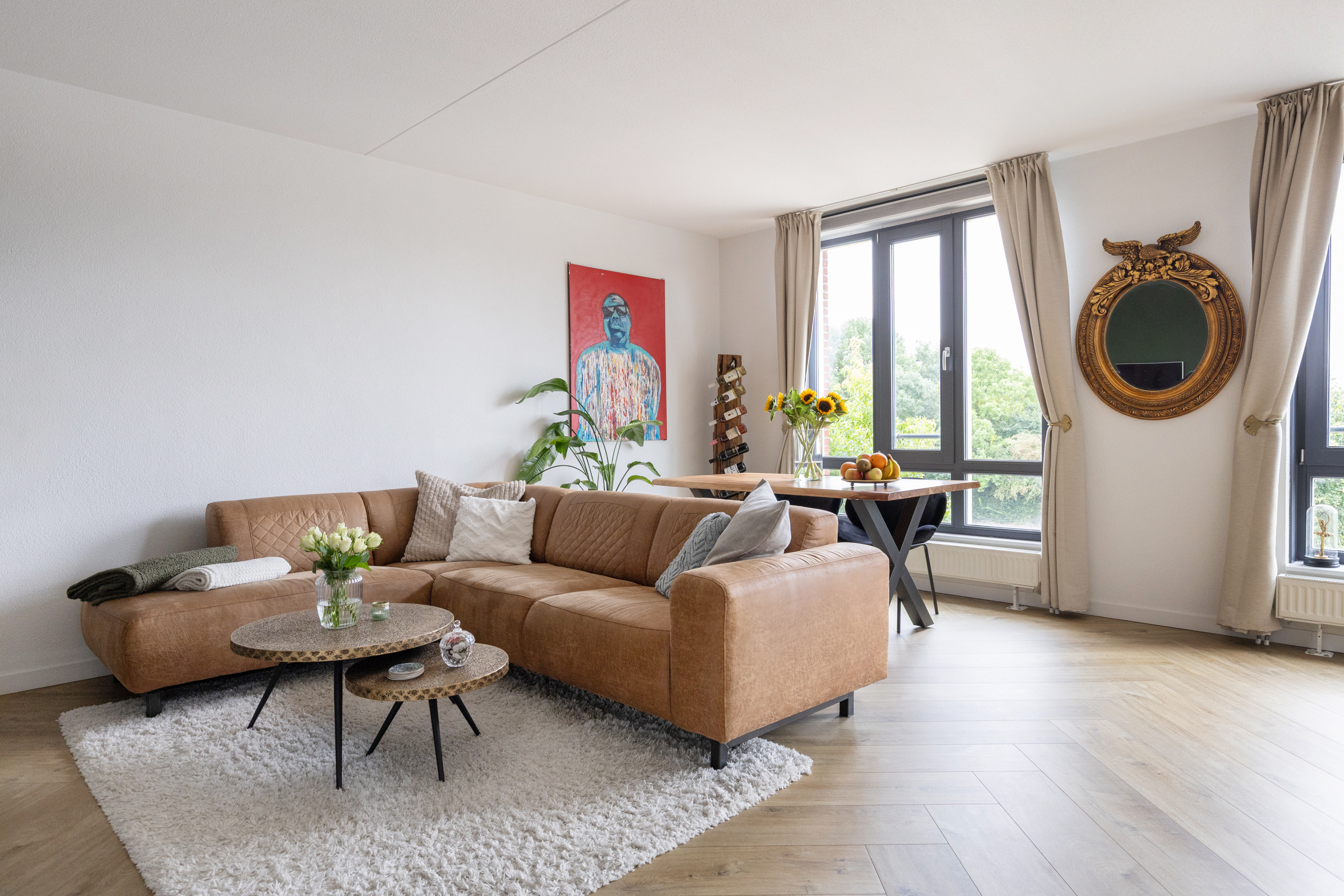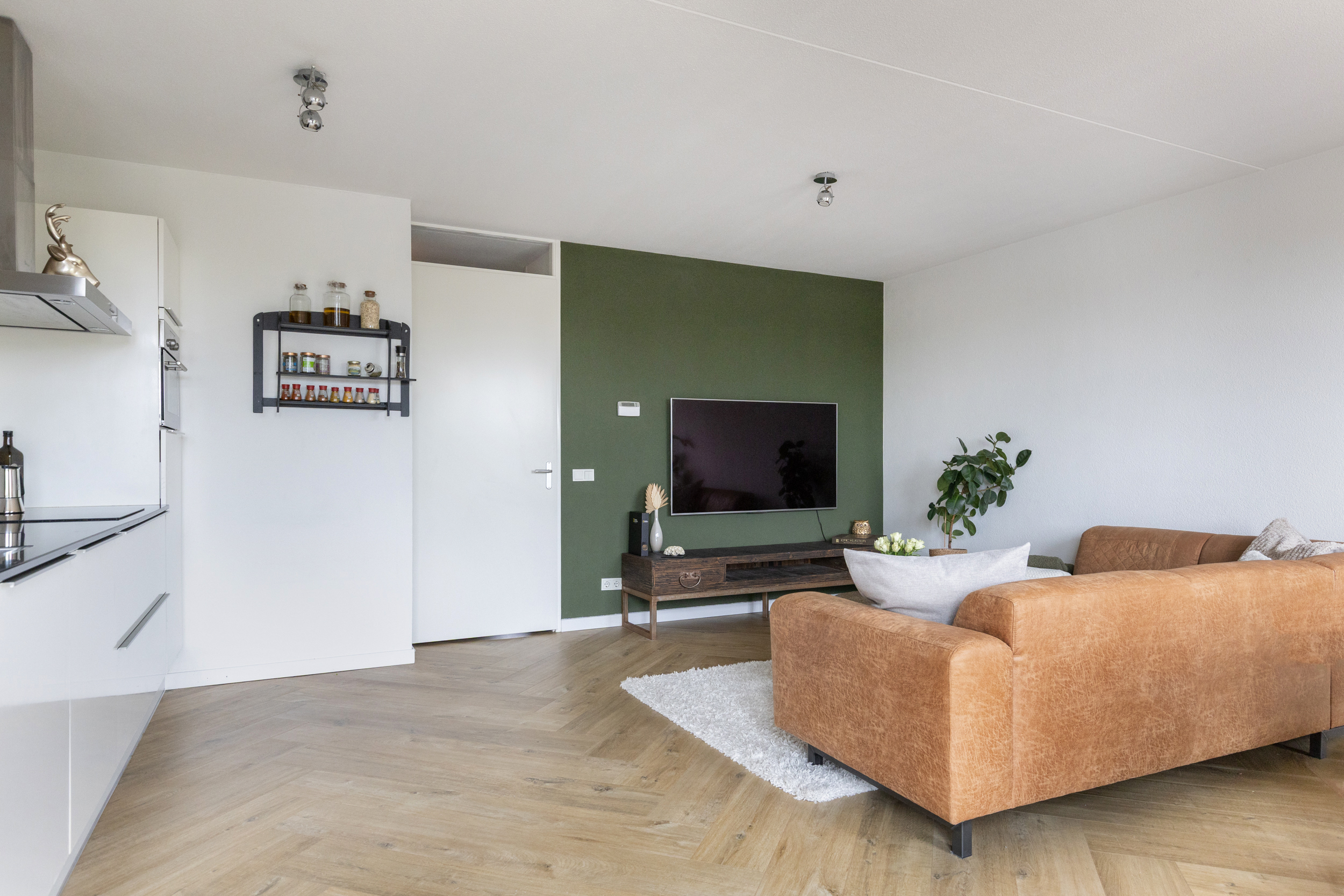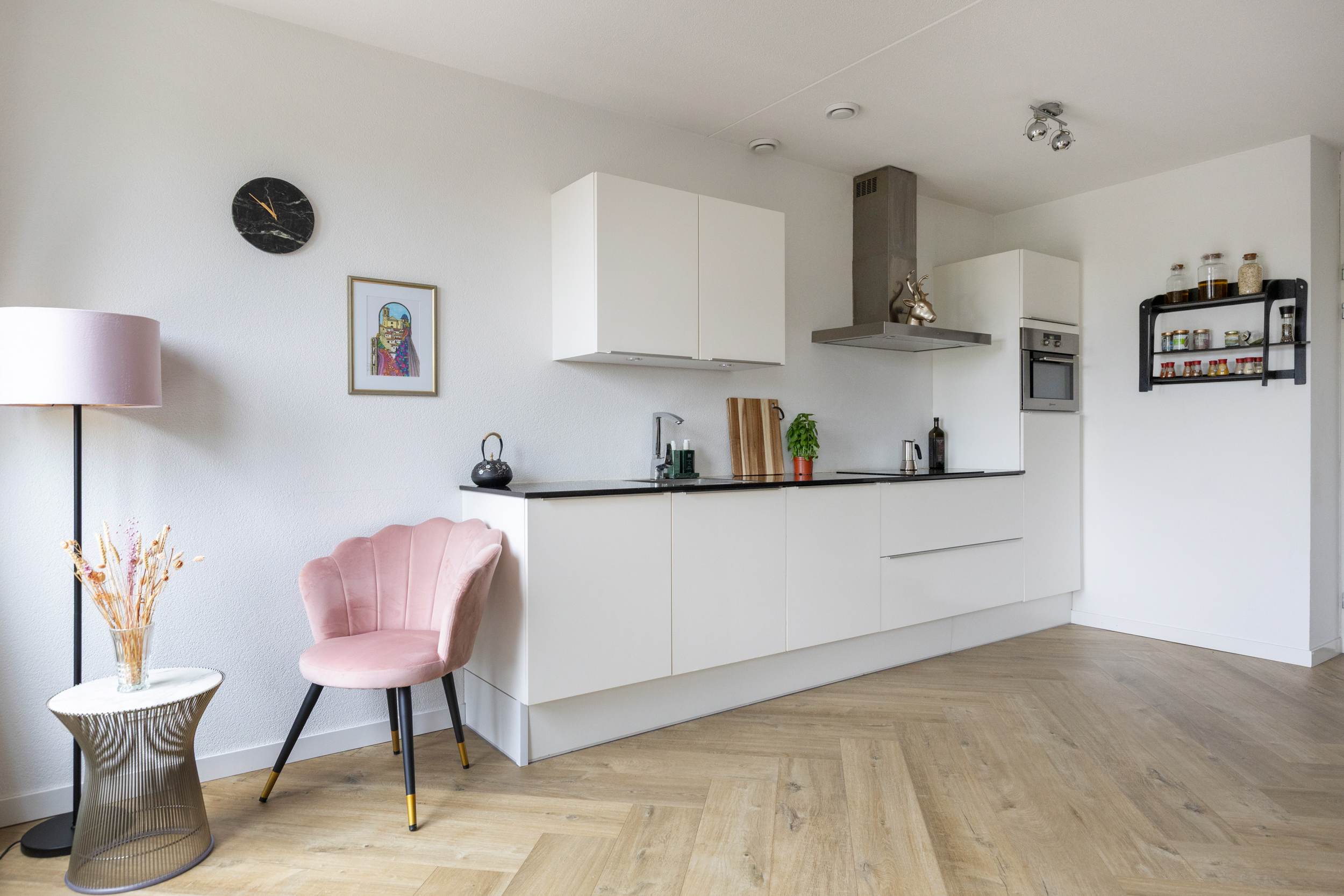 De woonkamer is heerlijk licht dankzij de grote raampartijen aan de voorzijde en biedt een vrij en groen uitzicht. Met voldoende ruimte voor een royale zithoek en eettafel is dit een fijne plek om thuis te komen. De open keuken sluit hier naadloos op aan en is uitgerust met een modern wit keukenblok, inductiekookplaat, RVS-afzuigkap, combimagnetron, koel-vriescombinatie en de vaatwasser. Samen vormen de woonkamer en keuken een royale leefruimte van circa 30 m².