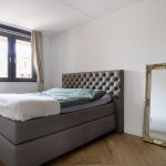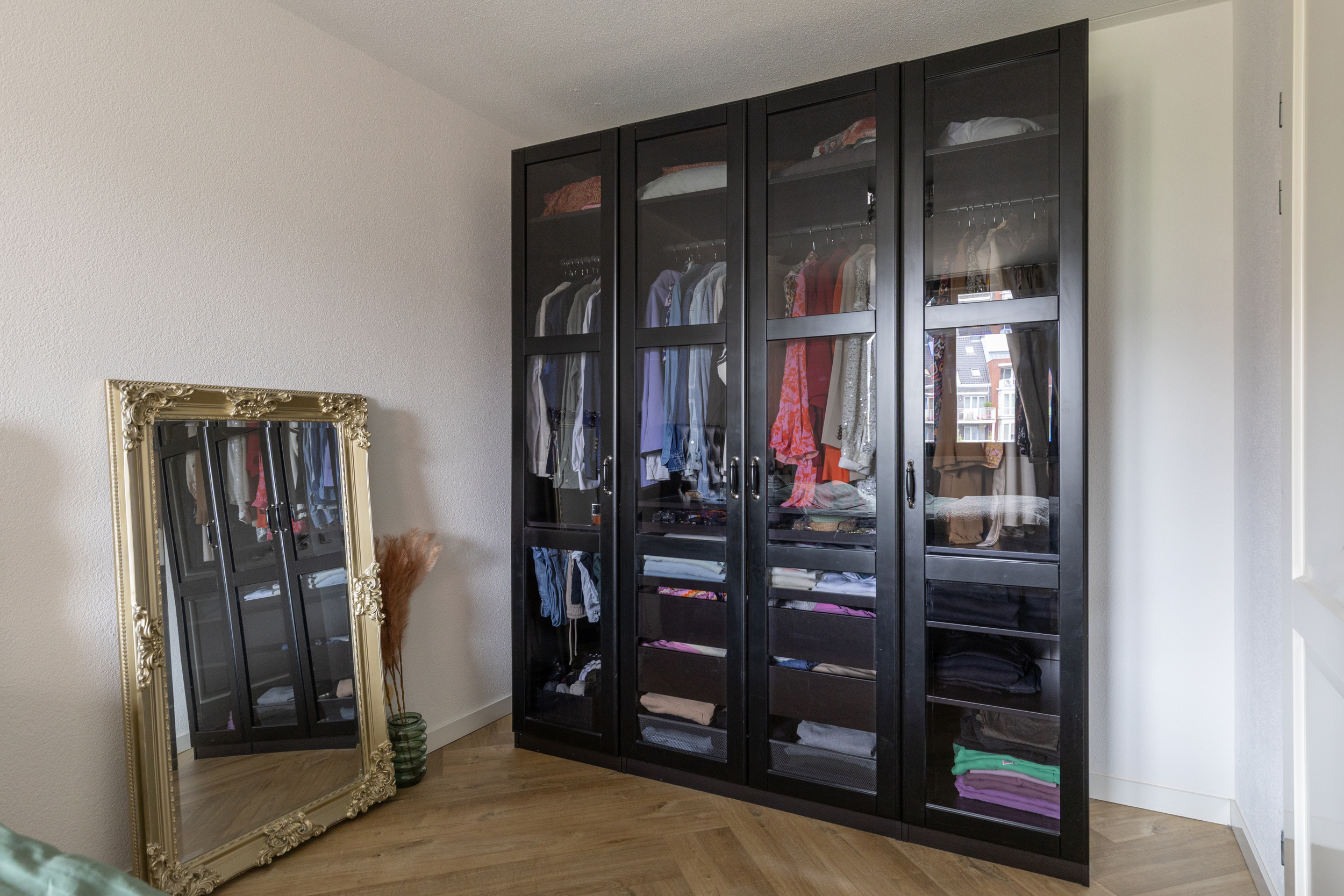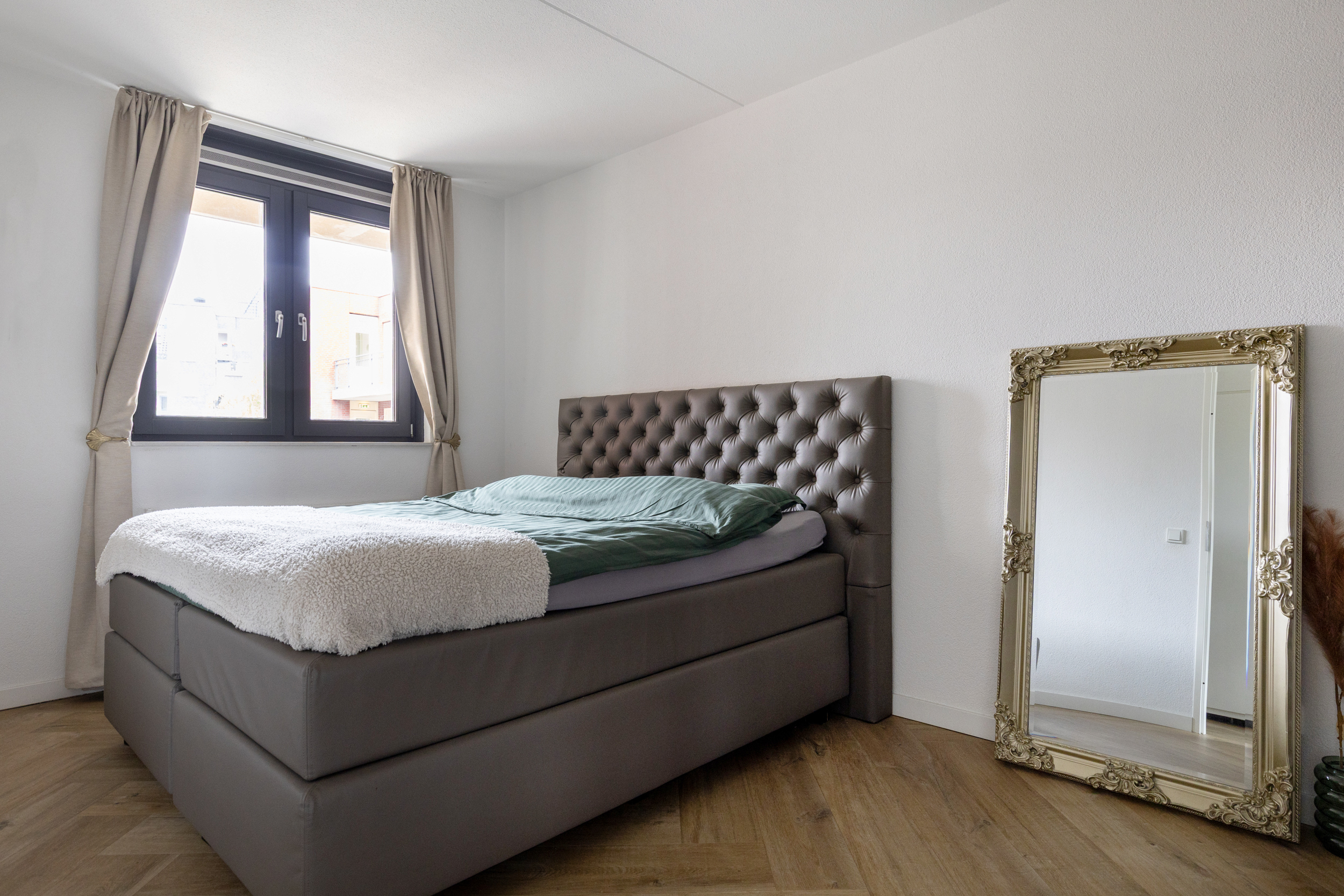 De slaapkamer is ruim van formaat en biedt alle ruimte voor een tweepersoonsbed en een grote garderobekast. Ook hier zorgen de ramen voor een prettige lichtinval.