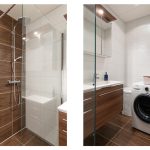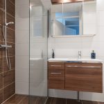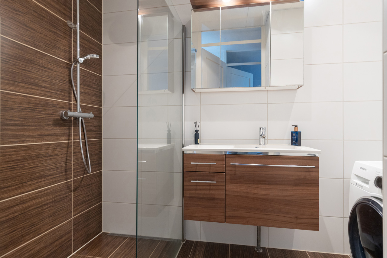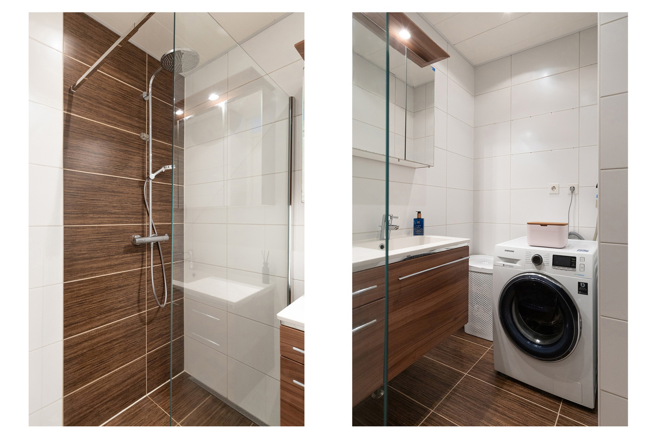 De badkamer is modern uitgevoerd met een inloopdouche met glazen wand, thermostaatkraan, een strak wastafelmeubel met spiegelkast en een aansluiting voor de wasmachine. Een praktische en sfeervolle ruimte waar je je dag fris begint of ontspannen afsluit.