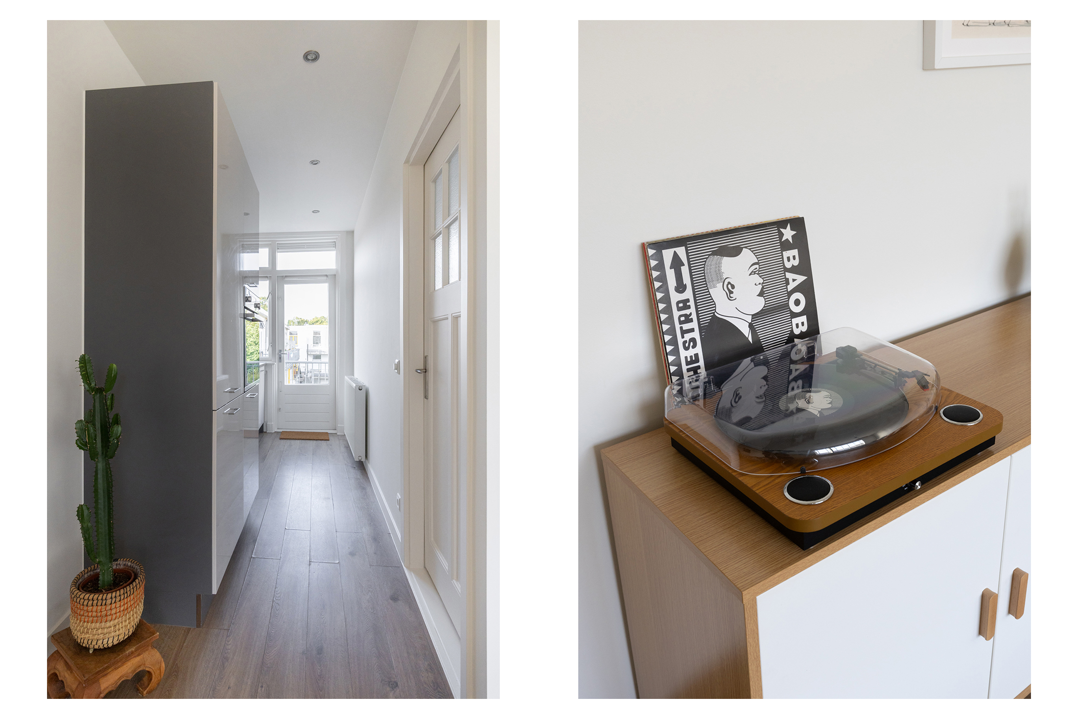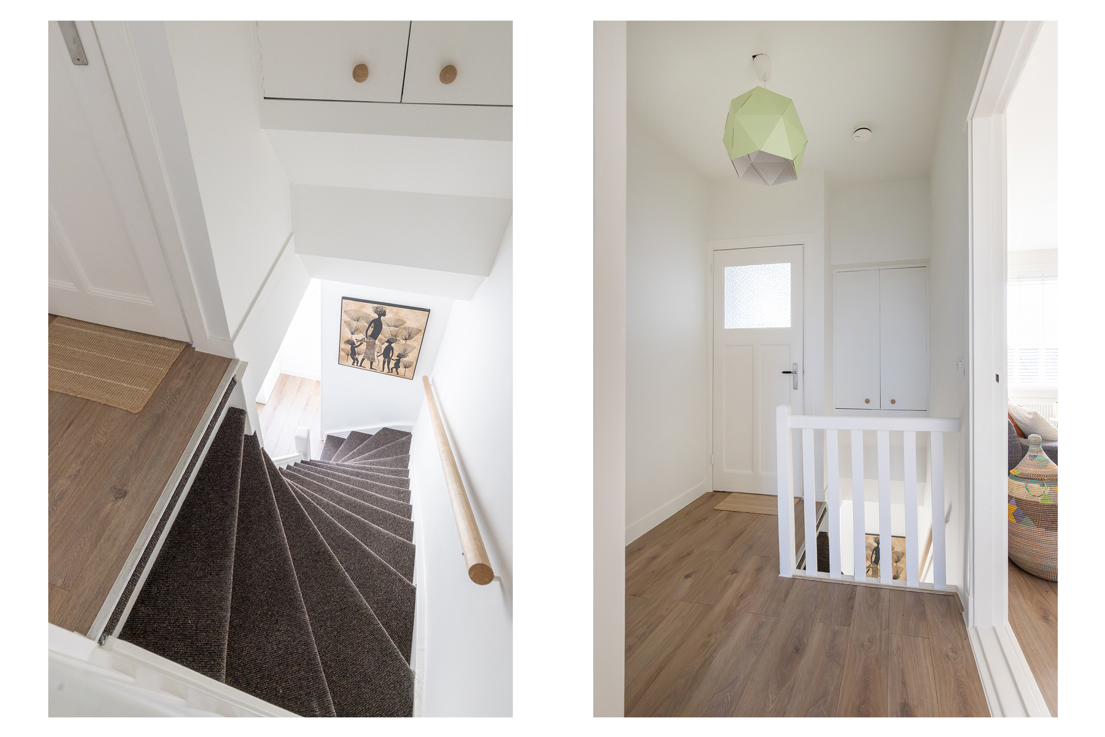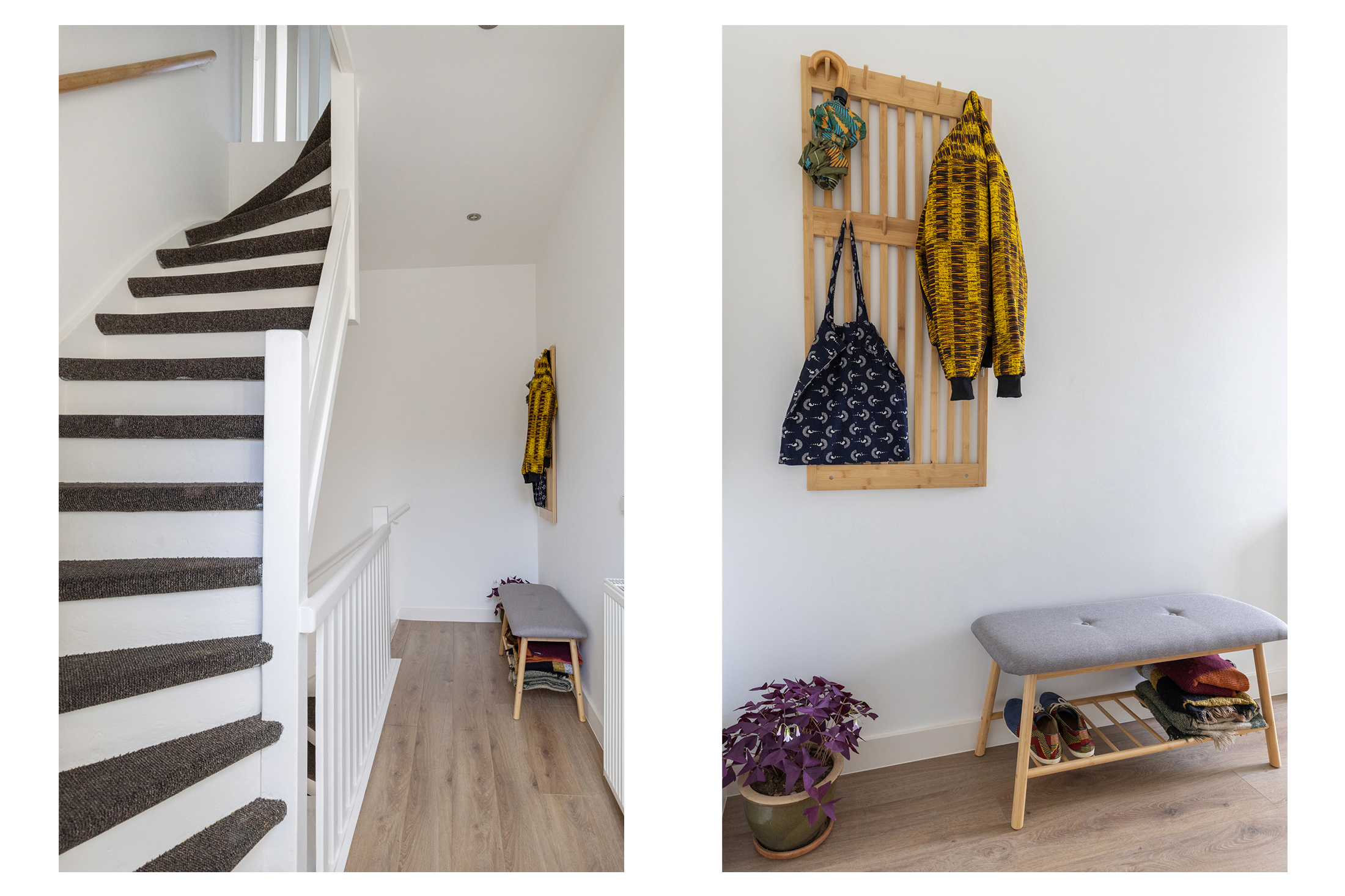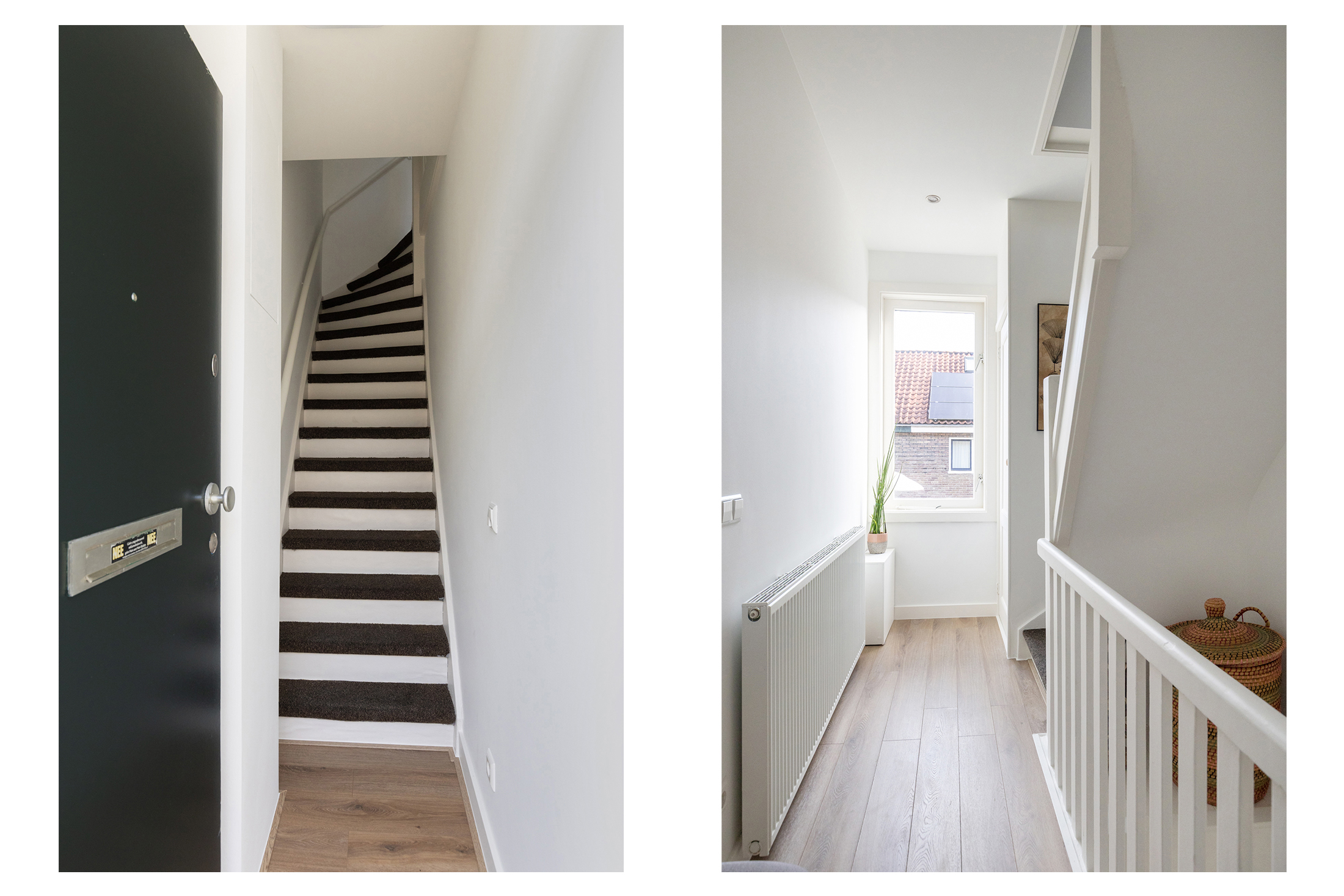 Via je eigen entree op de begane grond stap je binnen in een strak afgewerkte hal met trapopgang naar de eerste verdieping. Daar vind je een ruime overloop met vaste kast. Een handige plek voor jassen, schoenen of extra spullen. Ideaal voor iedereen met een serieuze verzameling jassen, tassen of sneakers want hier kun je met gemak je hele collectie kwijt.
