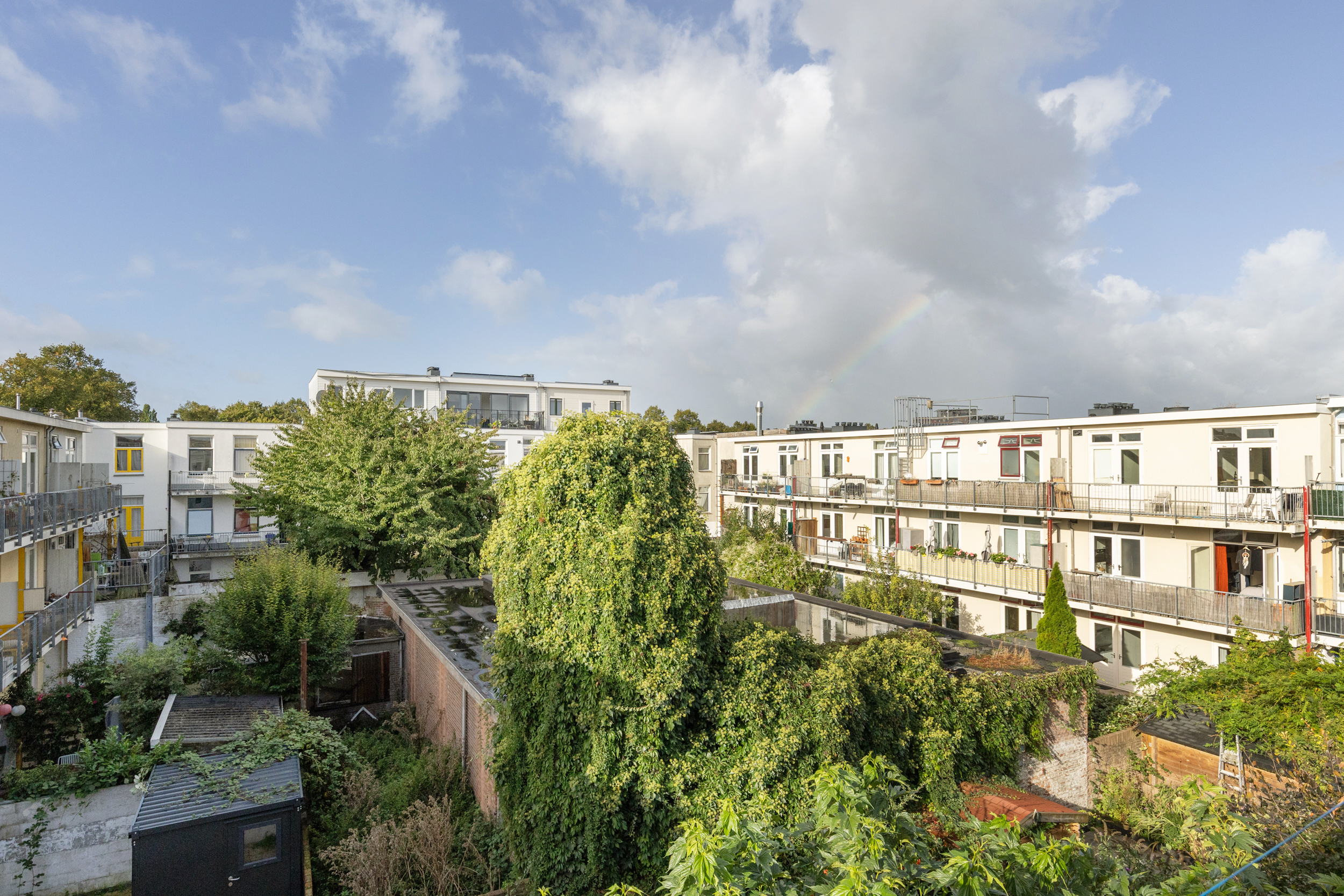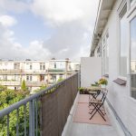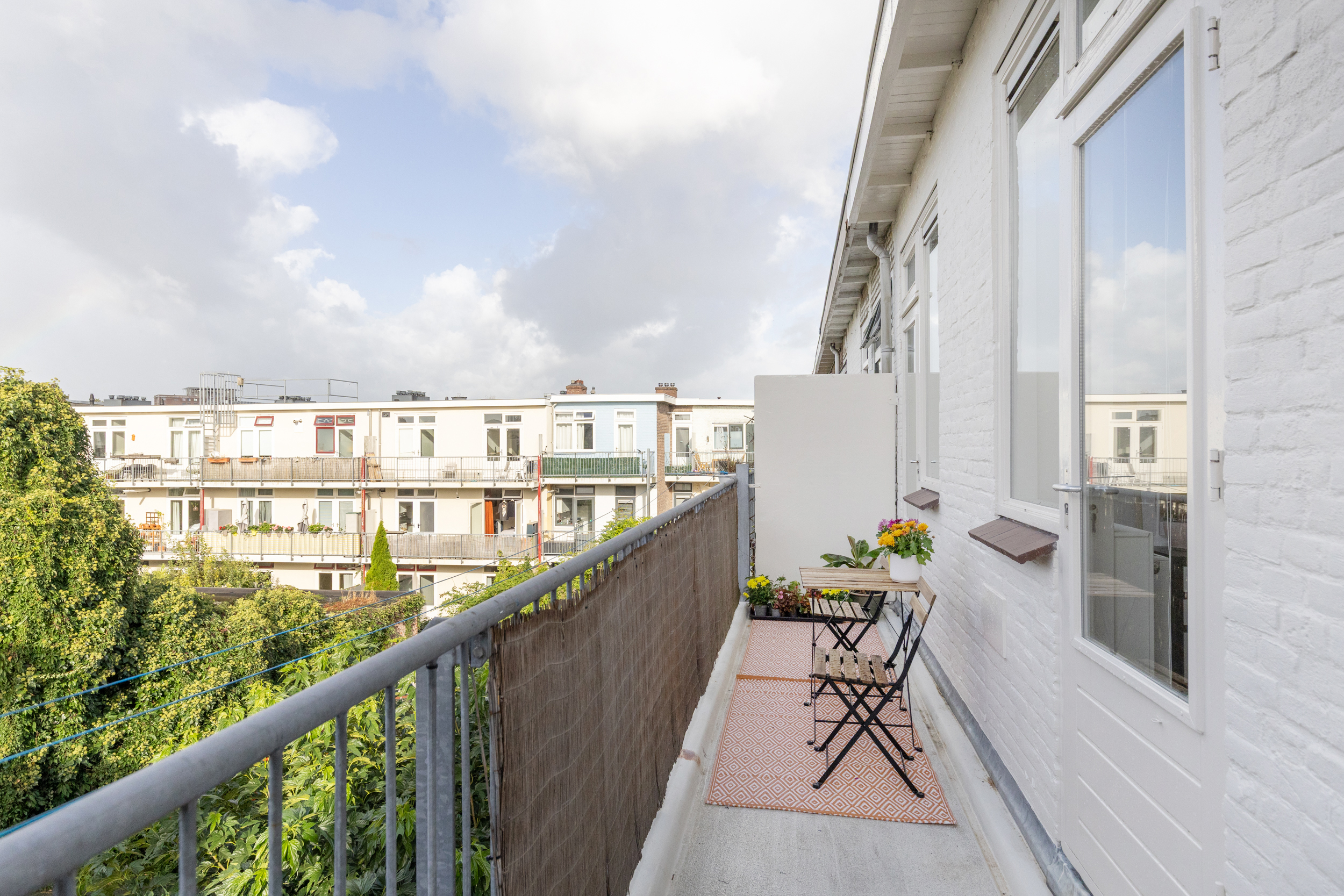 Het balkon loopt over de volledige breedte van de woning en is gelegen op het zuidwesten. Hier kun je in de zomer van ongeveer 11:00 tot 21:00 uur volop genieten van de zon. De woning ligt in een ruim opgezet woonblok met veel afstand tussen de bebouwing, wat zorgt voor een prettig vrij en open gevoel.