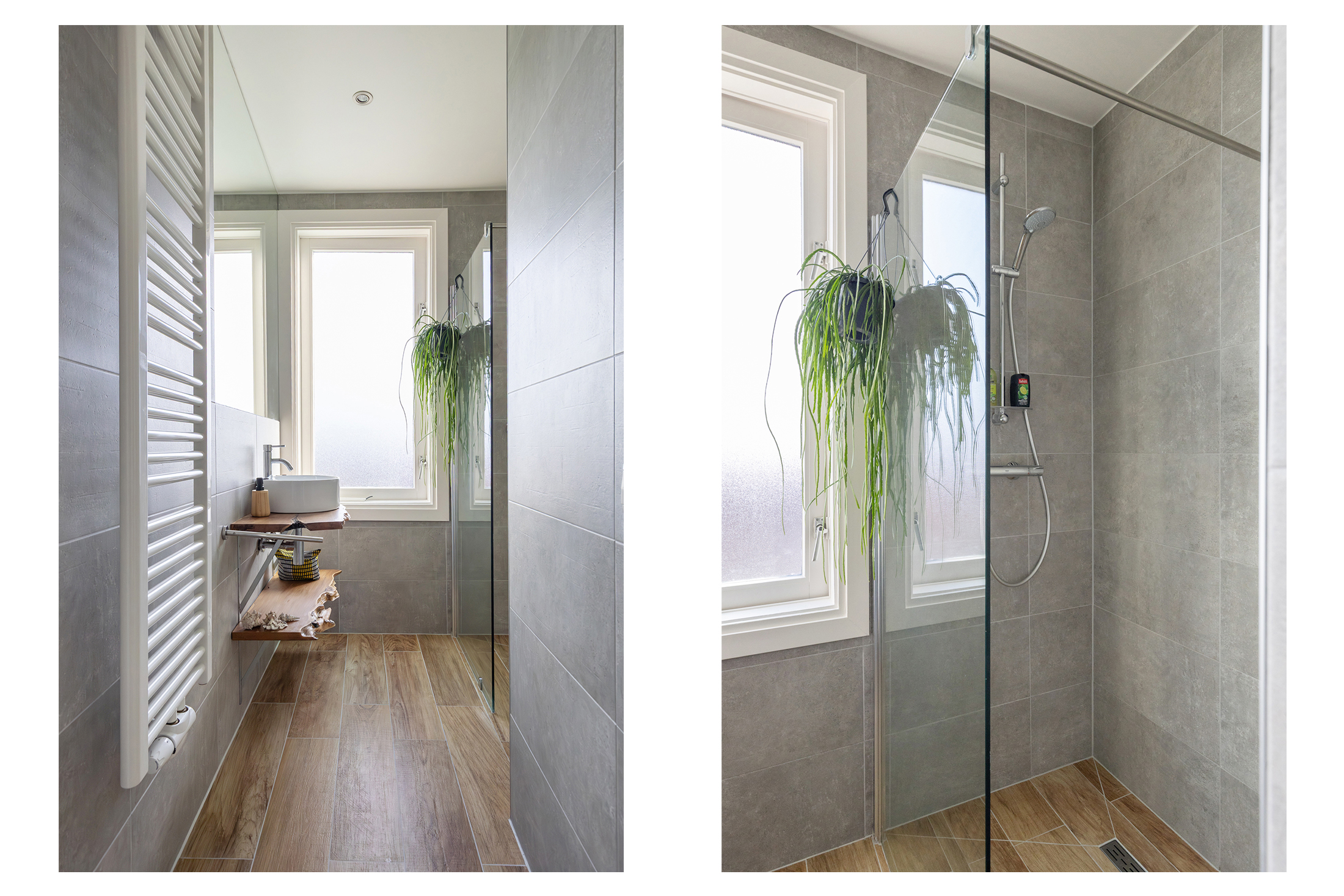 De moderne badkamer is uitgerust met een inloopdouche, wastafelmeubel en designradiator. Het toilet is separaat en bereikbaar via de overloop. Originele paneeldeuren geven de woning extra charme.