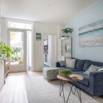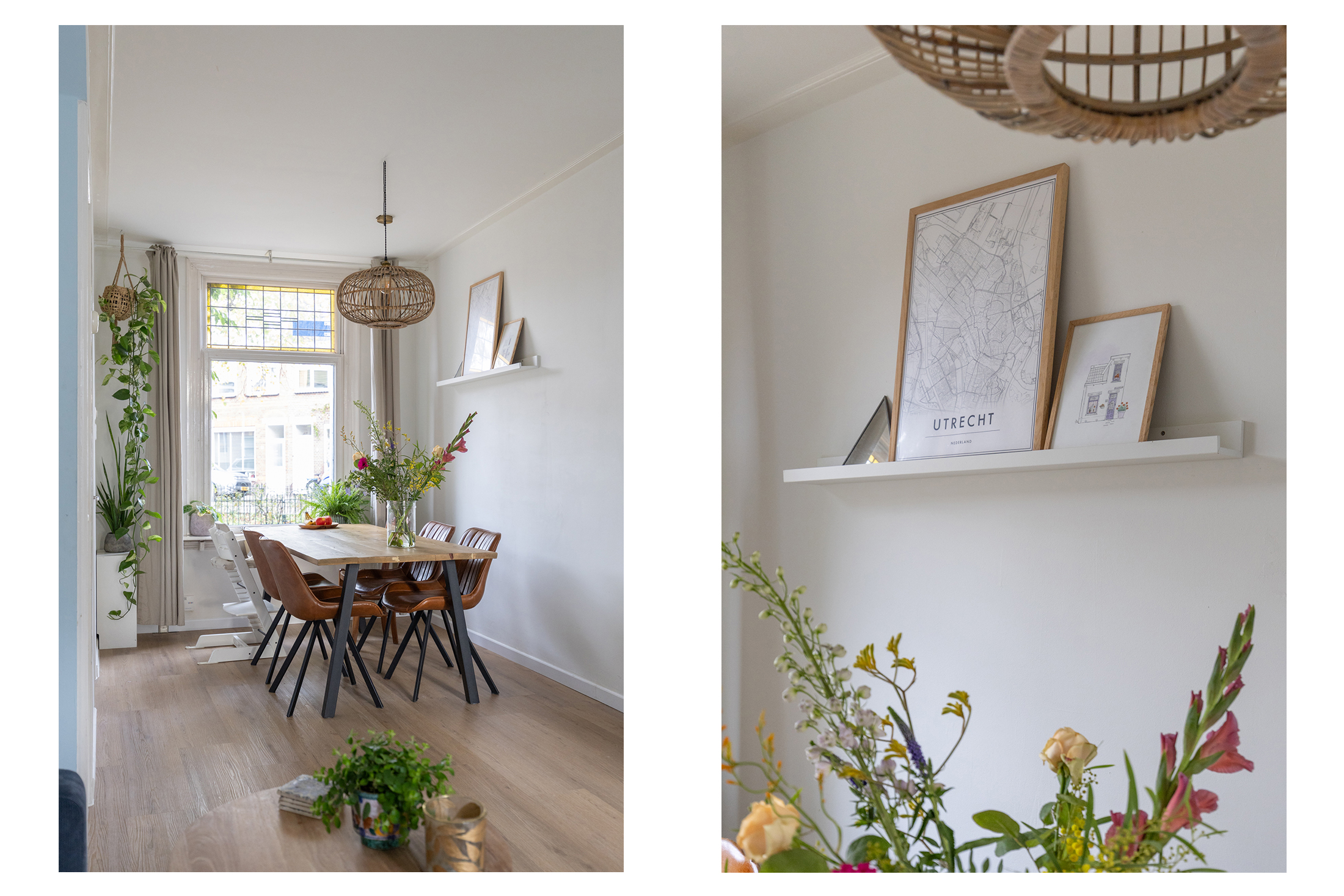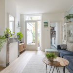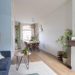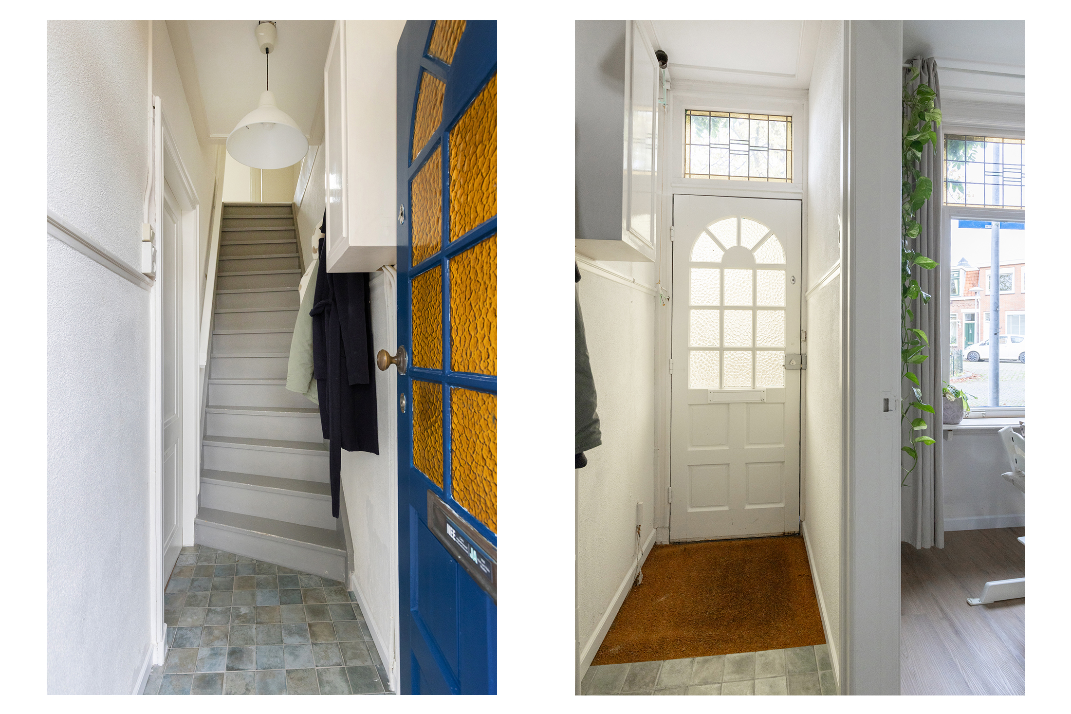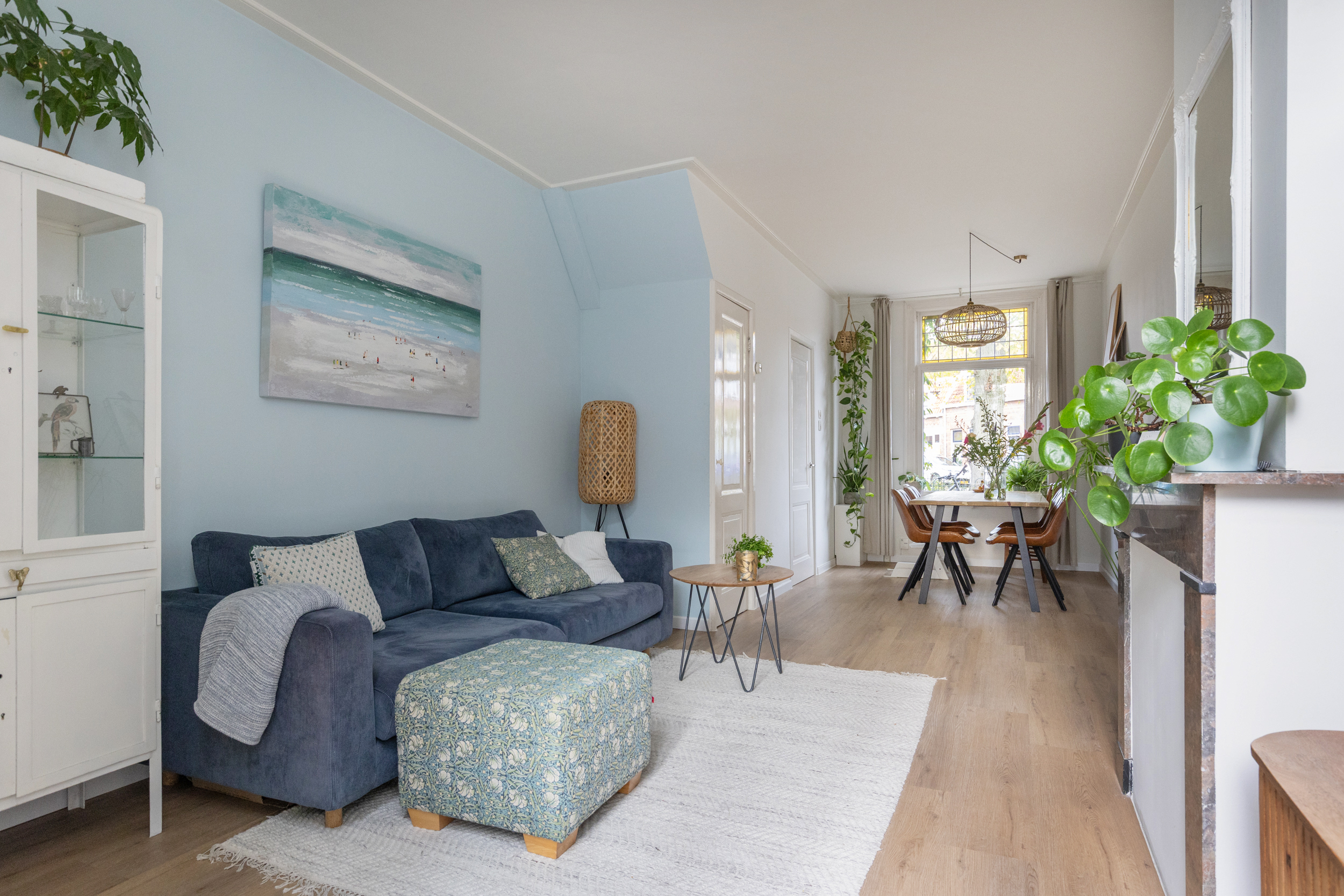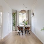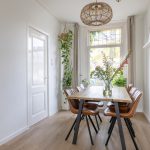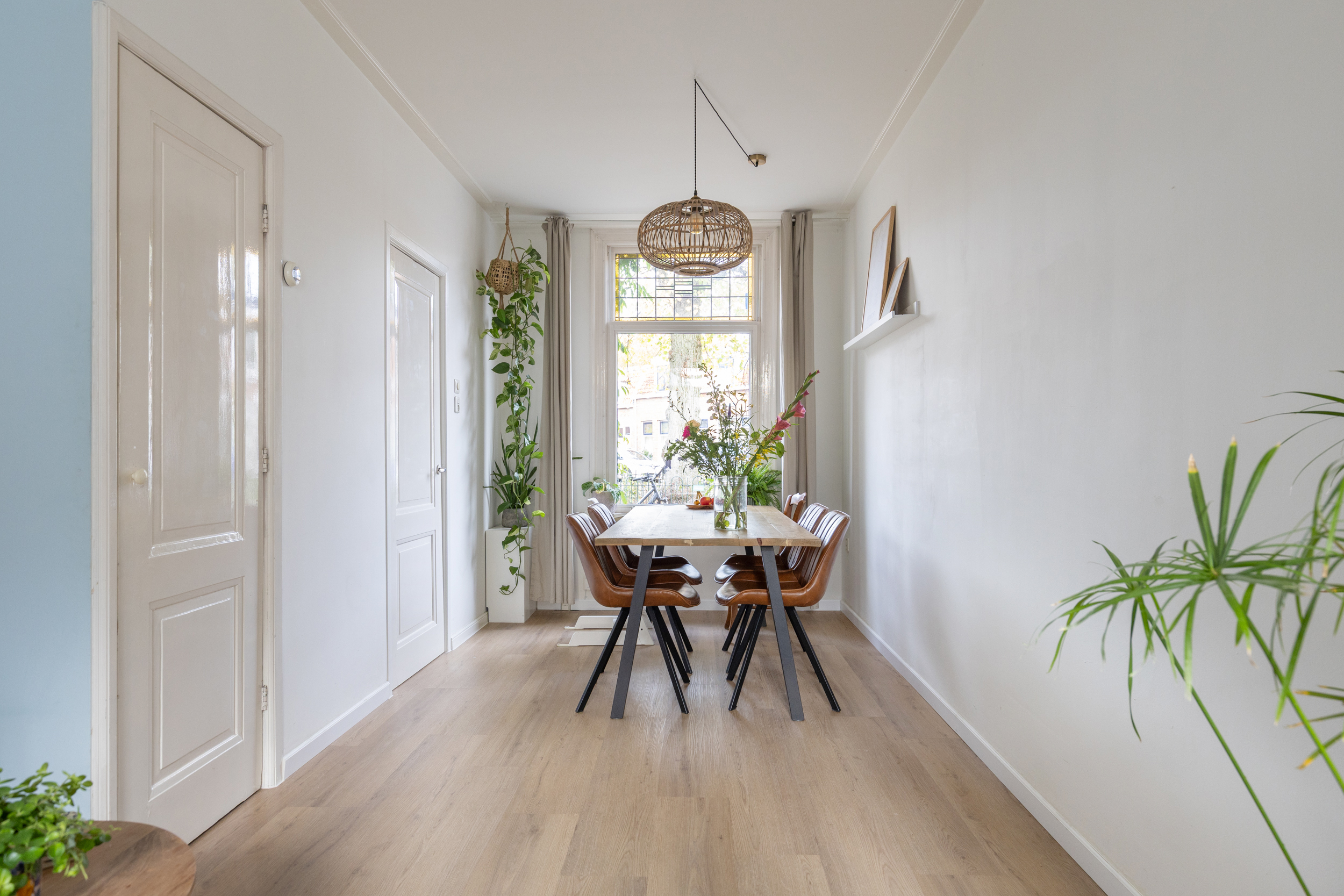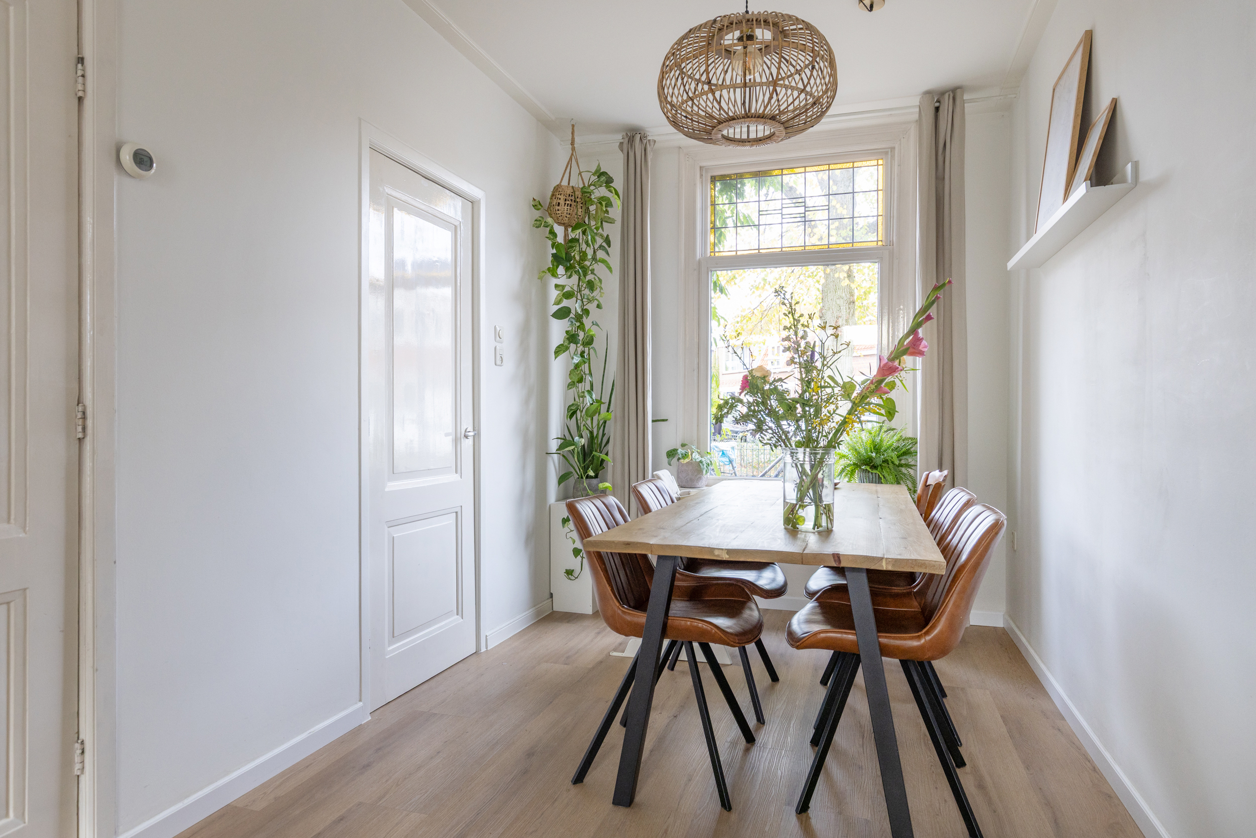 Je stapt binnen in de hal met trapopgang naar boven en toegang tot de eetkamer aan de voorzijde. Deze loopt mooi over in de lichte woonkamer, waar je direct de sfeer en warmte van de woning ervaart. De originele glas-in-loodramen aan de voorzijde zorgen voor een prachtig lichtspel en een karakteristieke uitstraling. In de woonkamer vind je ook een praktische trapkast.