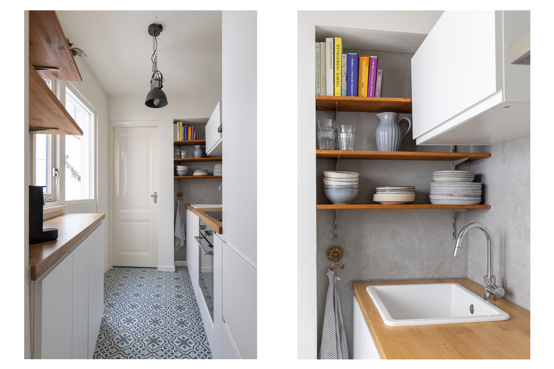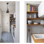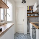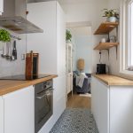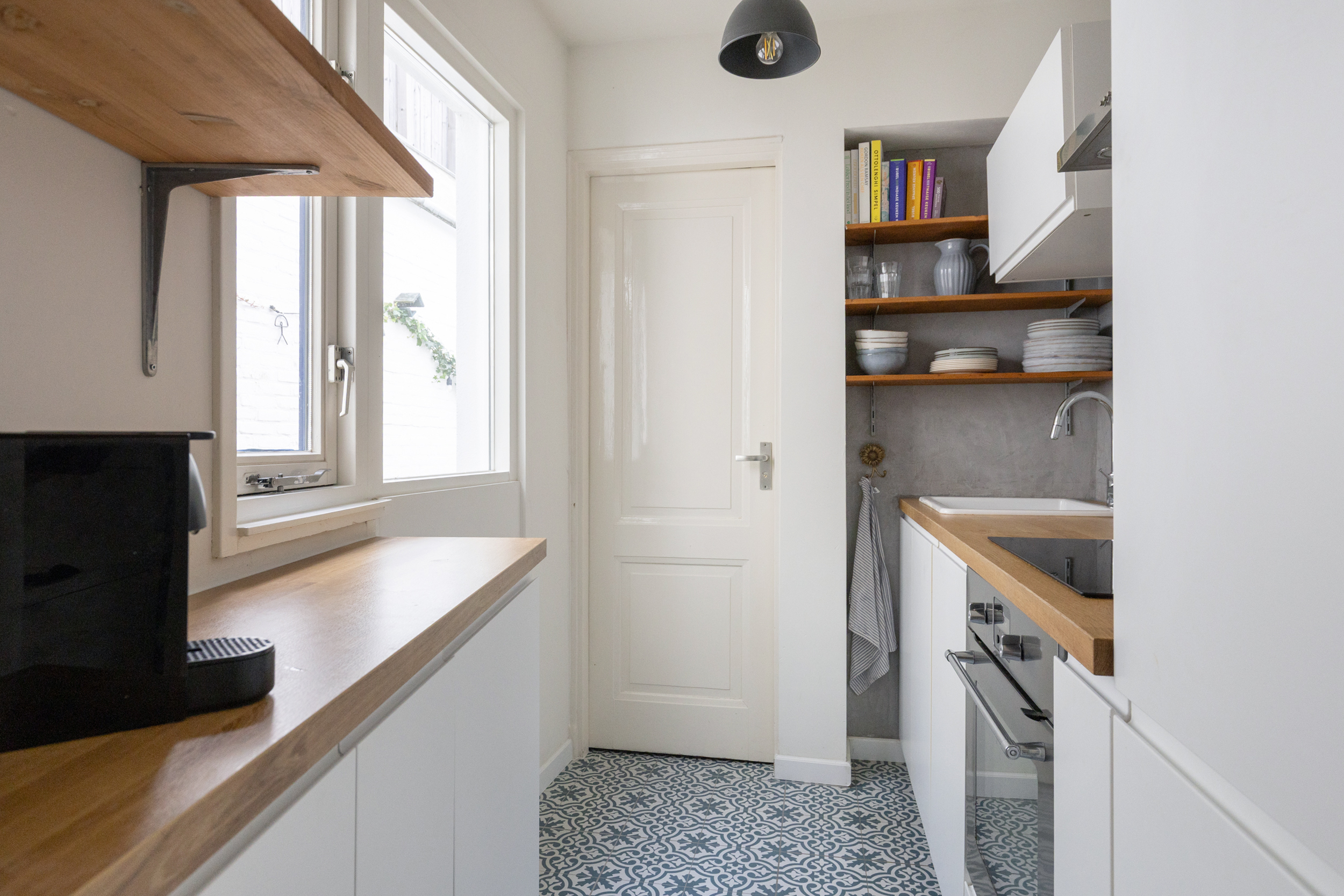 Aan de achterzijde bevindt zich de halfopen keuken, strak afgewerkt en voorzien van een inductiekookplaat, afzuigkap, koel-vriescombinatie en vaatwasser. Het moderne toilet (met zwevend closet) is bereikbaar via de keuken.