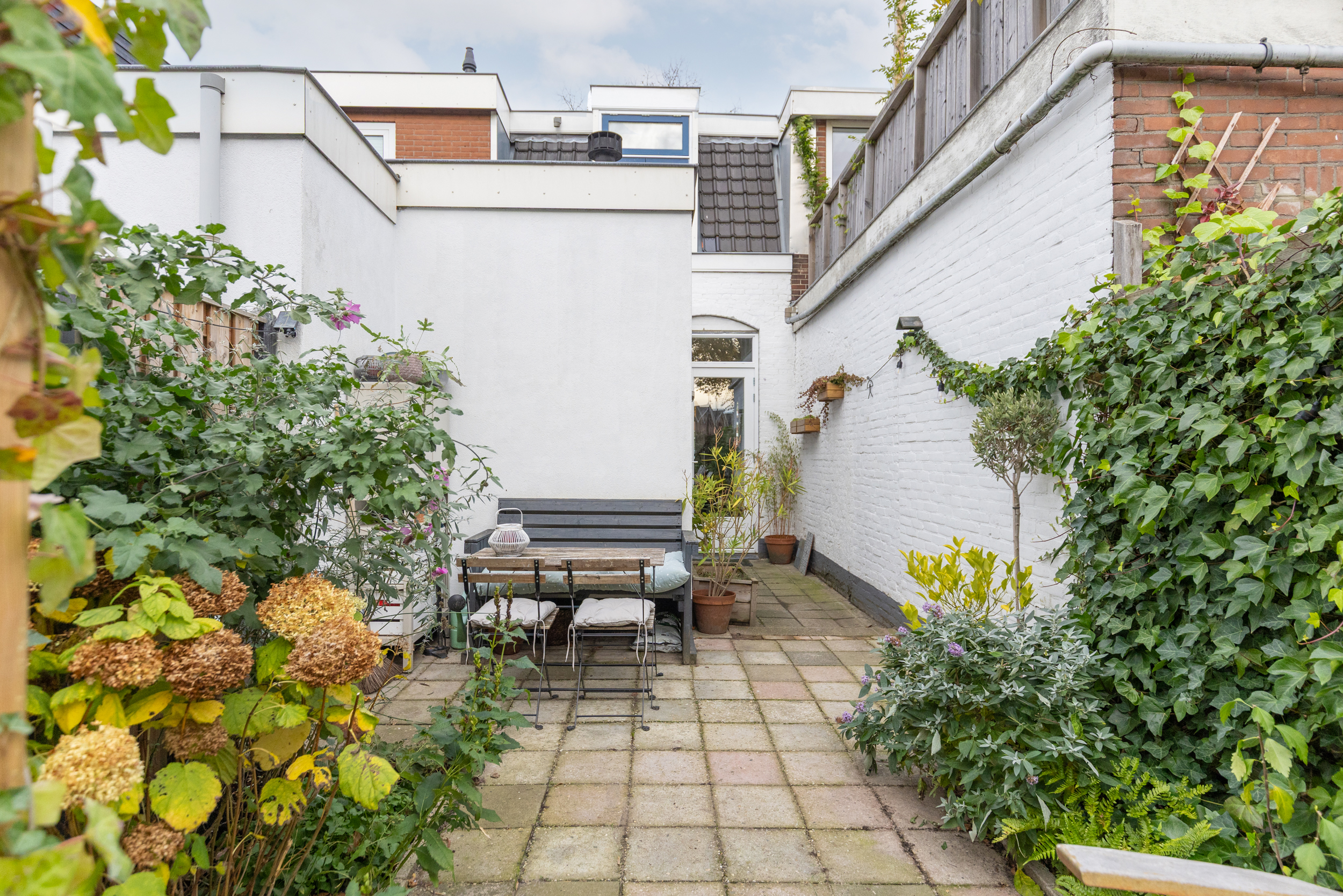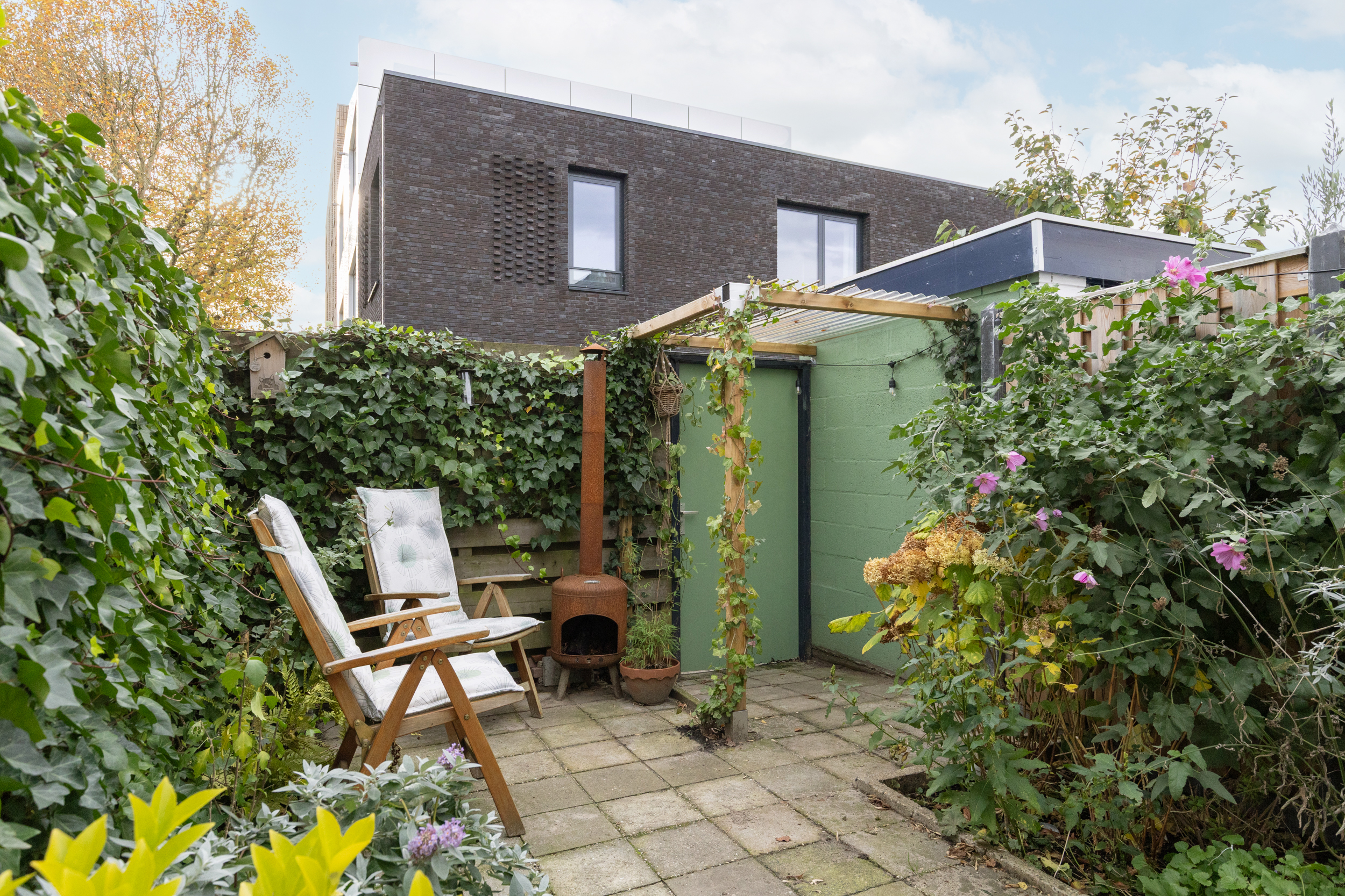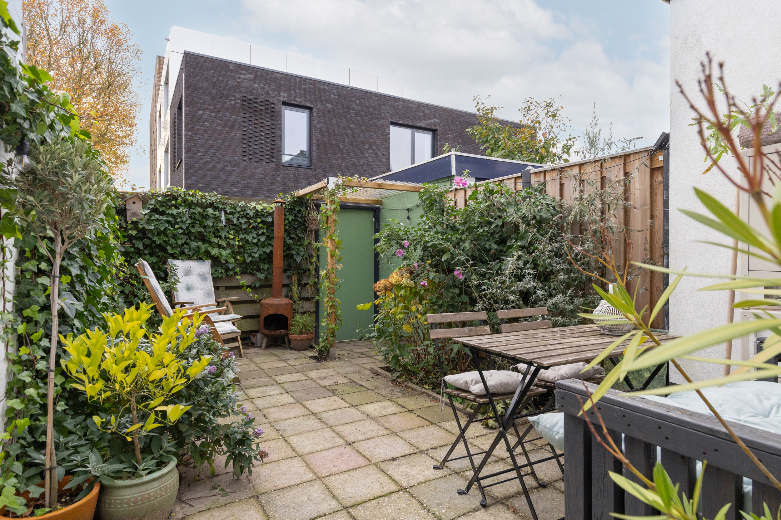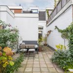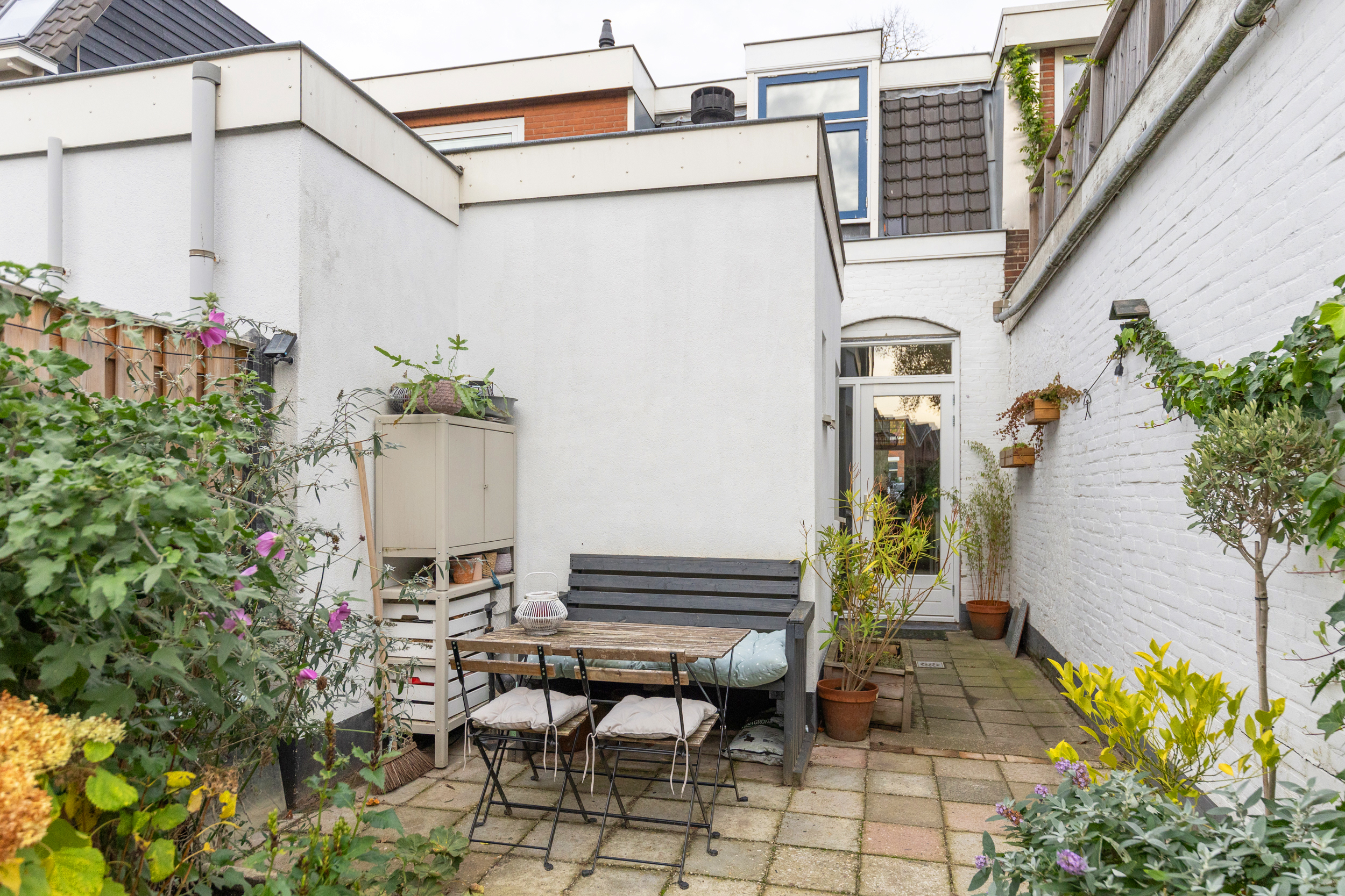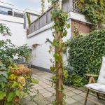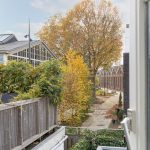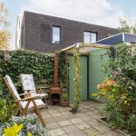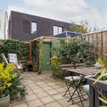 De achtertuin ligt op het zuidoosten. Hier geniet je van een kop koffie in de ochtendzon, een goed boek in de middag en lange zomeravonden met sfeervolle tuinverlichting. De tuin is ruim voor de wijk, voelt heerlijk besloten en heeft een vrije doorkijk op de sfeervolle bebouwing van het Wisselspoor. Dankzij de achterom is de tuin ook praktisch in gebruik.