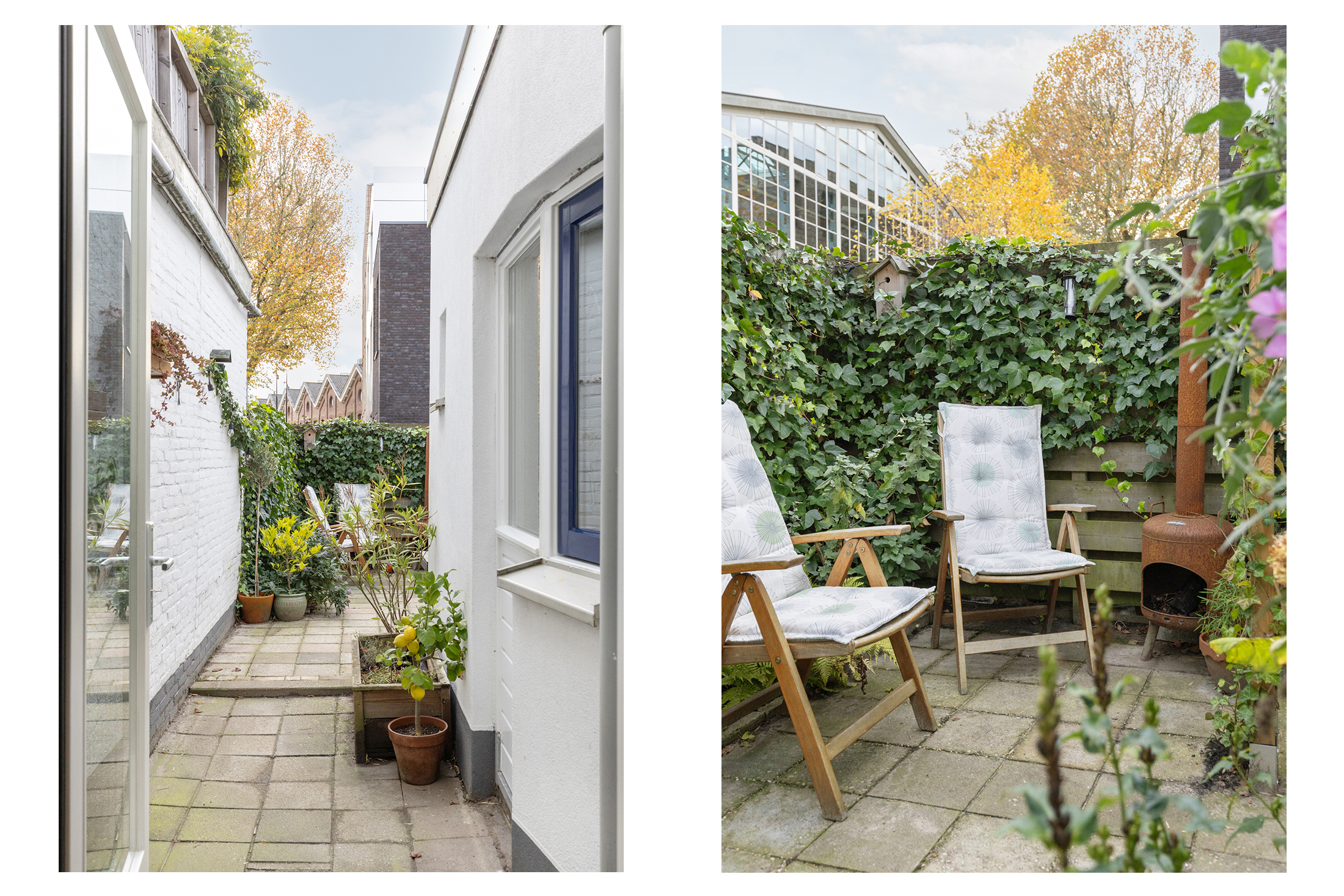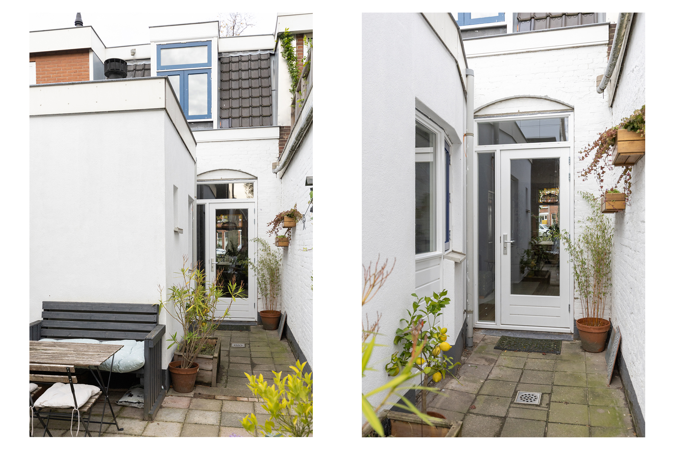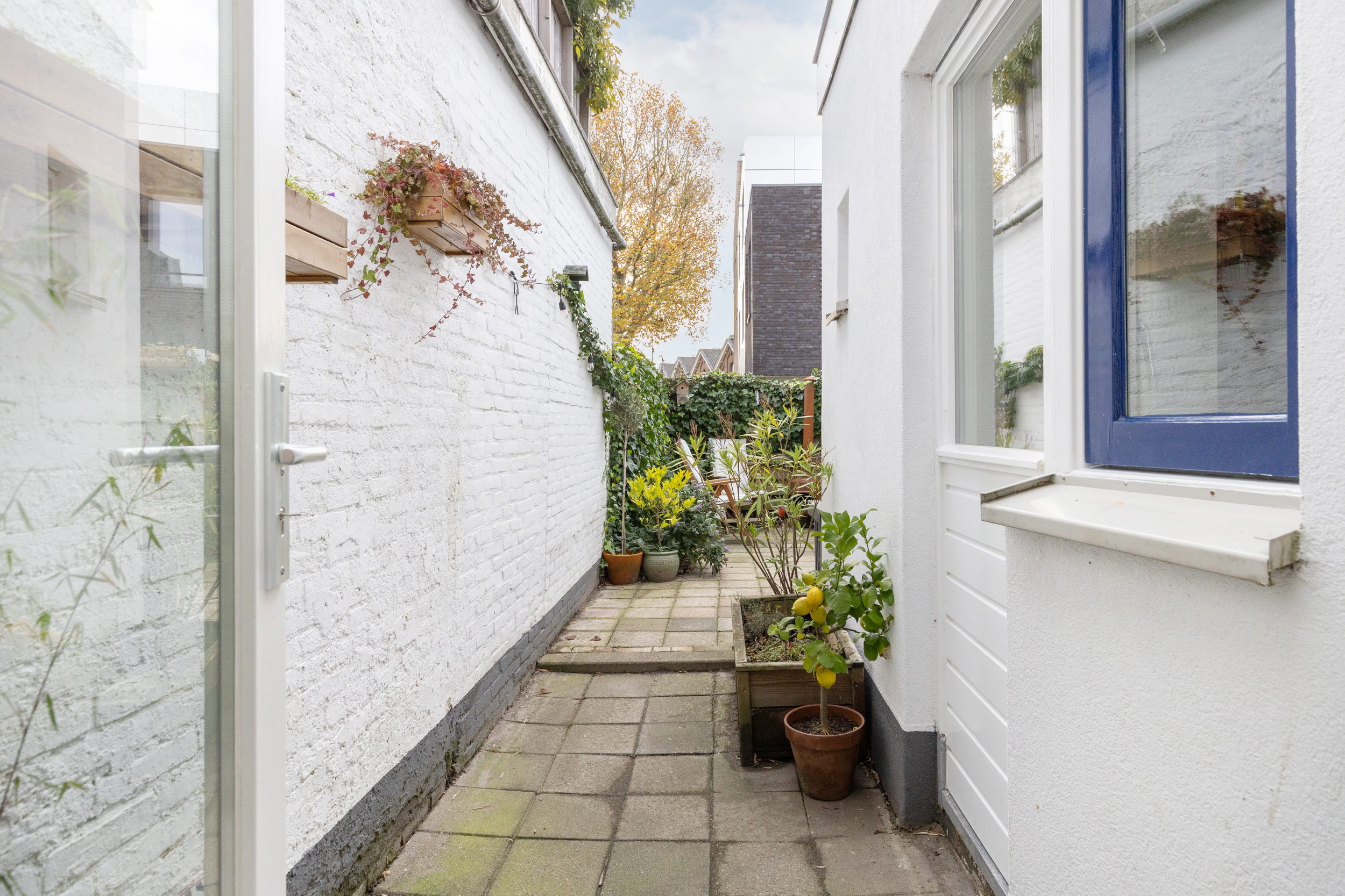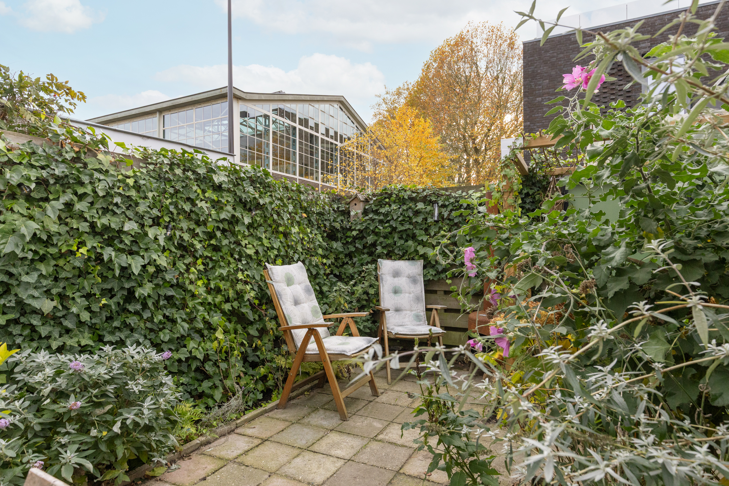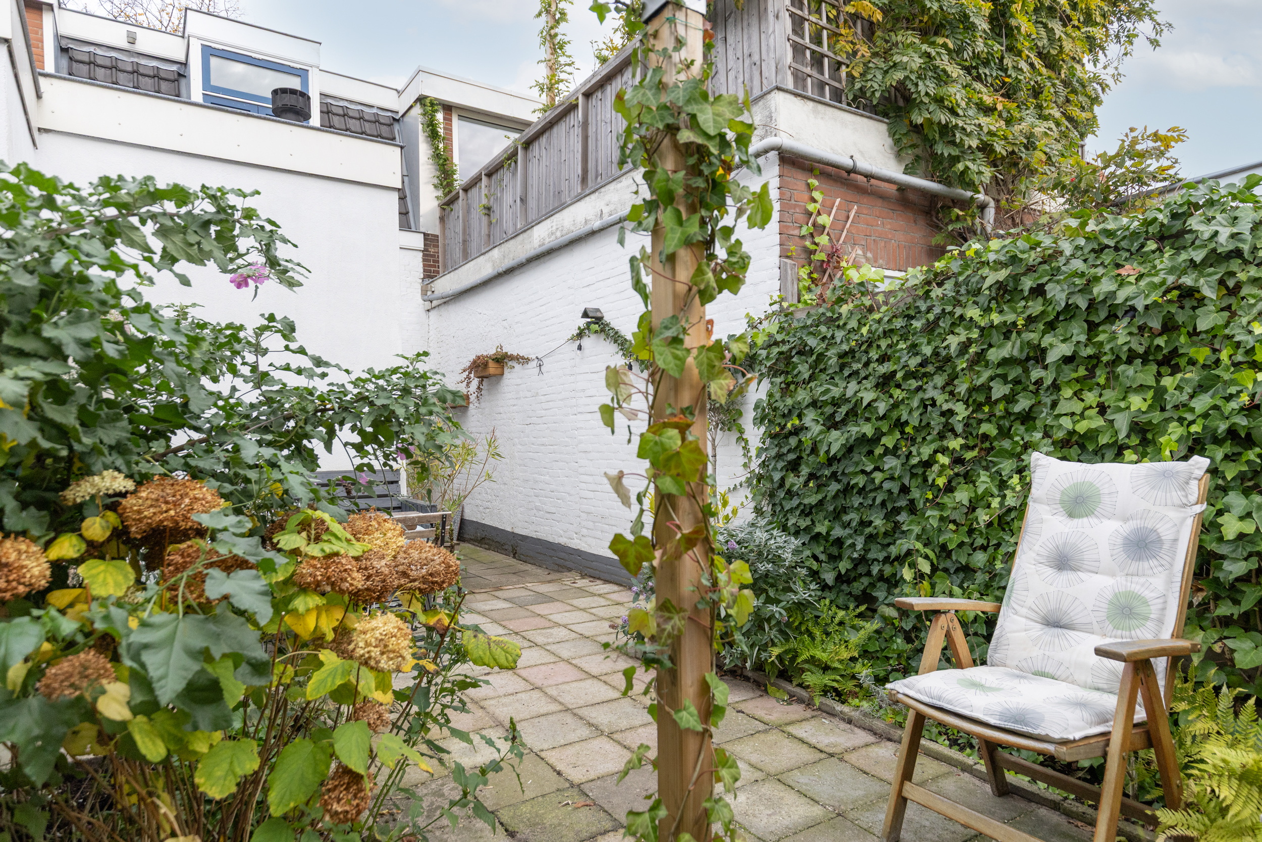 De achtertuin ligt op het zuidoosten. Hier geniet je van een kop koffie in de ochtendzon, een goed boek in de middag en lange zomeravonden met sfeervolle tuinverlichting. De tuin is ruim voor de wijk, voelt heerlijk besloten en heeft een vrije doorkijk op de sfeervolle bebouwing van het Wisselspoor. Dankzij de achterom is de tuin ook praktisch in gebruik.
