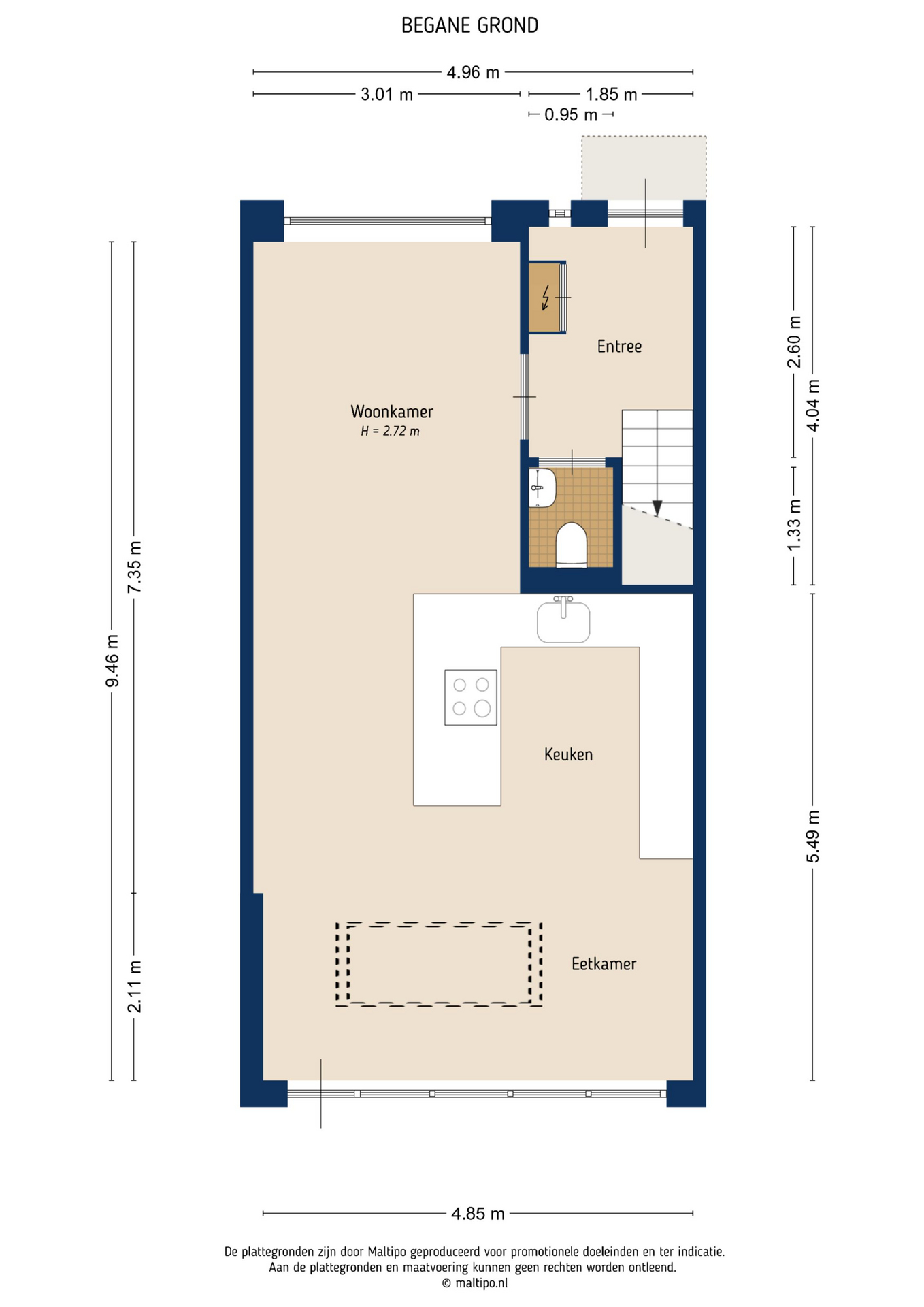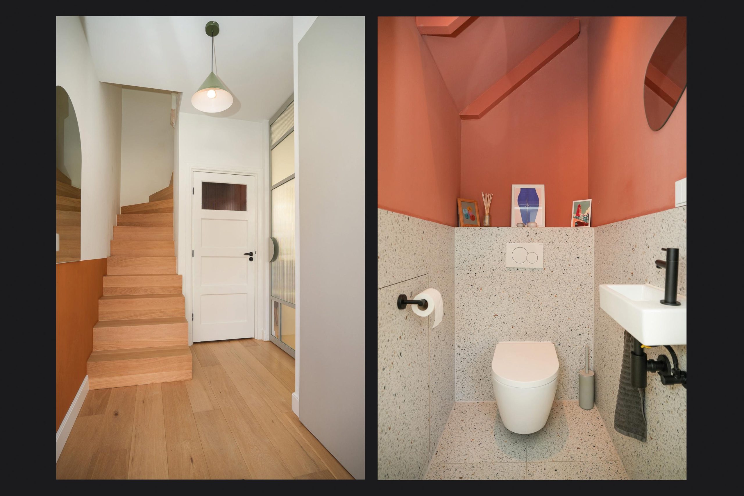 Via de entree kom je binnen in een verzorgde hal, waar de fraaie trap en de stijlvolle deur naar de woonkamer direct opvallen. Hier bevinden zich ook de meterkast, het moderne toilet en voldoende ruimte voor een garderobe.