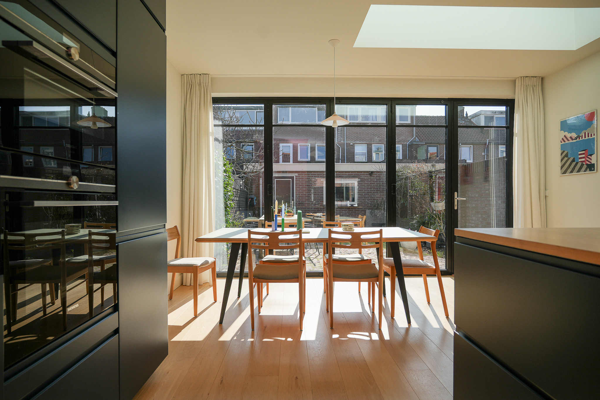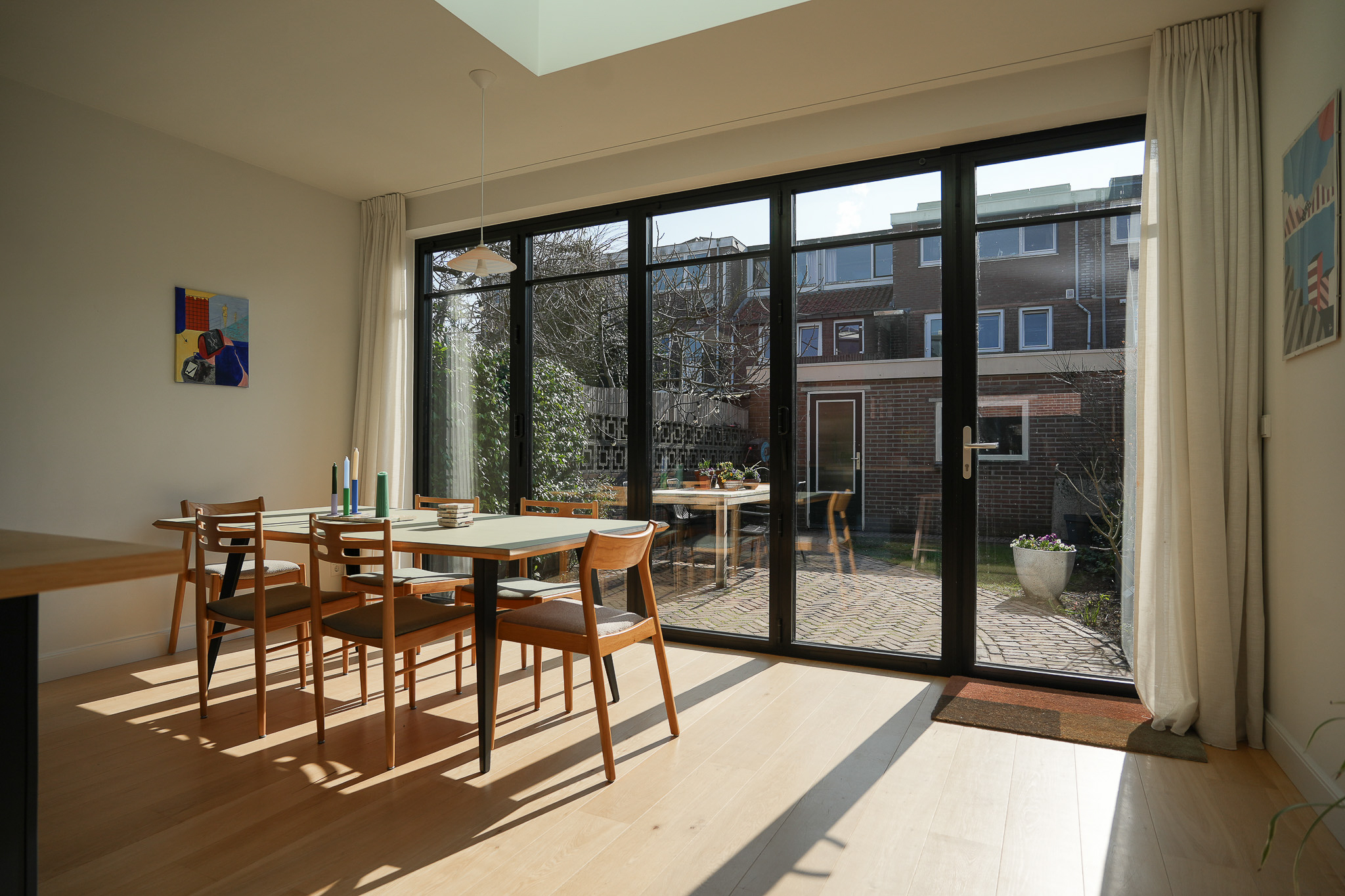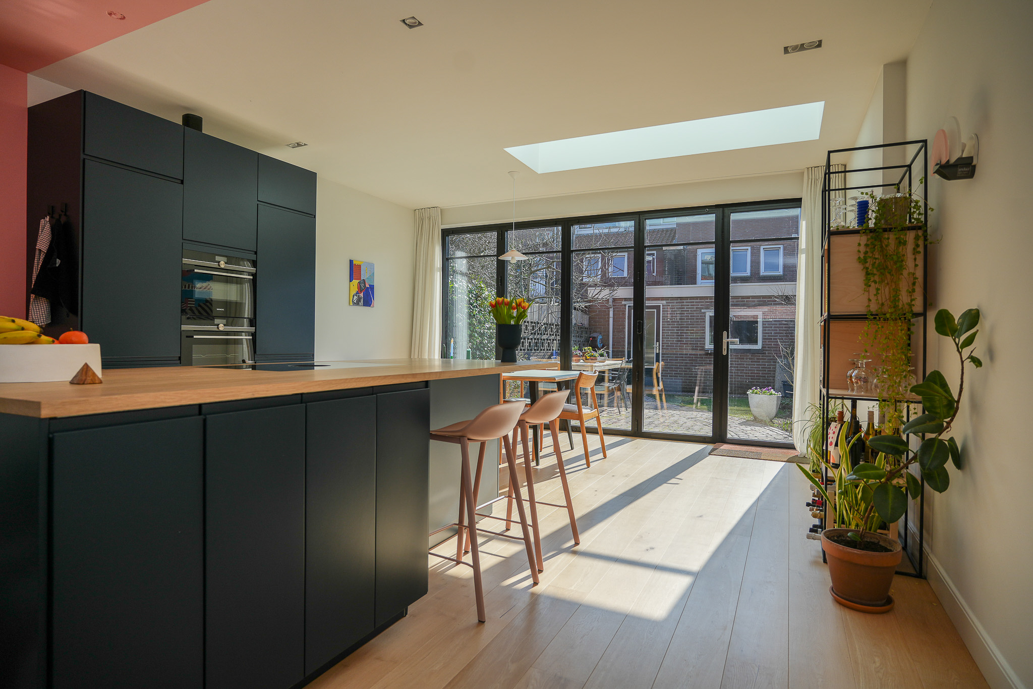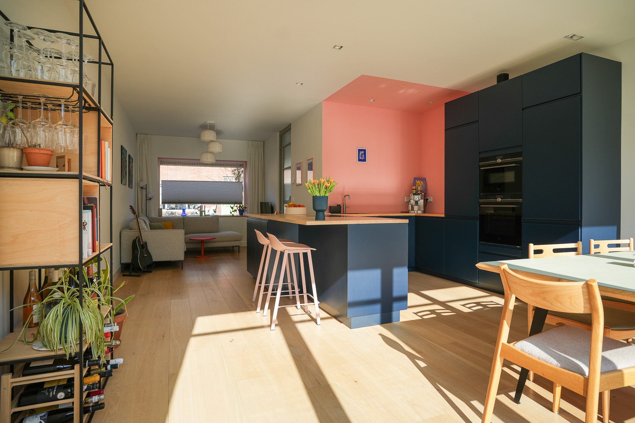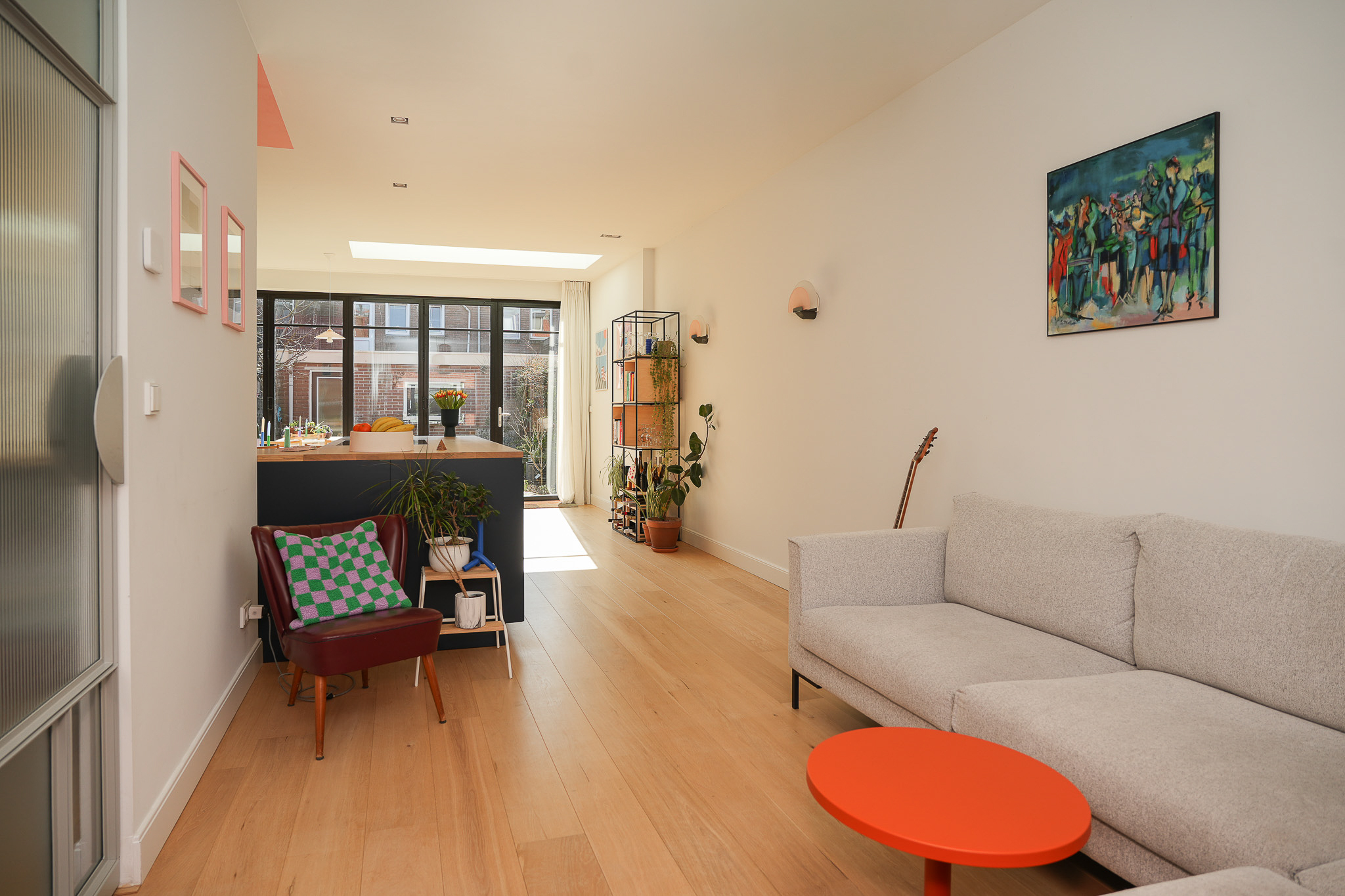 De woonkamer is licht en ruim, met aan de voorzijde een fijne zitplek. De keuken is op een unieke plek in de leefruimte gesitueerd, waardoor er aan de achterzijde volop ruimte is voor een grote eettafel. Hier geniet je van het vele daglicht dat via de lichtstraat en de harmonicadeuren rijkelijk naar binnen valt.