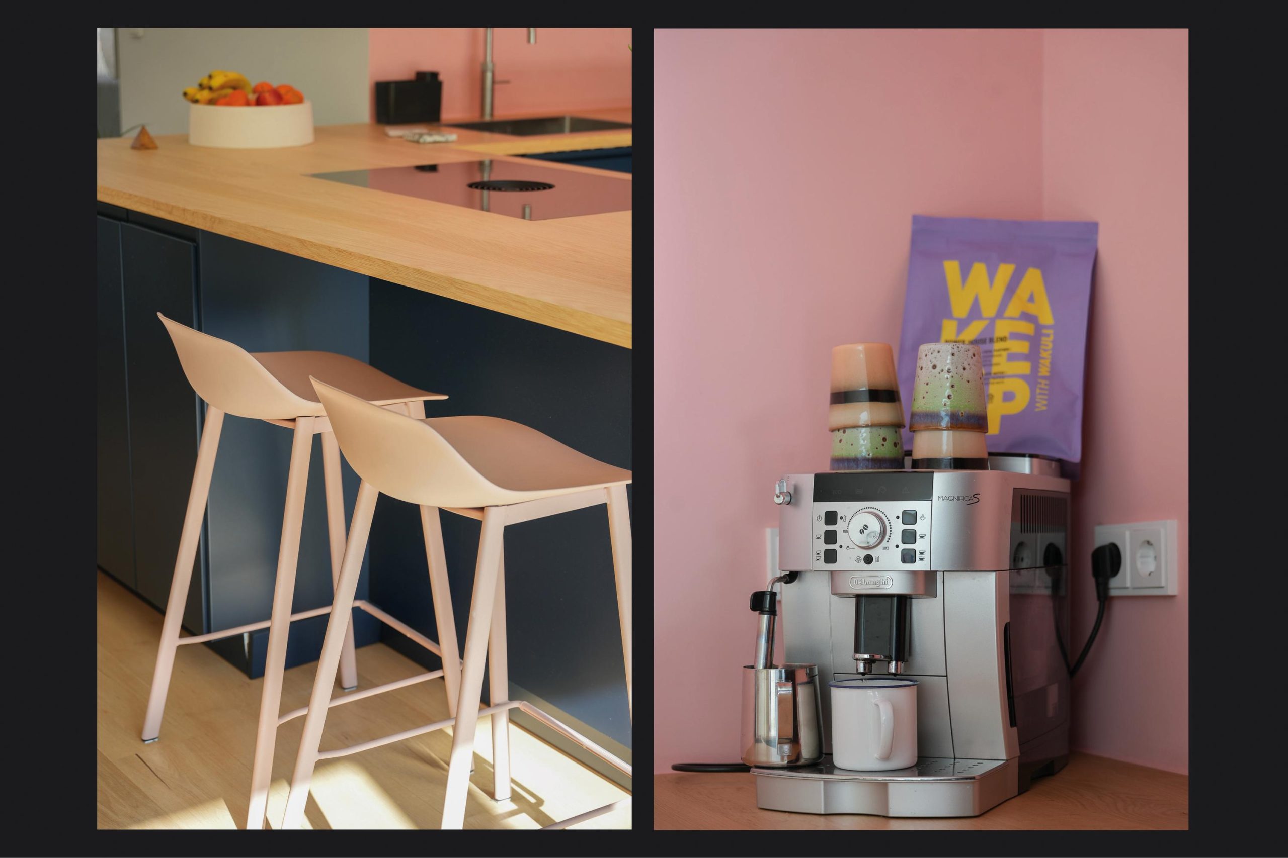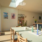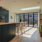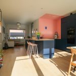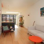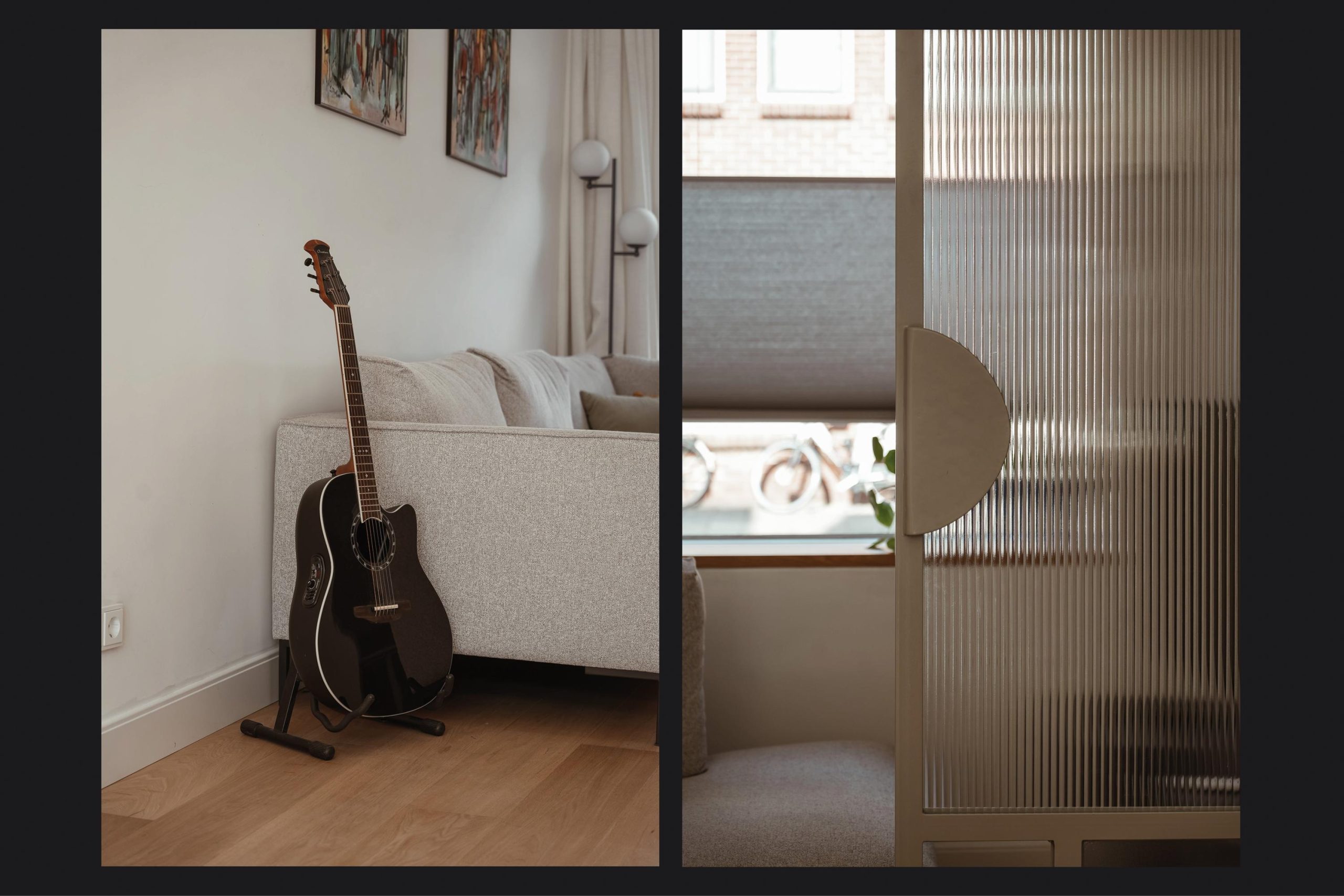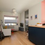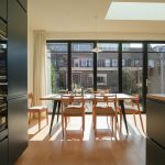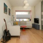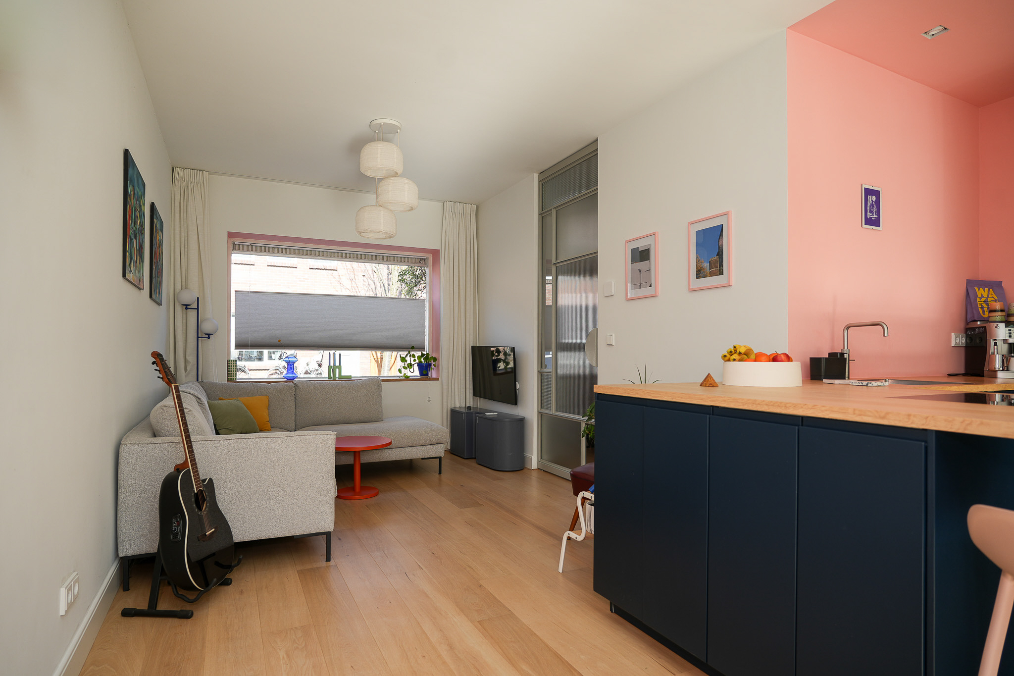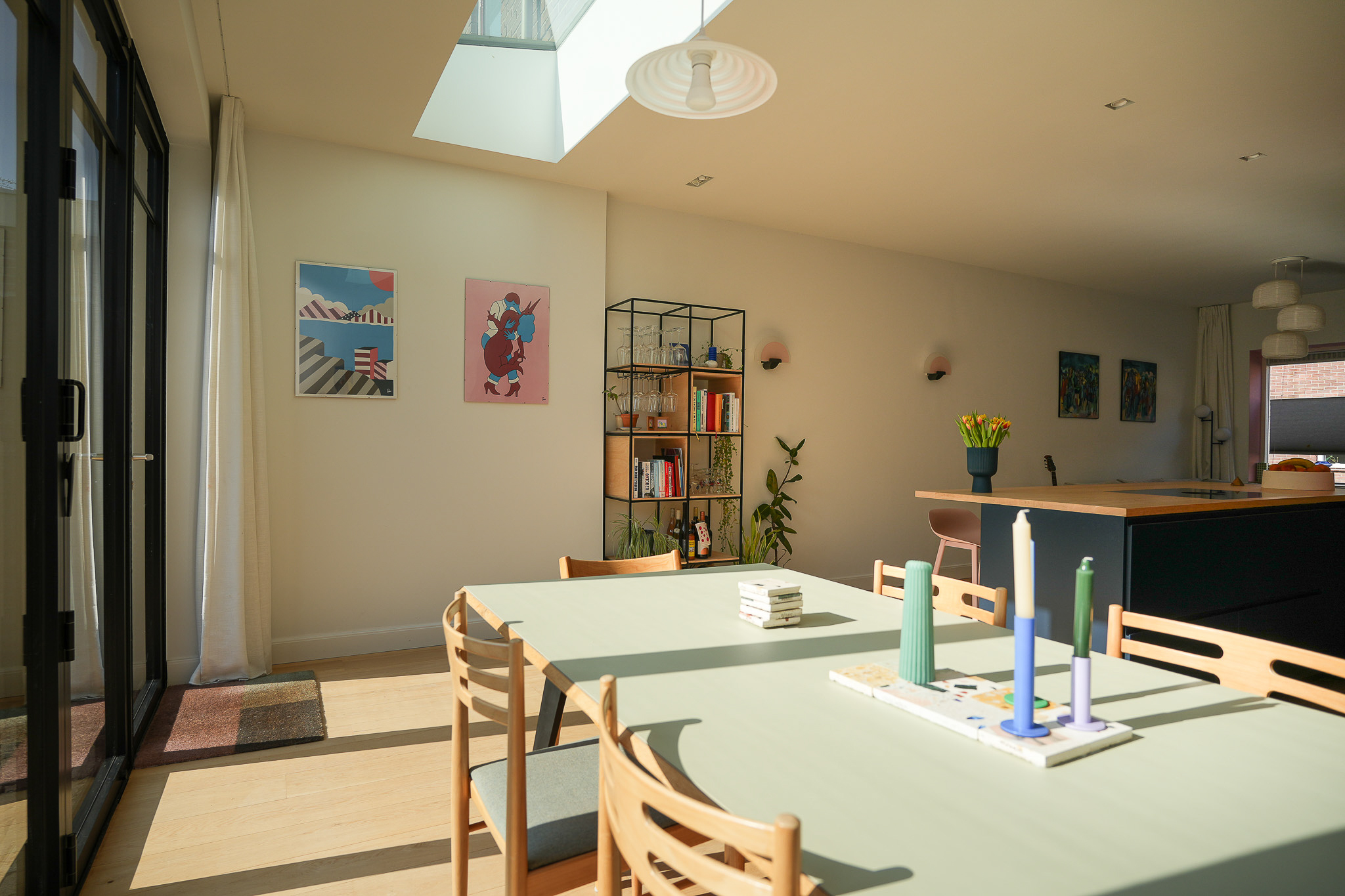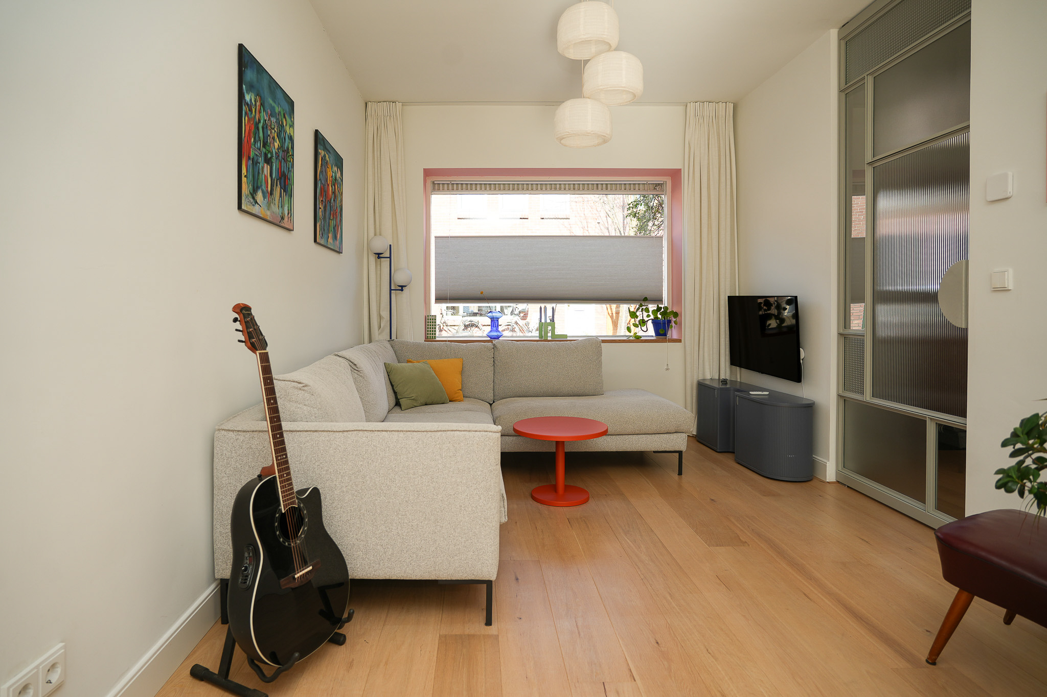 De woonkamer is licht en ruim, met aan de voorzijde een fijne zitplek. De keuken is op een unieke plek in de leefruimte gesitueerd, waardoor er aan de achterzijde volop ruimte is voor een grote eettafel. Hier geniet je van het vele daglicht dat via de lichtstraat en de harmonicadeuren rijkelijk naar binnen valt.