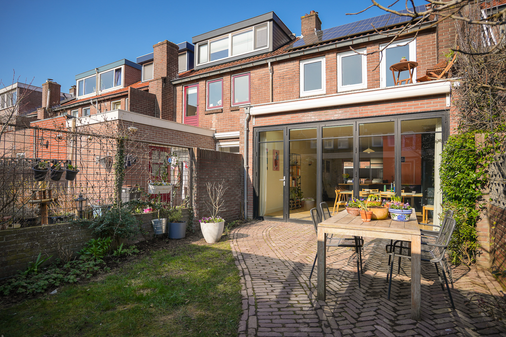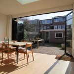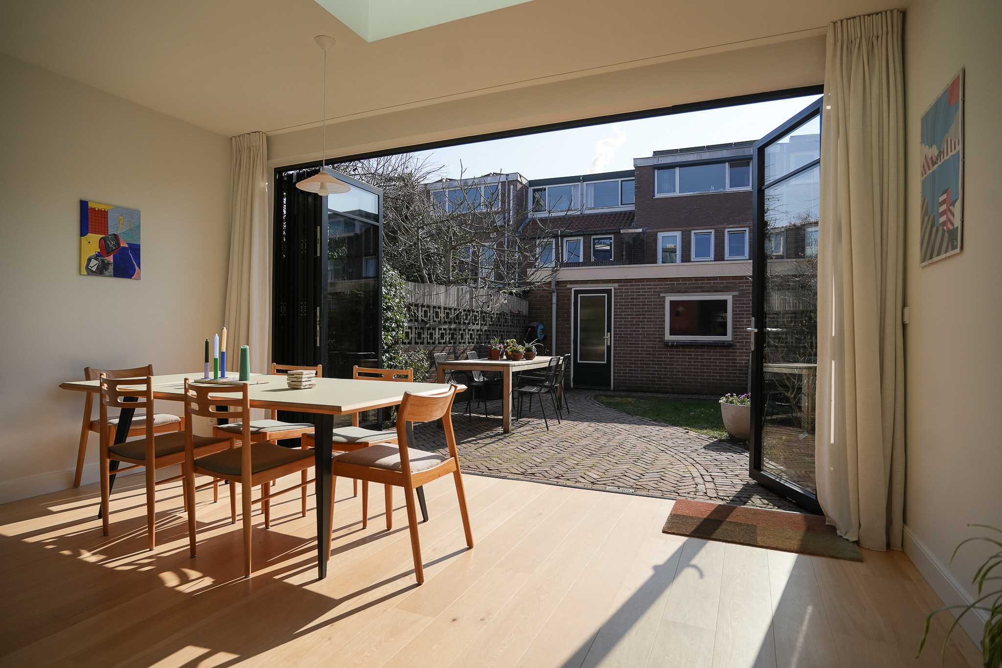 Wat deze woning direct bijzonder maakt, is de fijne leefruimte op de begane grond. Dankzij de uitbouw, de lichtstraat en de grote harmonicadeuren aan de achterzijde is dit een heerlijk licht huis. Zet de harmonicadeuren open en de hele achtergevel opent zich naar de tuin op het zuiden. Zo lopen binnen en buiten op een natuurlijke manier in elkaar over. De strakke afwerking wordt op de eerste verdieping stijlvol voortgezet met twee slaapkamers over de volle breedte en een moderne badkamer. De tweede verdieping is een verdieping waar je als koper nog alle kanten op kunt.