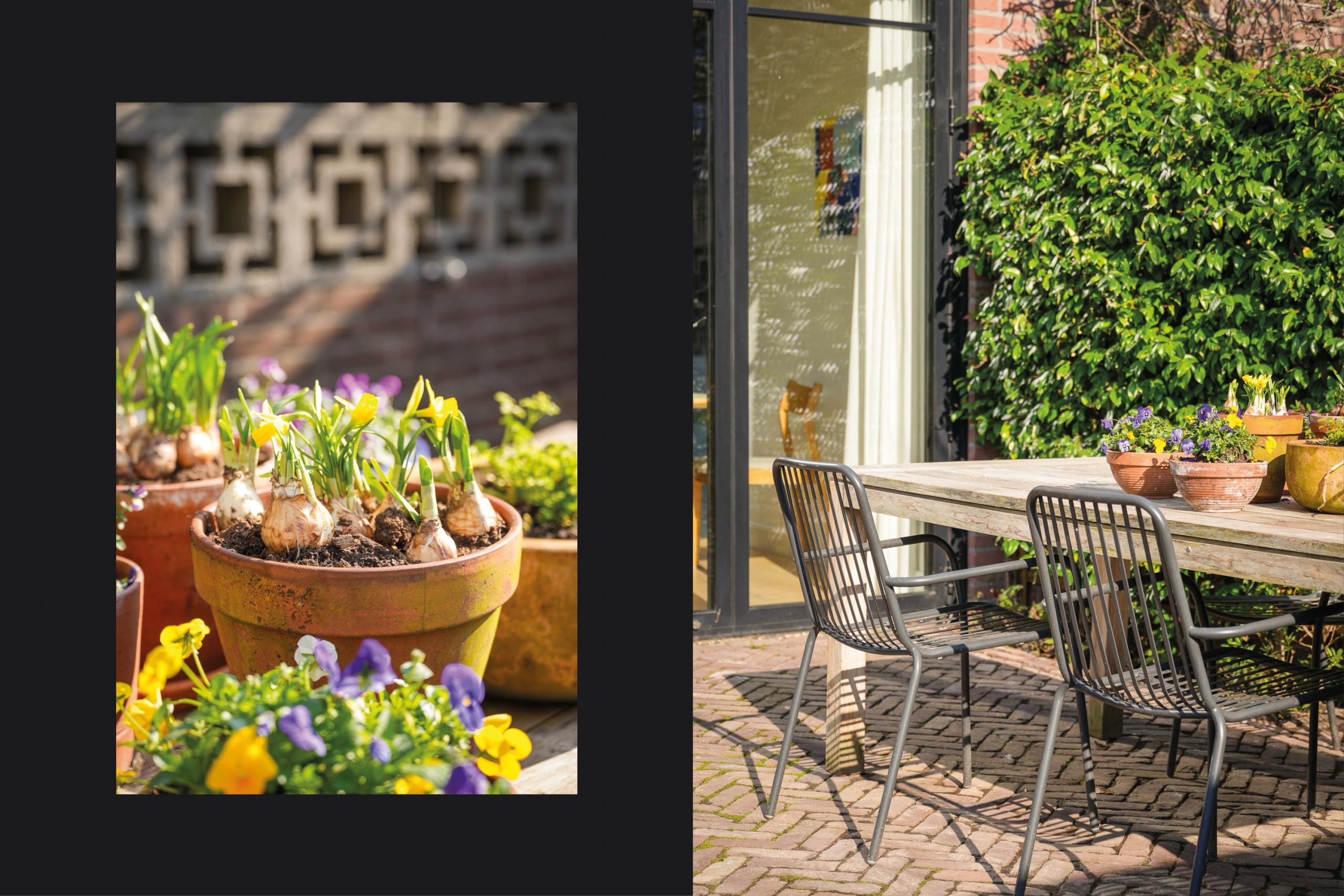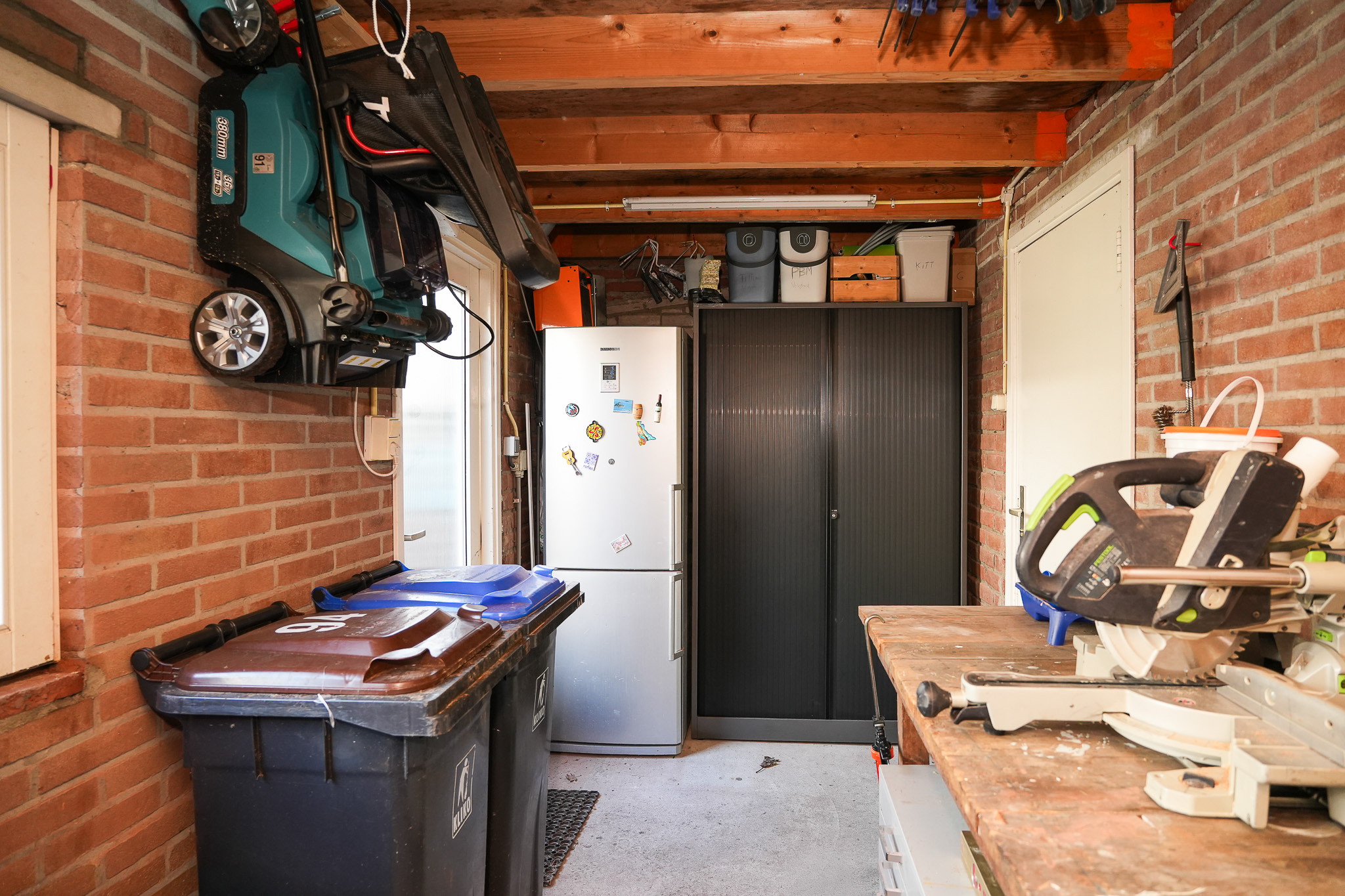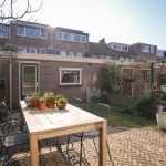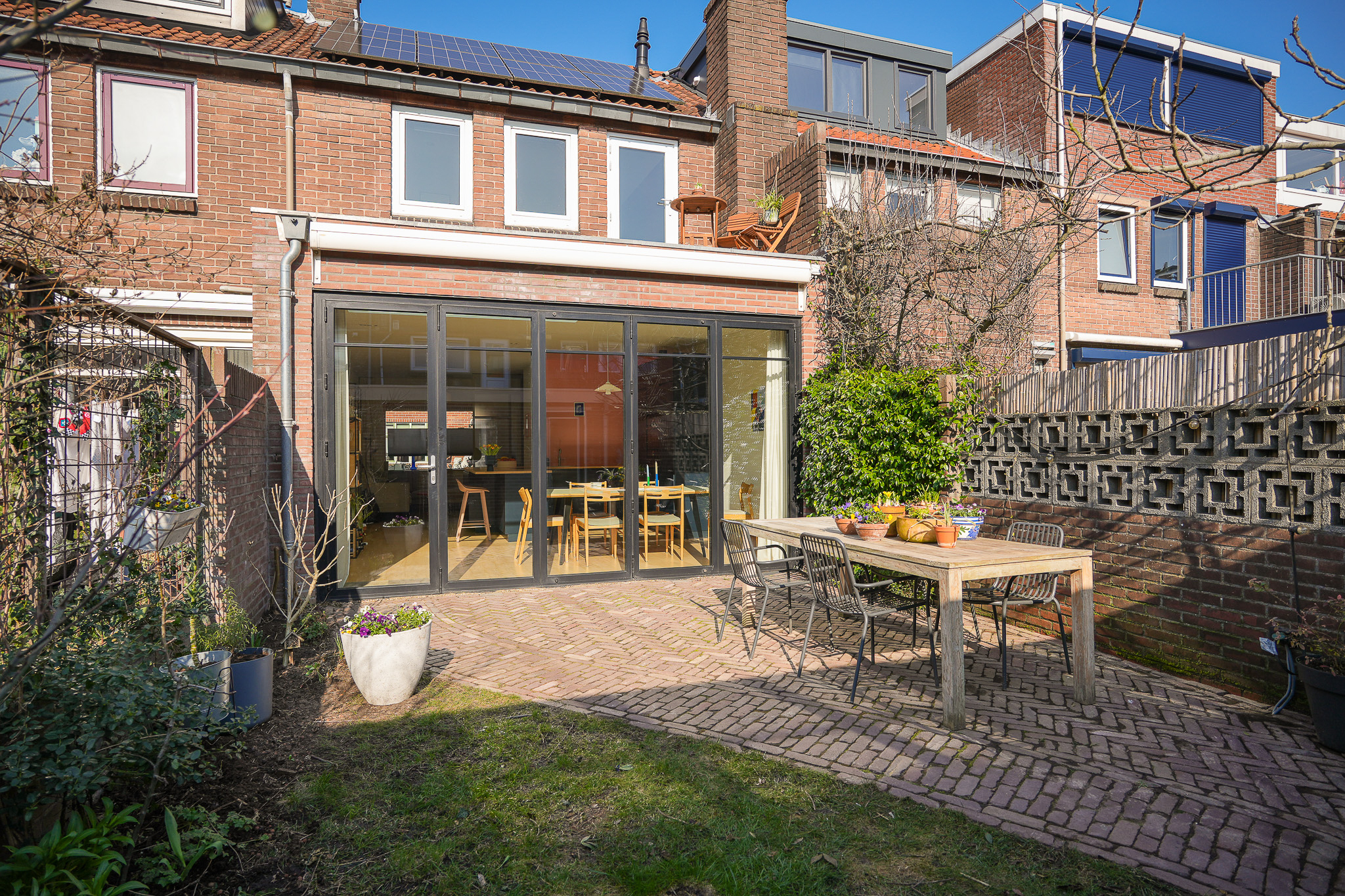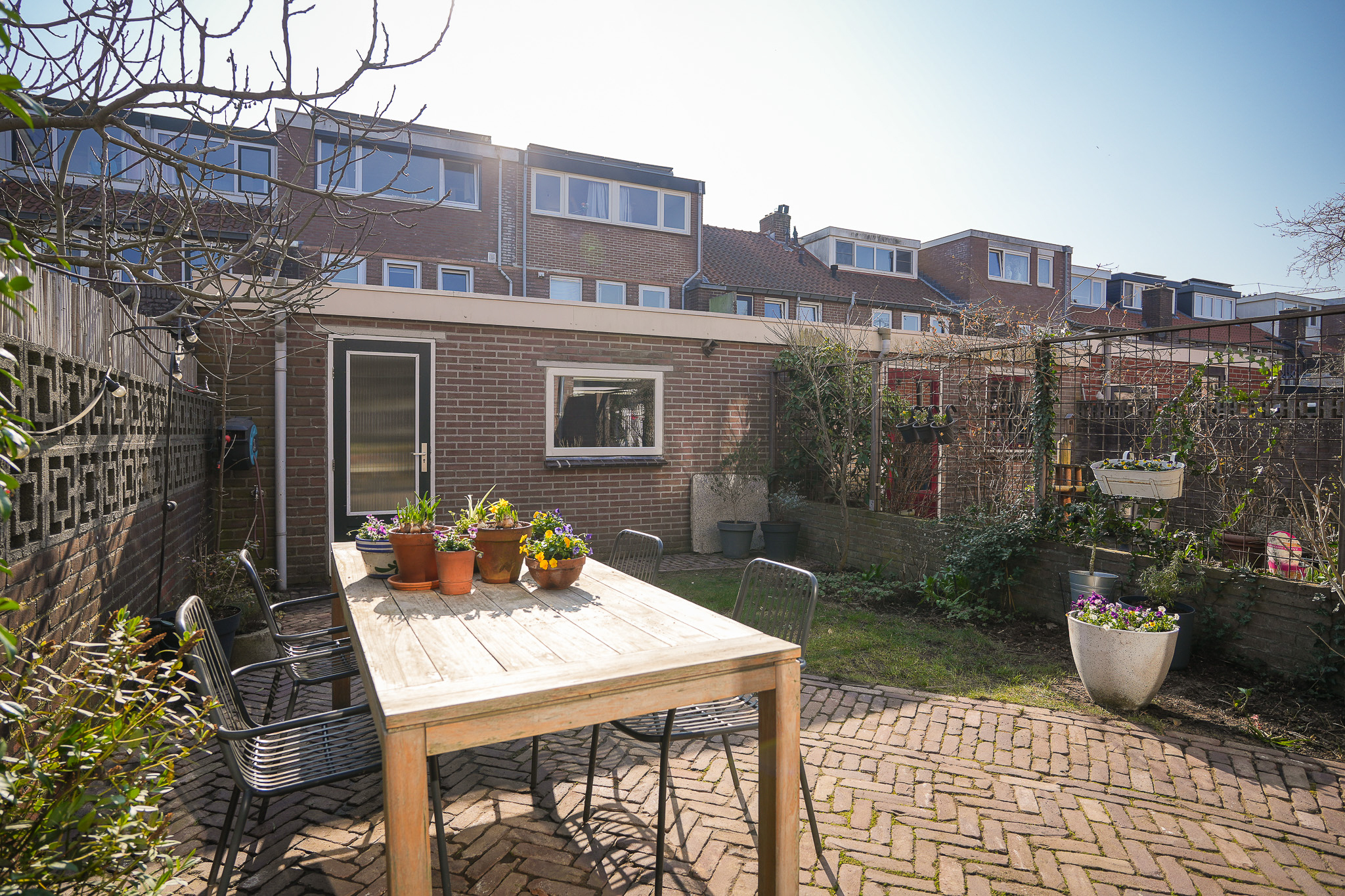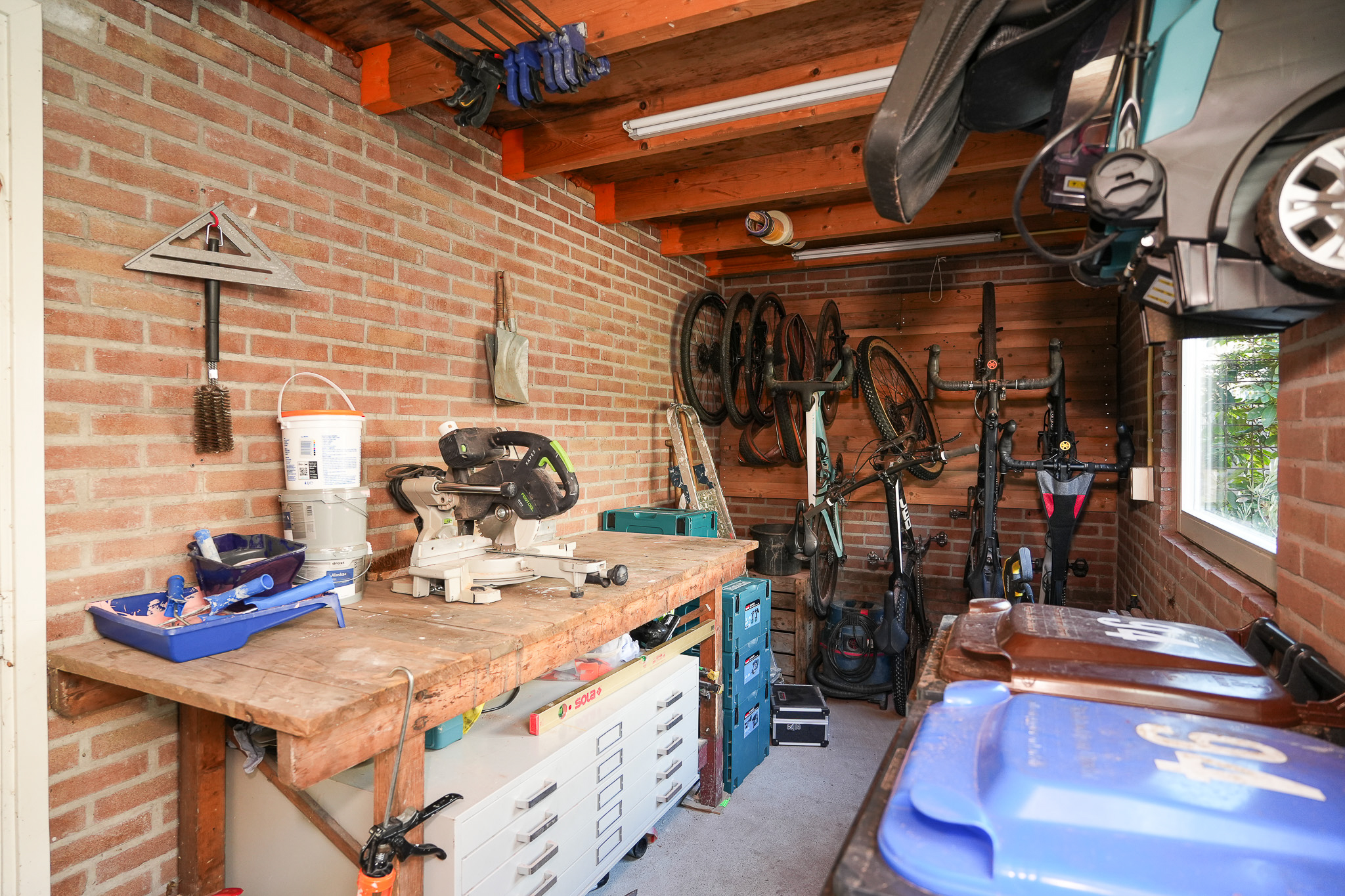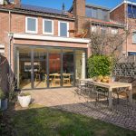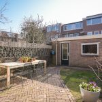 De achtertuin ligt op het zonnige zuiden en is een heerlijke plek om van de zon te genieten. Door de grote harmonicadeuren staan binnen en buiten hier in directe verbinding met elkaar. Aan de achtergevel is bovendien een zonnescherm geplaatst, zodat je op warme dagen ook prettig in de schaduw kunt zitten. Achterin de tuin staat een ruime berging, voorzien van elektra en verlichting. De tuin beschikt daarnaast over een achterom.