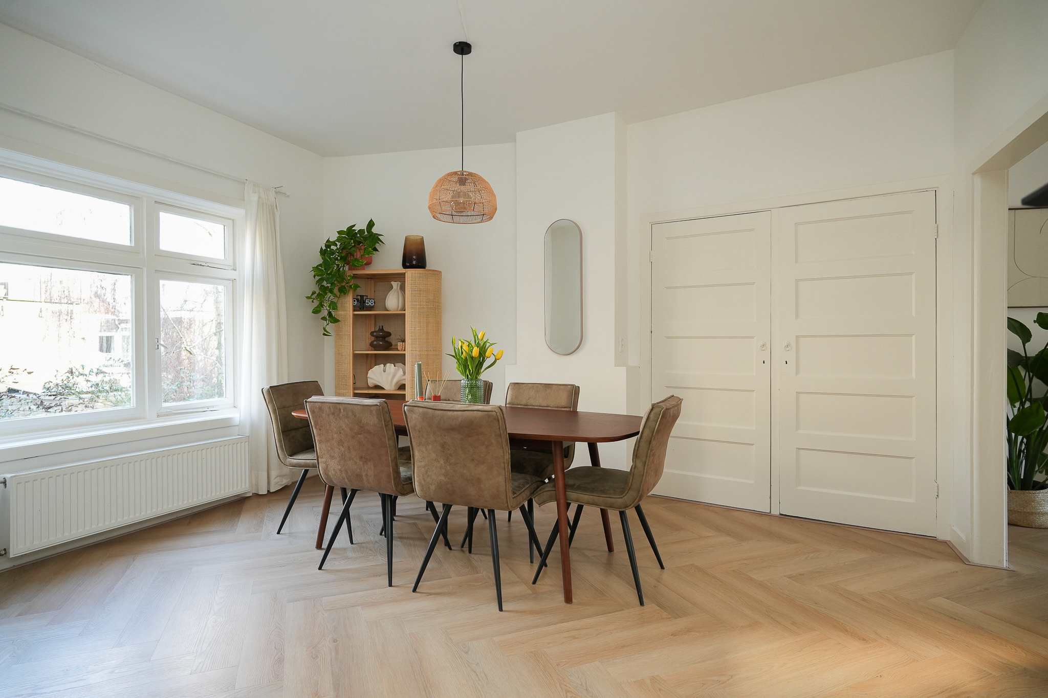 Vanuit de eetkamer loop je door naar de zitkamer aan de voorzijde. Hier zit je heerlijk licht en sfeervol, met de schouw als echte blikvanger. Een fijne plek om te ontspannen, met genoeg ruimte voor een comfortabele zithoek.