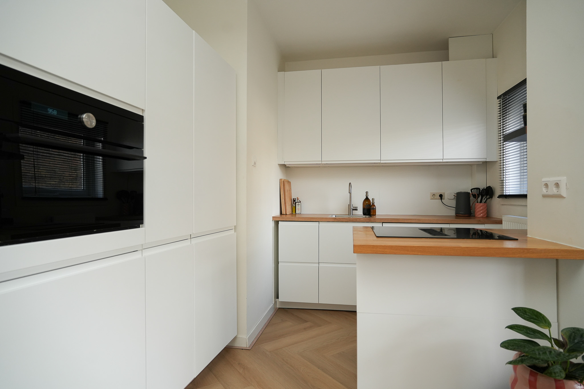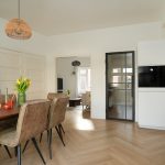 Boven kom je in de hal met ruimte voor garderobe en toegang tot alle vertrekken. Hier vind je ook het moderne toilet met fontein. Vanuit de hal loop je als eerste de eetkamer in met aansluitend de open keuken. Dit is een heerlijke leef plek waar je uitgebreid kunt tafelen en waar koken en gezelligheid vanzelf samenkomen. Extra fijn zijn de twee vaste kasten in de eetkamer, ideaal voor servies, voorraad en alles wat je graag netjes uit het zicht houdt.