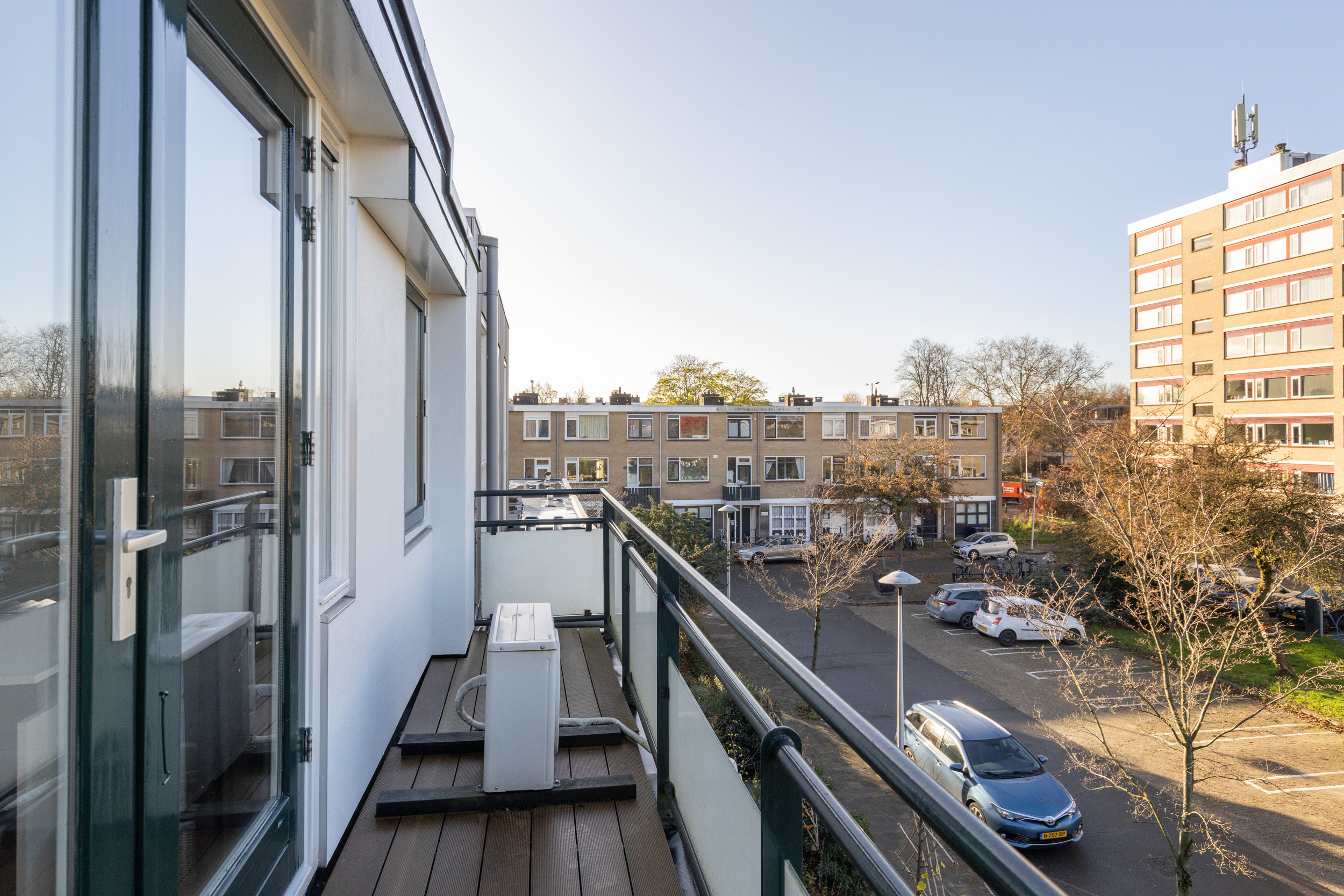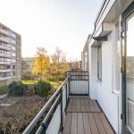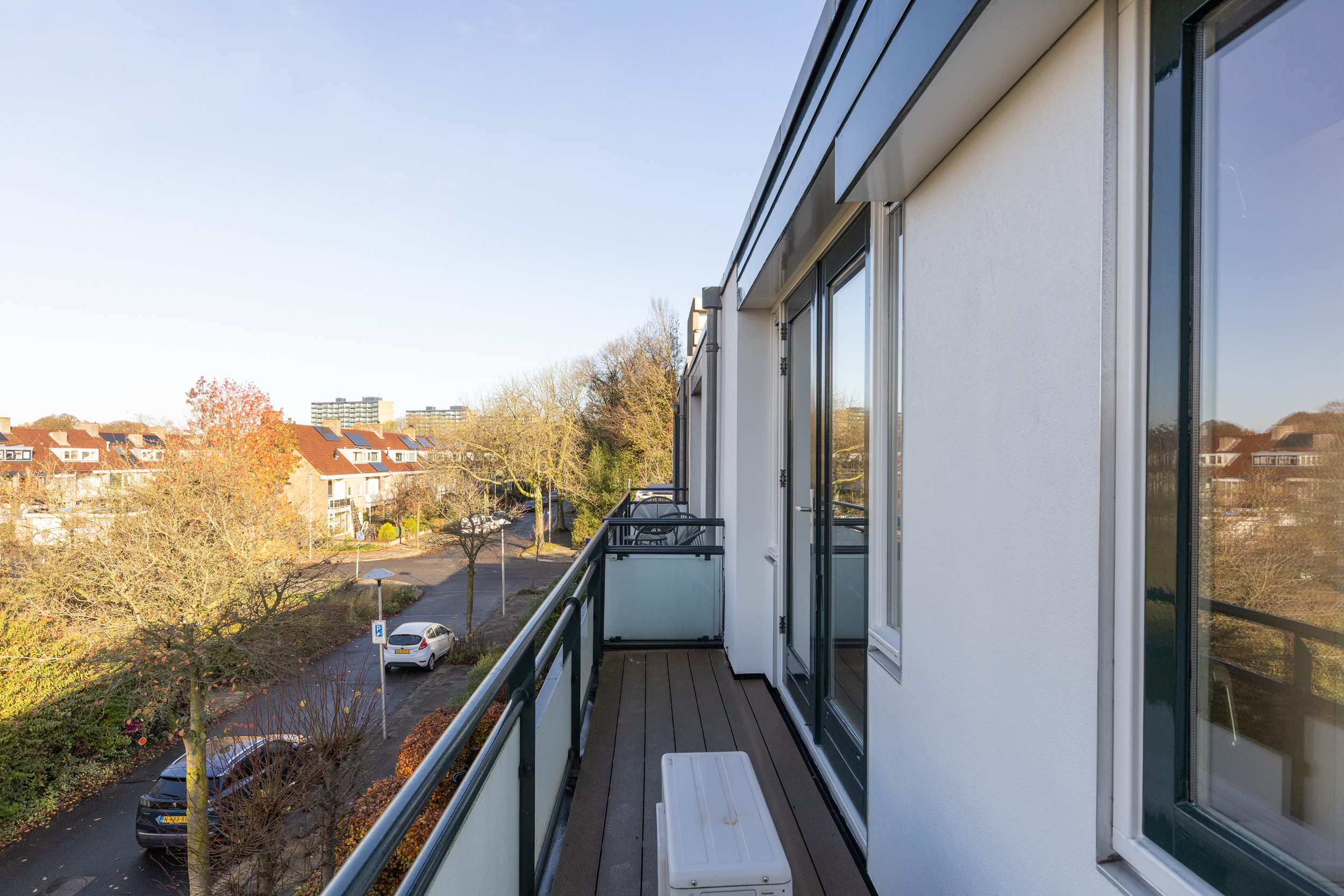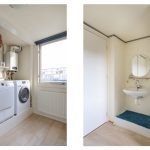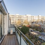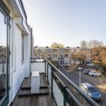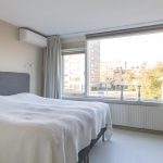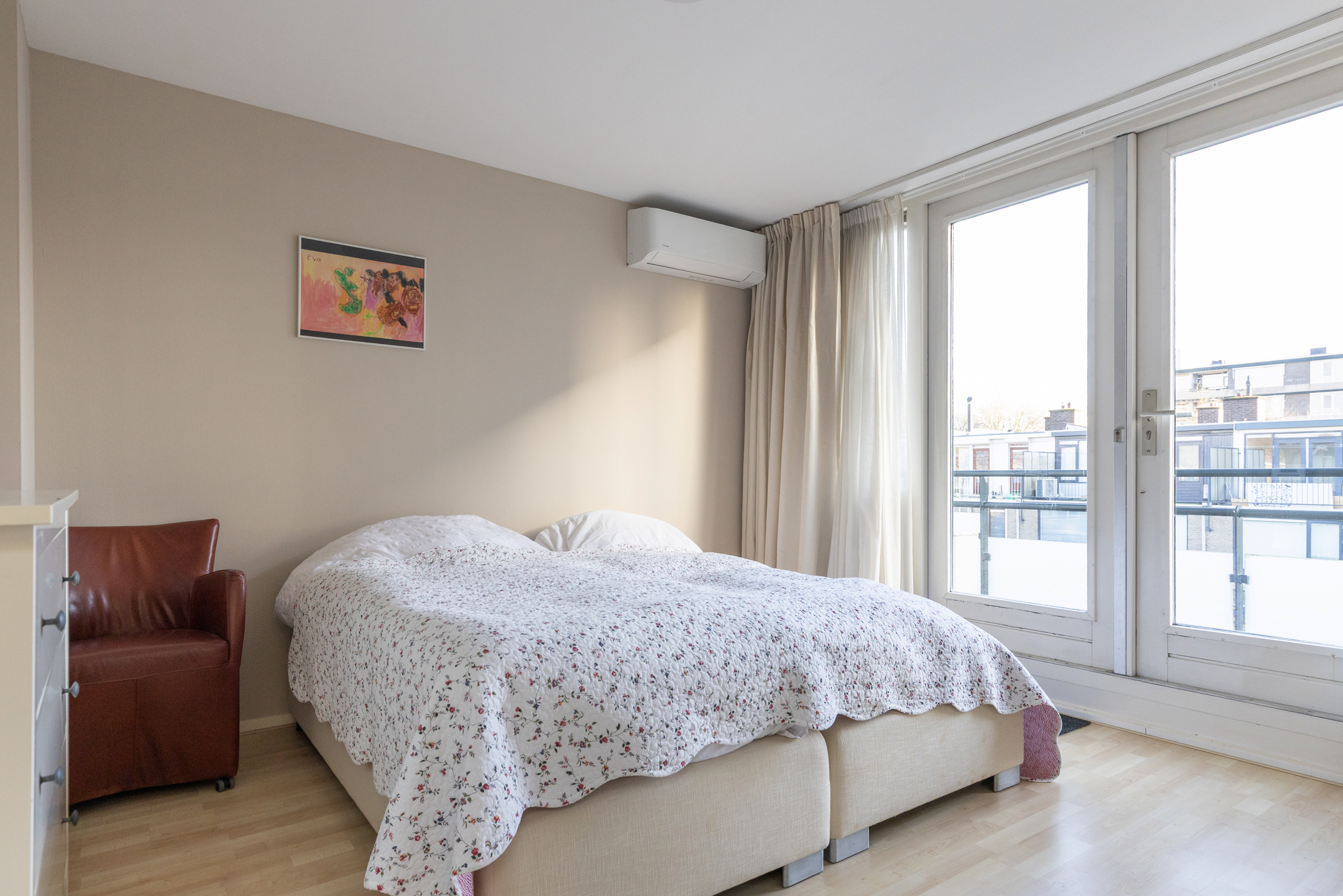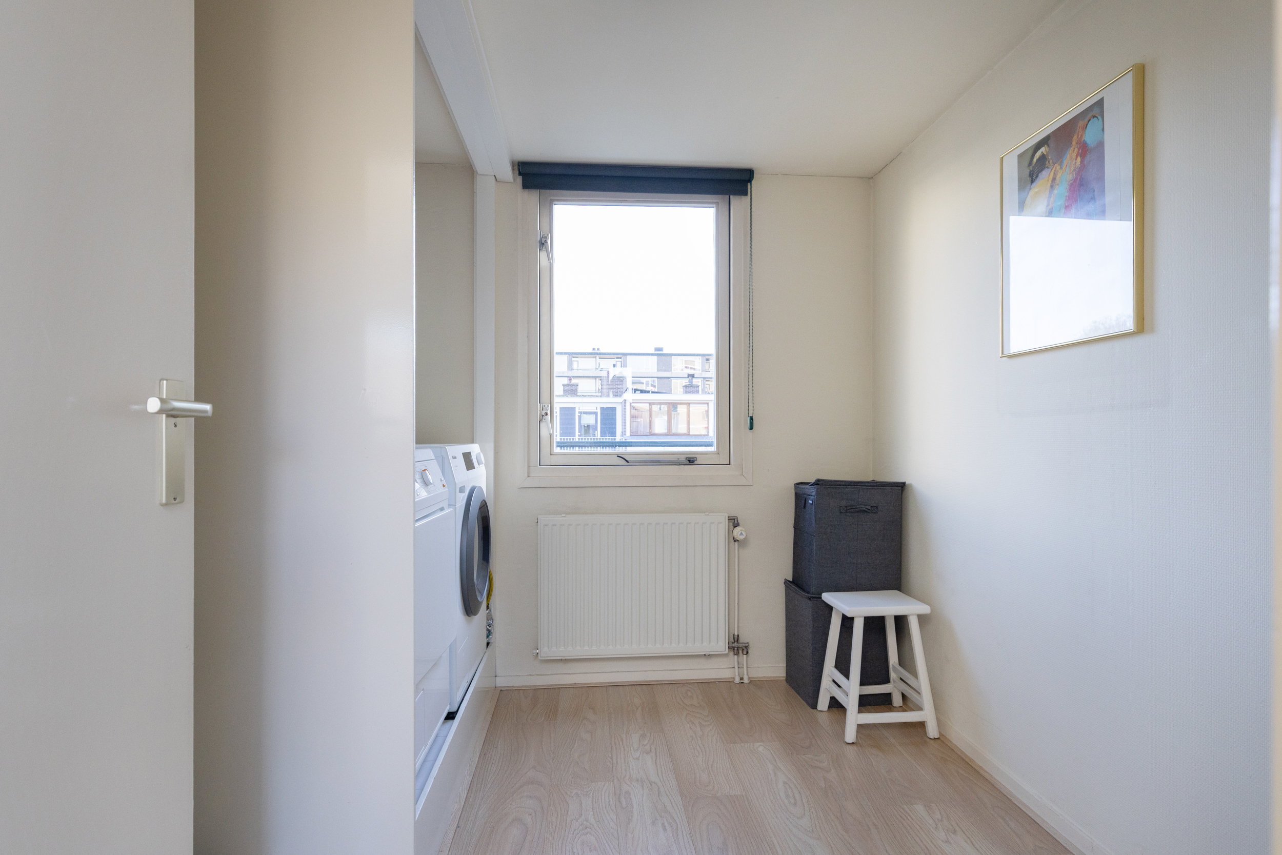 Ook deze etage is verrassend ruim. Hier zijn twee slaapkamers, elk met deuren naar een eigen balkon: één op het oosten en één op het westen. Dankzij het daglicht via het dak en de tweede airco op de achterste kamer is dit een comfortabele en lichte verdieping. In de derde ruimte op deze etage vind je de witgoedaansluitingen, een wastafel en de cv-ketel.