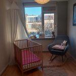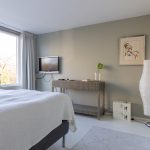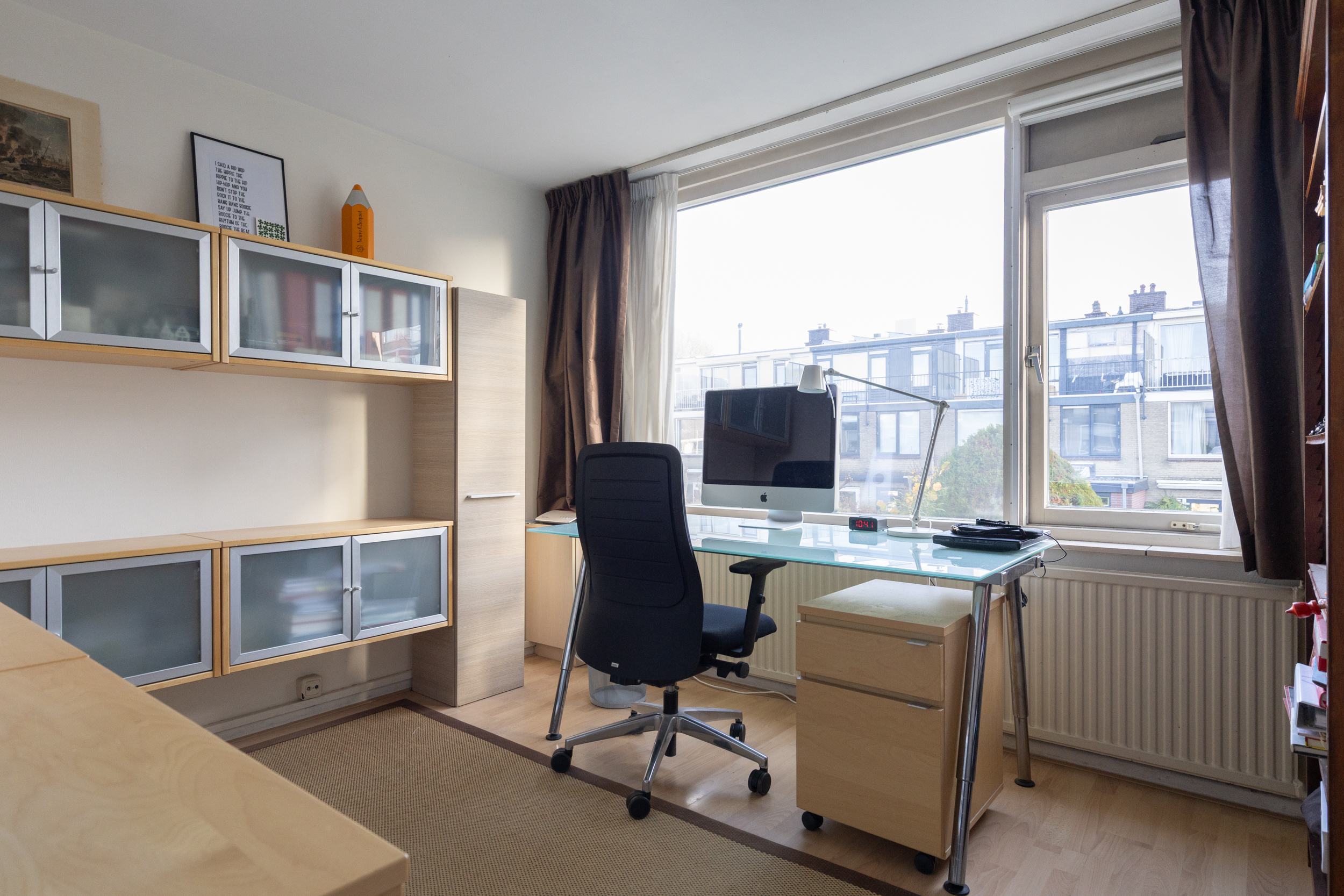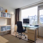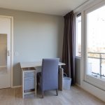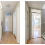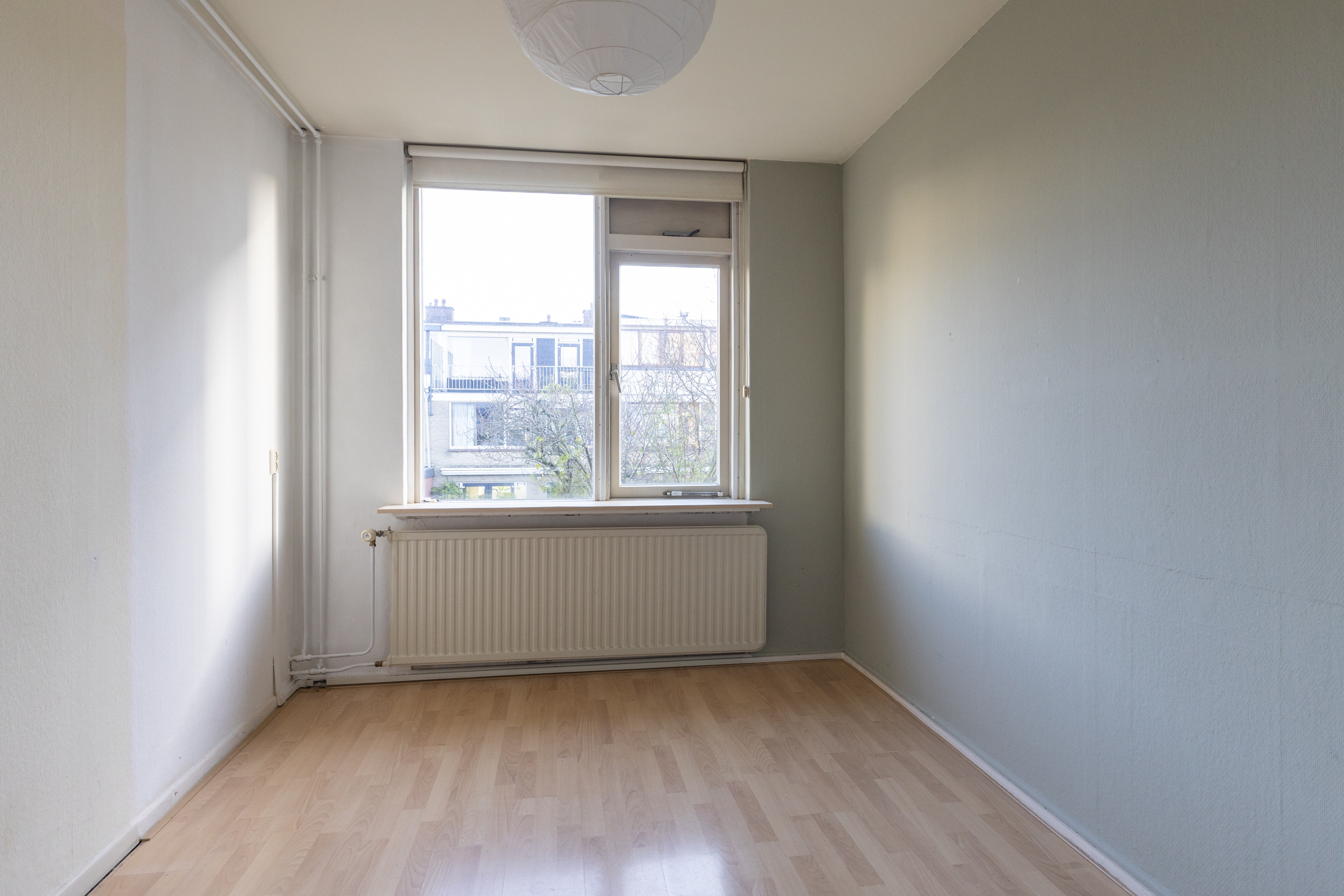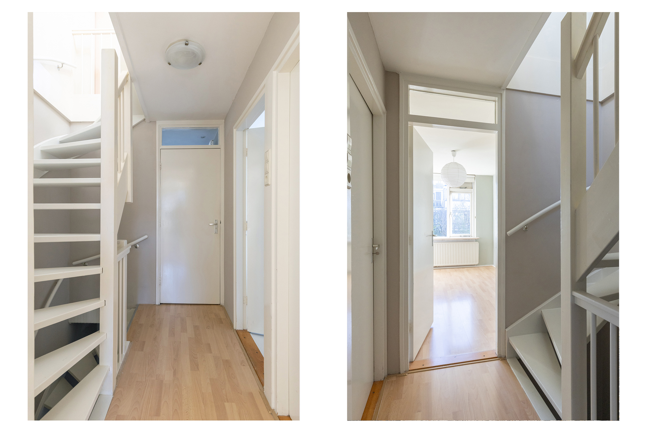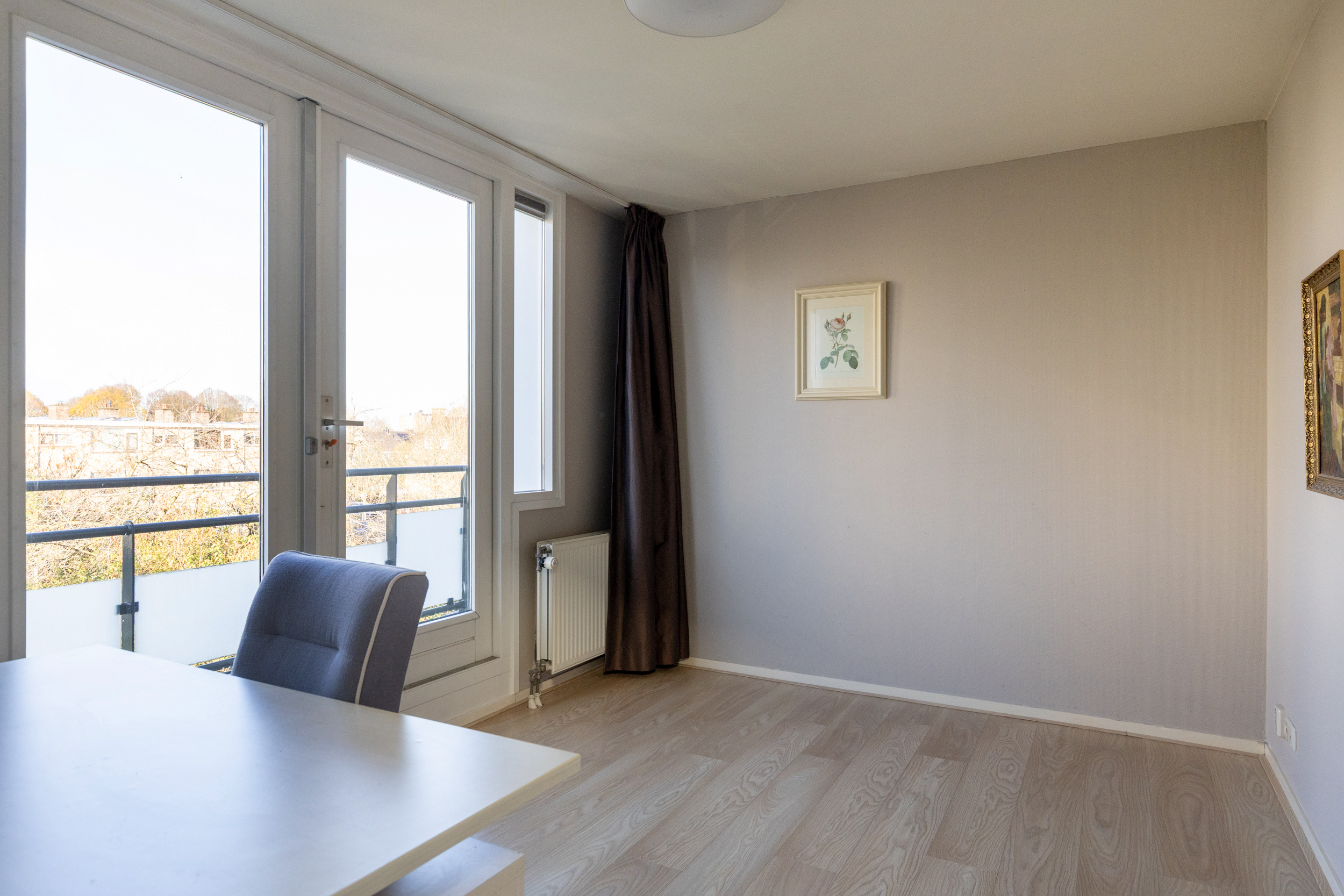 Ook deze etage is verrassend ruim. Hier zijn twee slaapkamers, elk met deuren naar een eigen balkon: één op het oosten en één op het westen. Dankzij het daglicht via het dak en de tweede airco op de achterste kamer is dit een comfortabele en lichte verdieping. In de derde ruimte op deze etage vind je de witgoedaansluitingen, een wastafel en de cv-ketel.