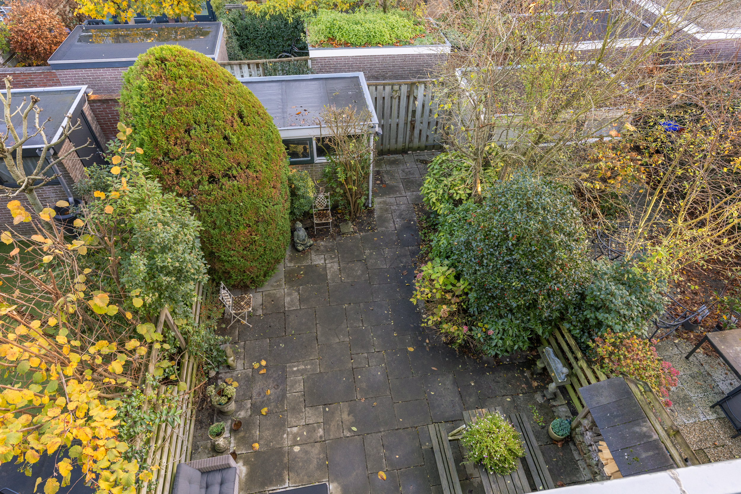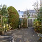 De achtertuin ligt op het oosten en biedt volop privacy en rust. Begin je dag hier met een kop koffie in de zon, of sluit ‘m af met een goed boek onder de zonwering. Achterin de tuin staat een praktische berging en via de achterom loop je zo de wijk in.