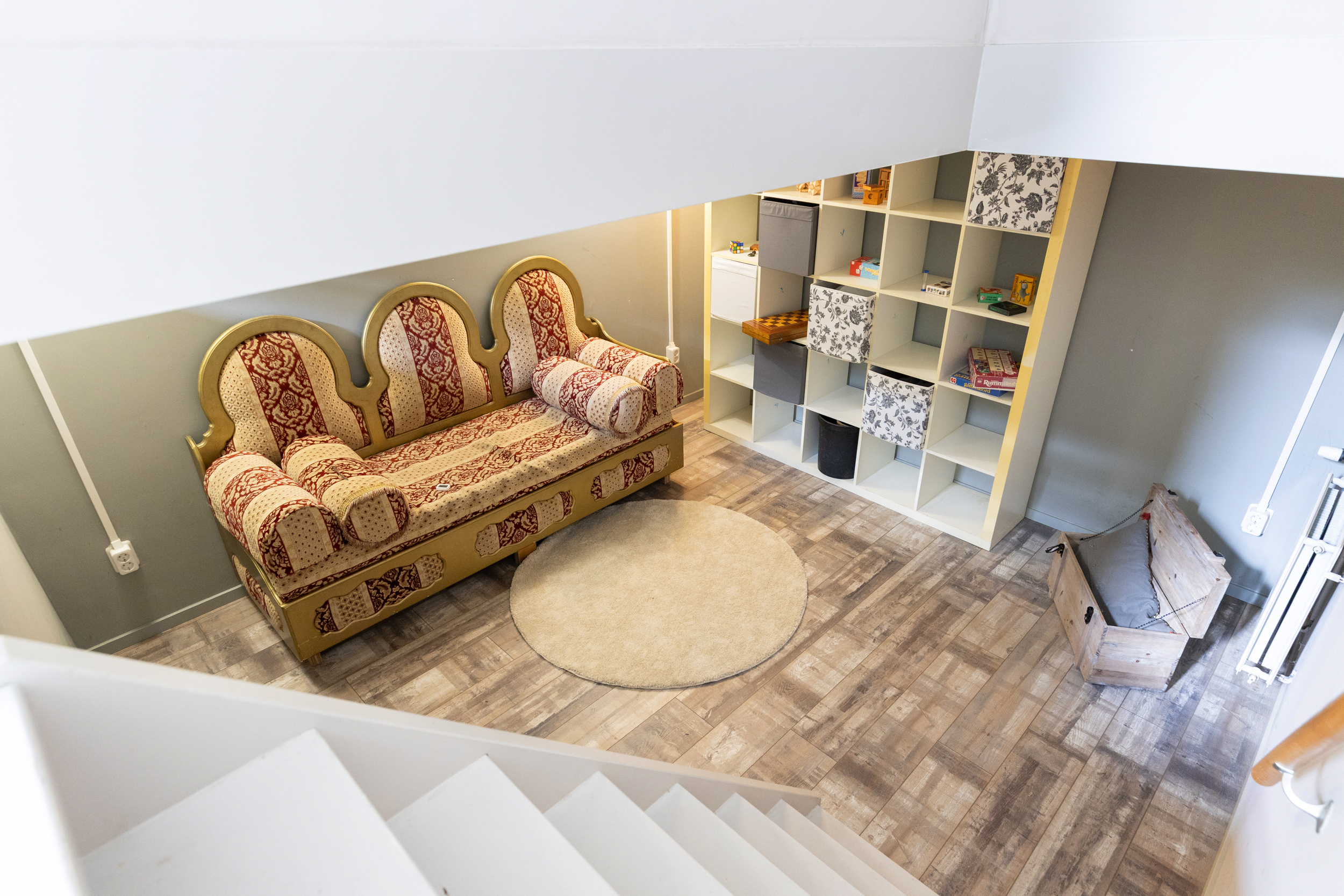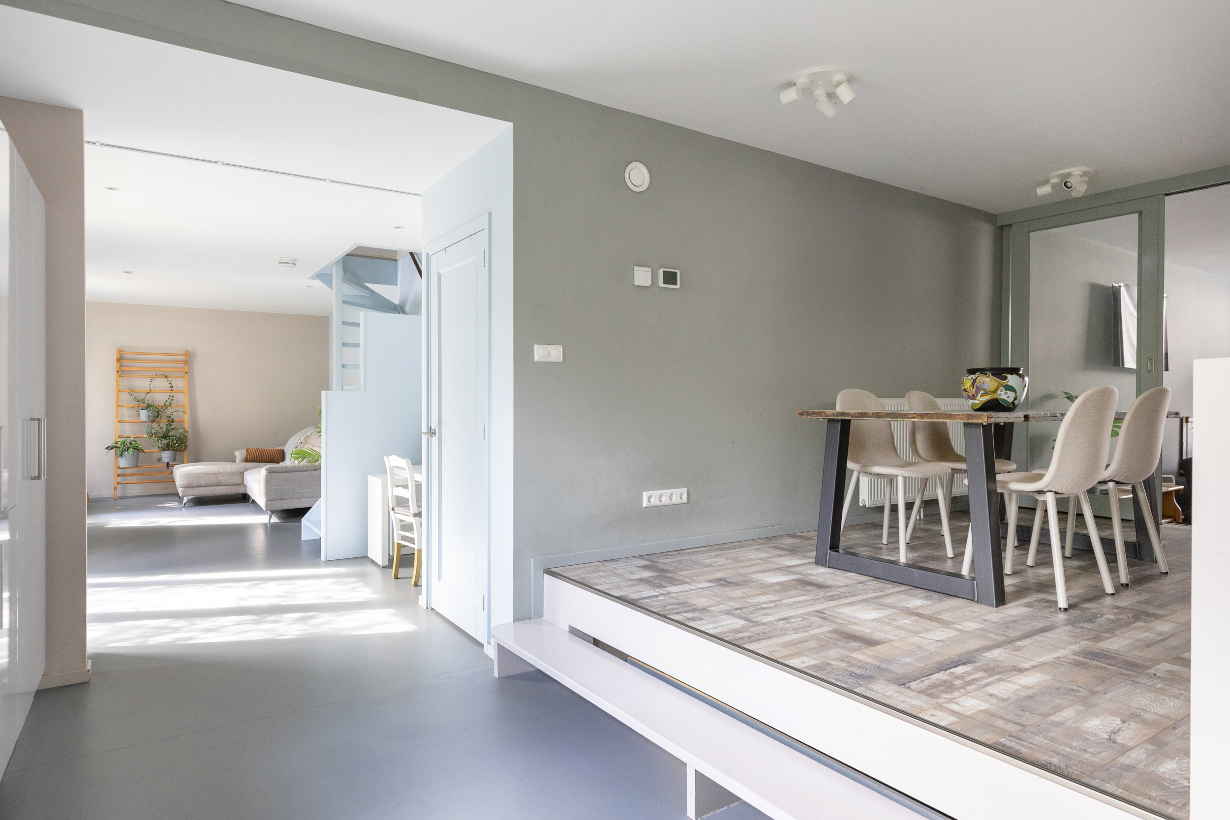 Je komt binnen in de lichte woonkamer met hoge plafonds en grote ramen. De ruimte loopt door naar een gezellige eethoek en moderne keuken, voorzien van inbouwapparatuur en zicht op de tuin. Haaks op de keuken bevindt zich de tweede woonkamer, die perfect kan dienen als werkplek, speelhoek of tv-kamer. Keuken en tweede woonkamer hebben vloerverwarming. Verder beschikt de begane grond over een slaapkamer met eigen sanitair, een halletje met achterdeur, een apart toilet en een handige bergkast.