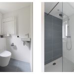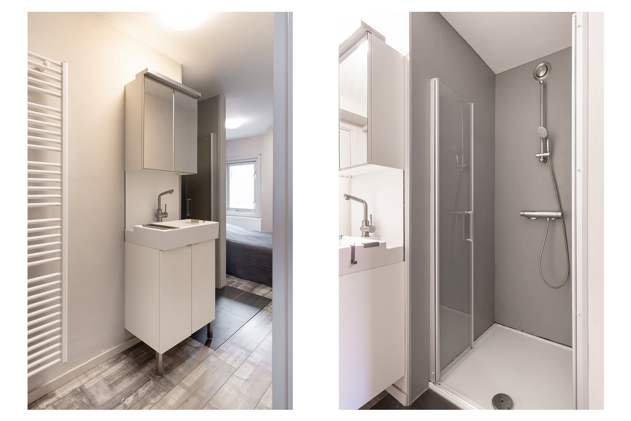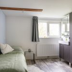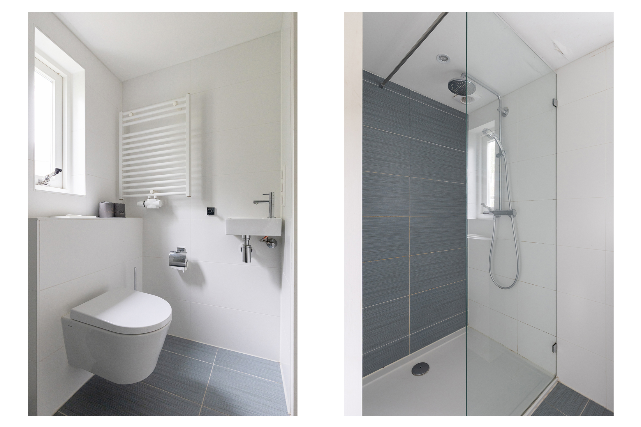 Op de eerste verdieping zijn twee slaapkamers met ramen / frans balkon naar de tuin, beide voorzien van een wastafelmeubel en een spiegelkast. In september kun je vanuit de slaapkamer een appel plukken! Verder op deze verdieping een badkamer met douche en toilet.