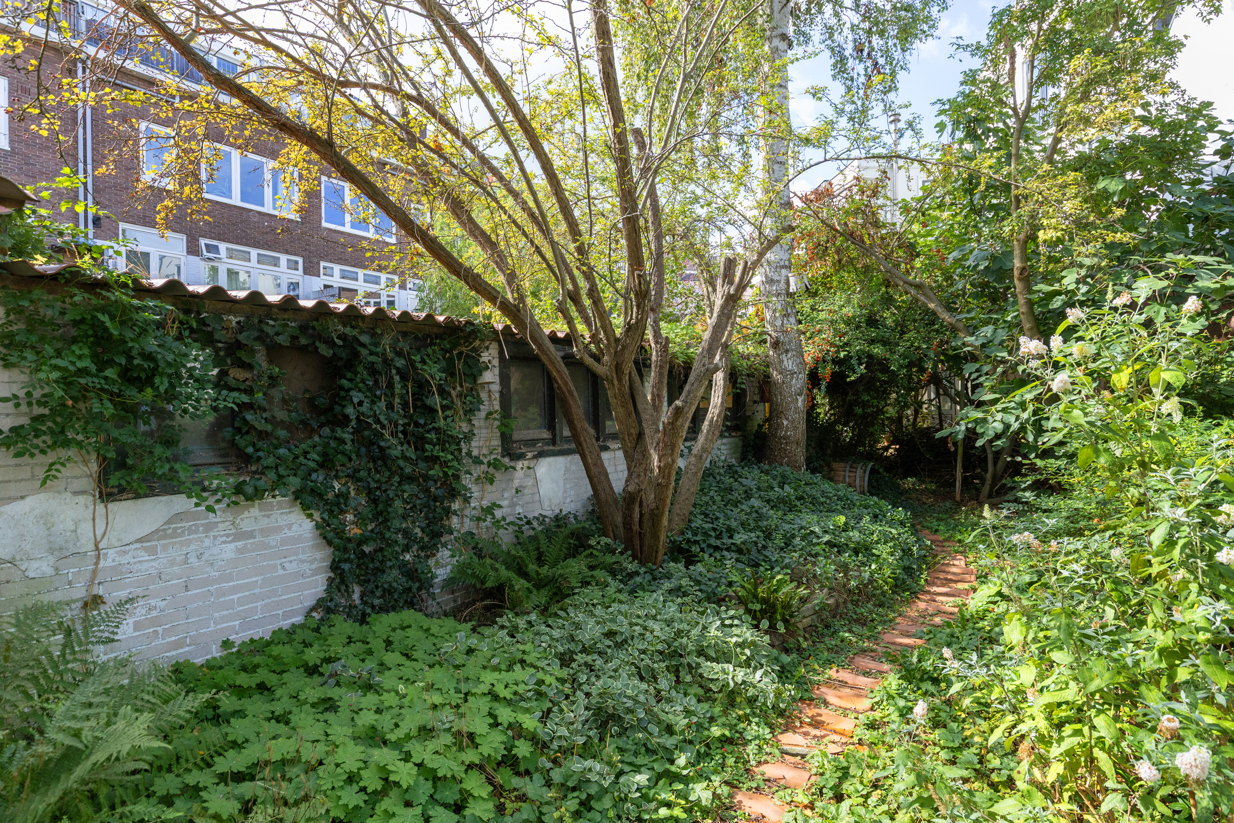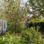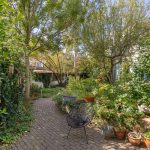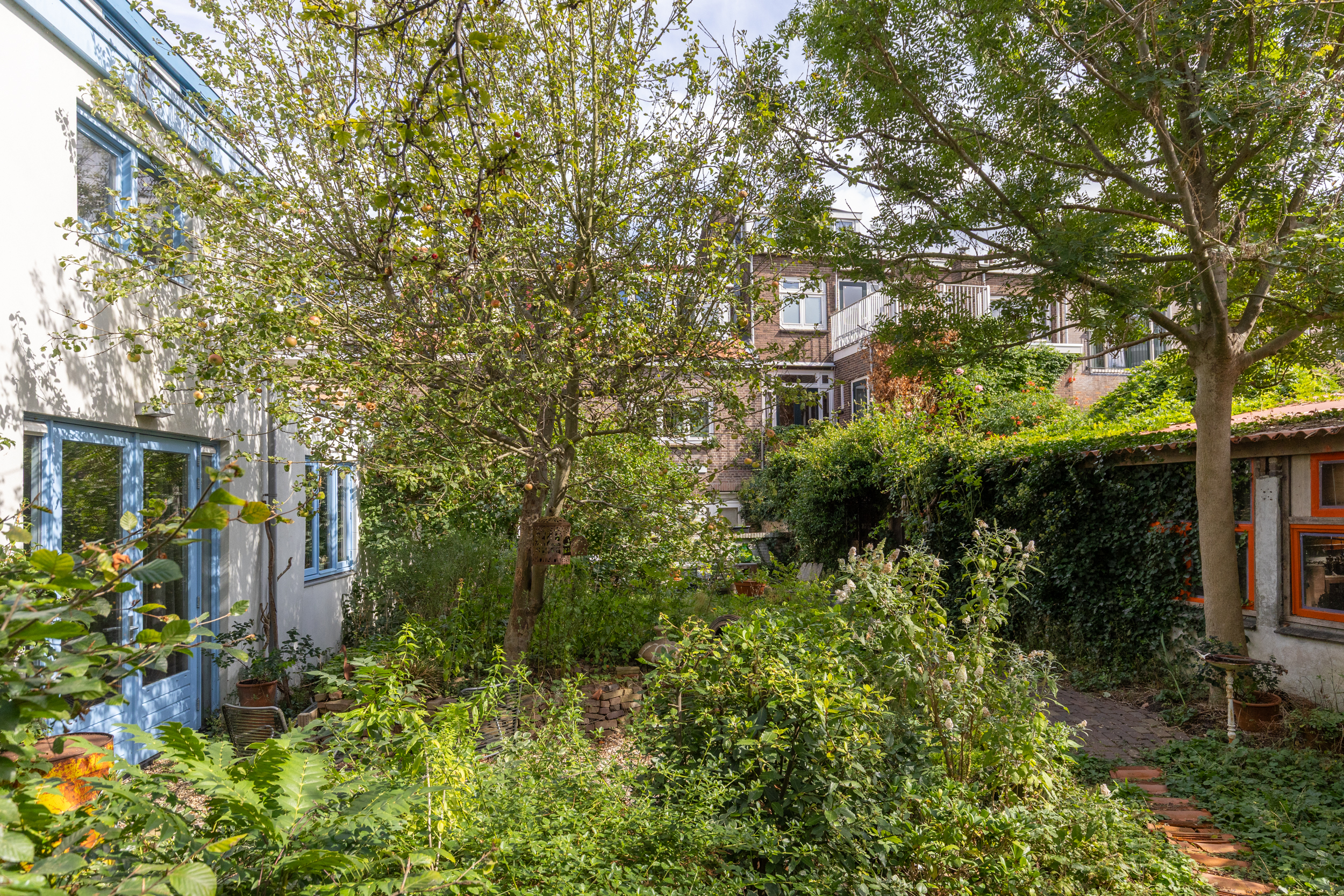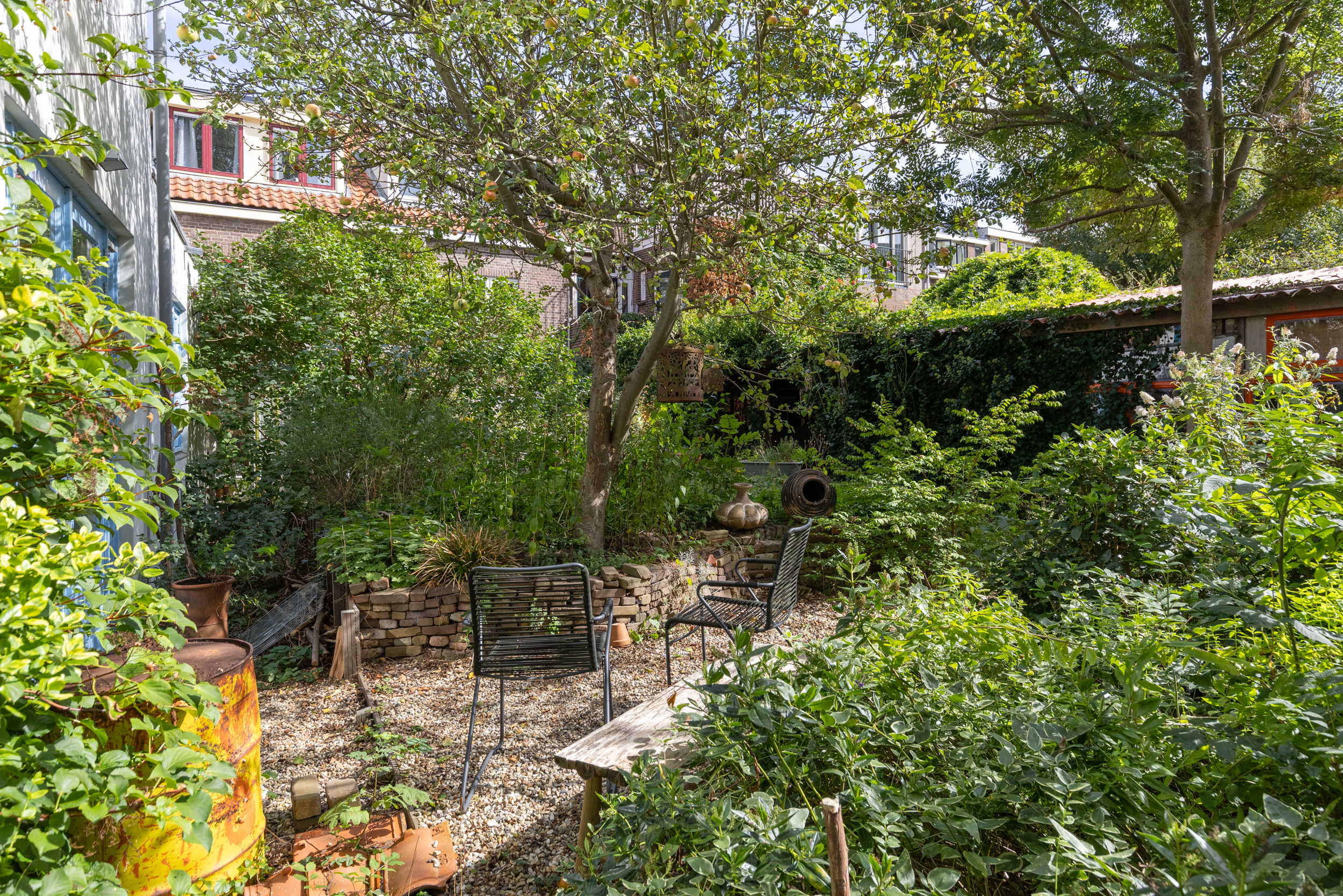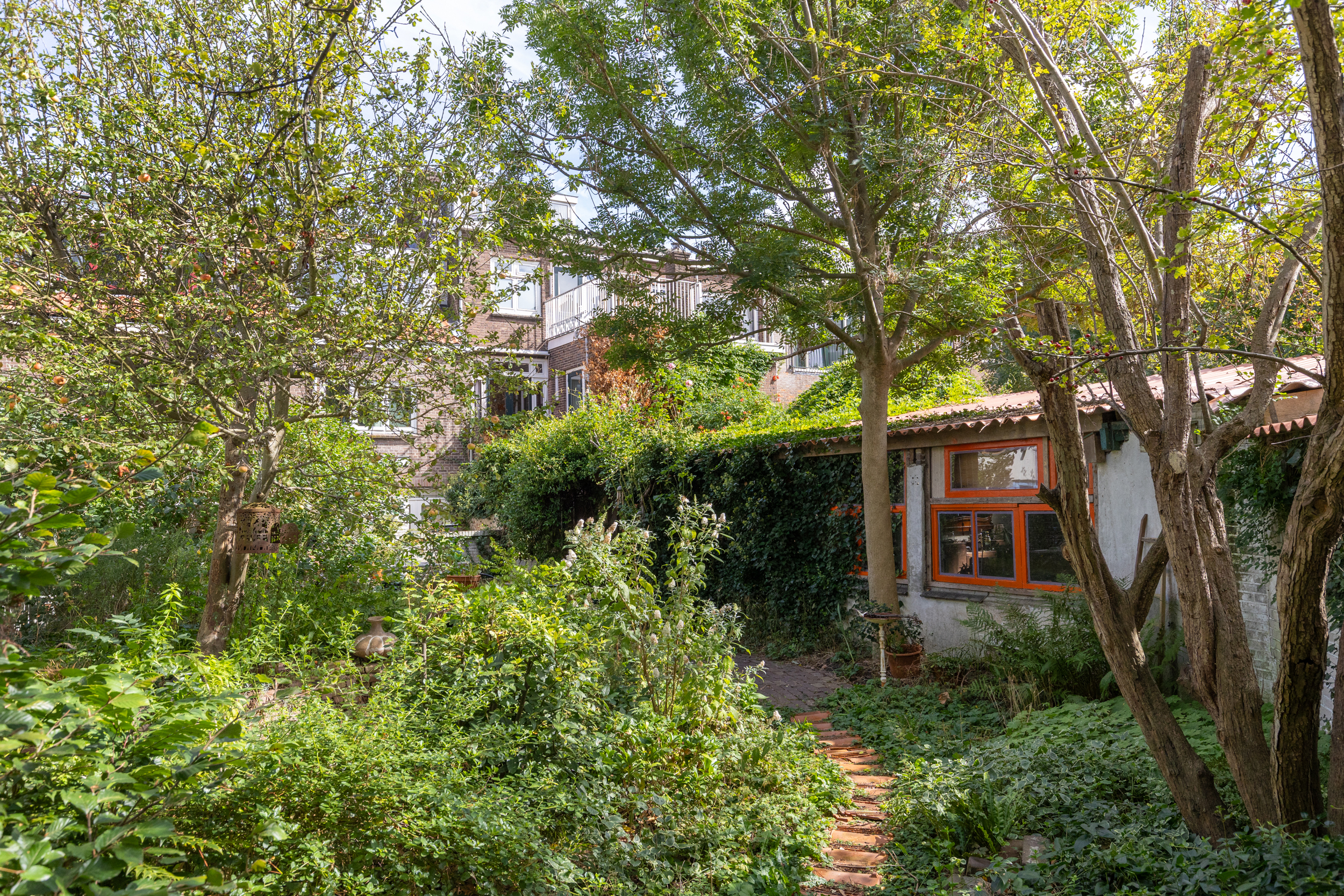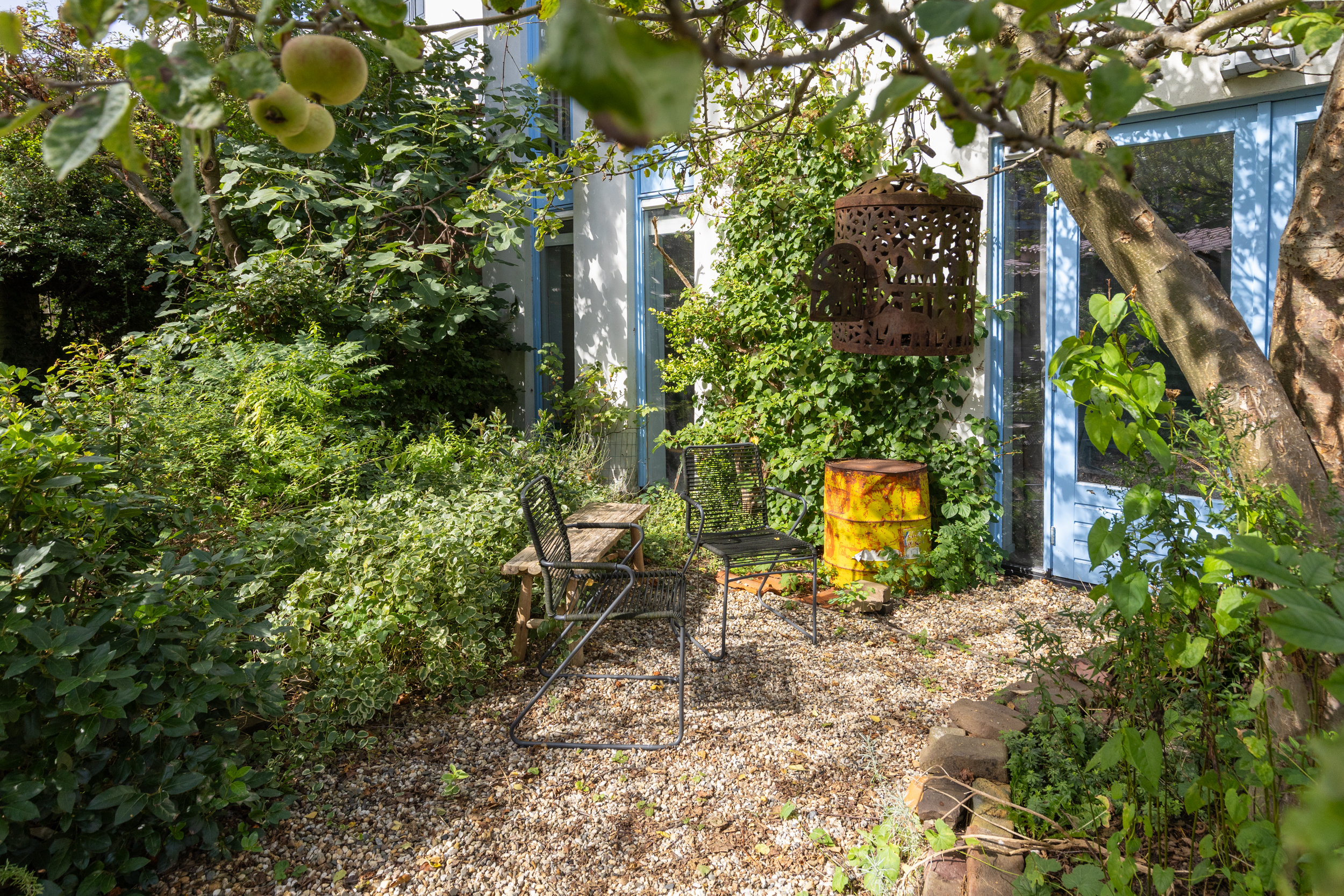 Wat de woning helemaal uniek maakt is de grote binnentuin met eigen opstallen, in totaal 350 m2, bereikbaar via een poort aan de straat. De boomrijke tuin, met o.a. James Grieve appels, vijgen, zwarte bessen en frambozen, ligt op het zuidwesten en heeft de hele dag zon. Zoals op de foto’s is te zien is een deel van de opstallen ingericht als een wel heel bijzondere chillplek.