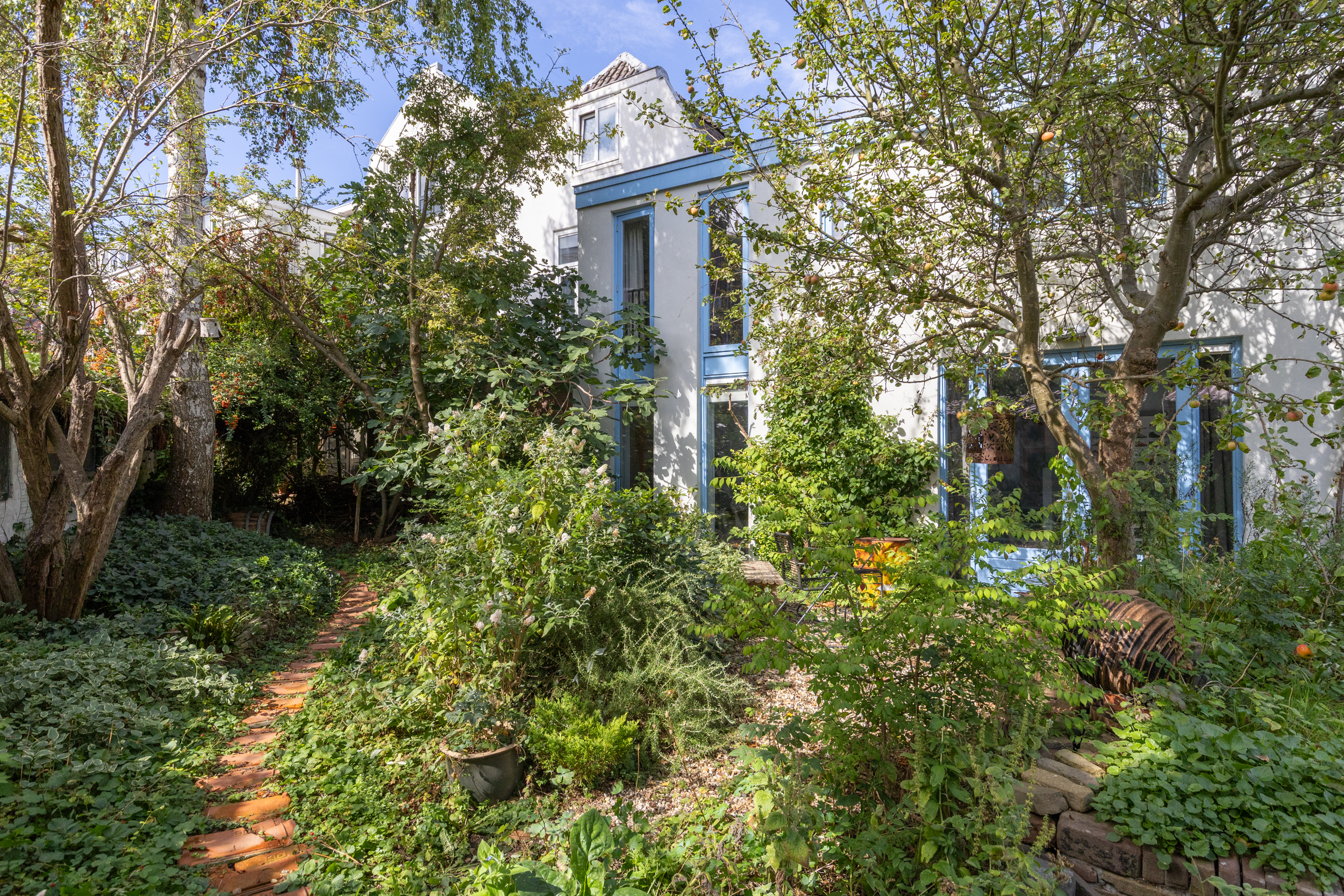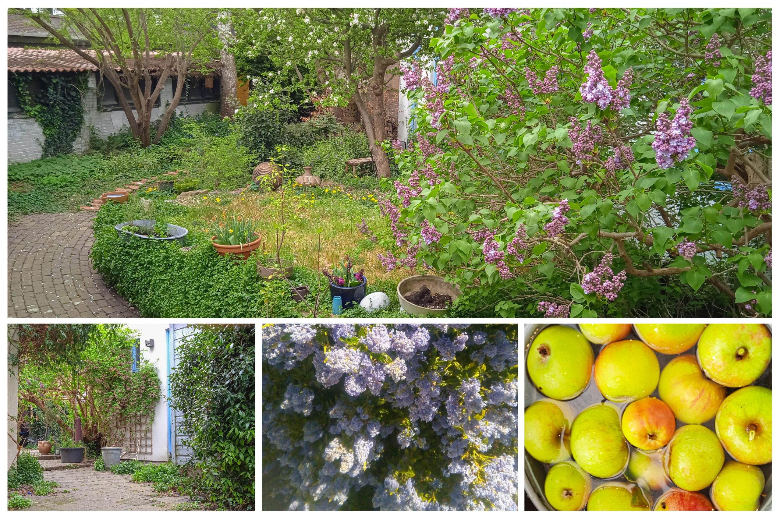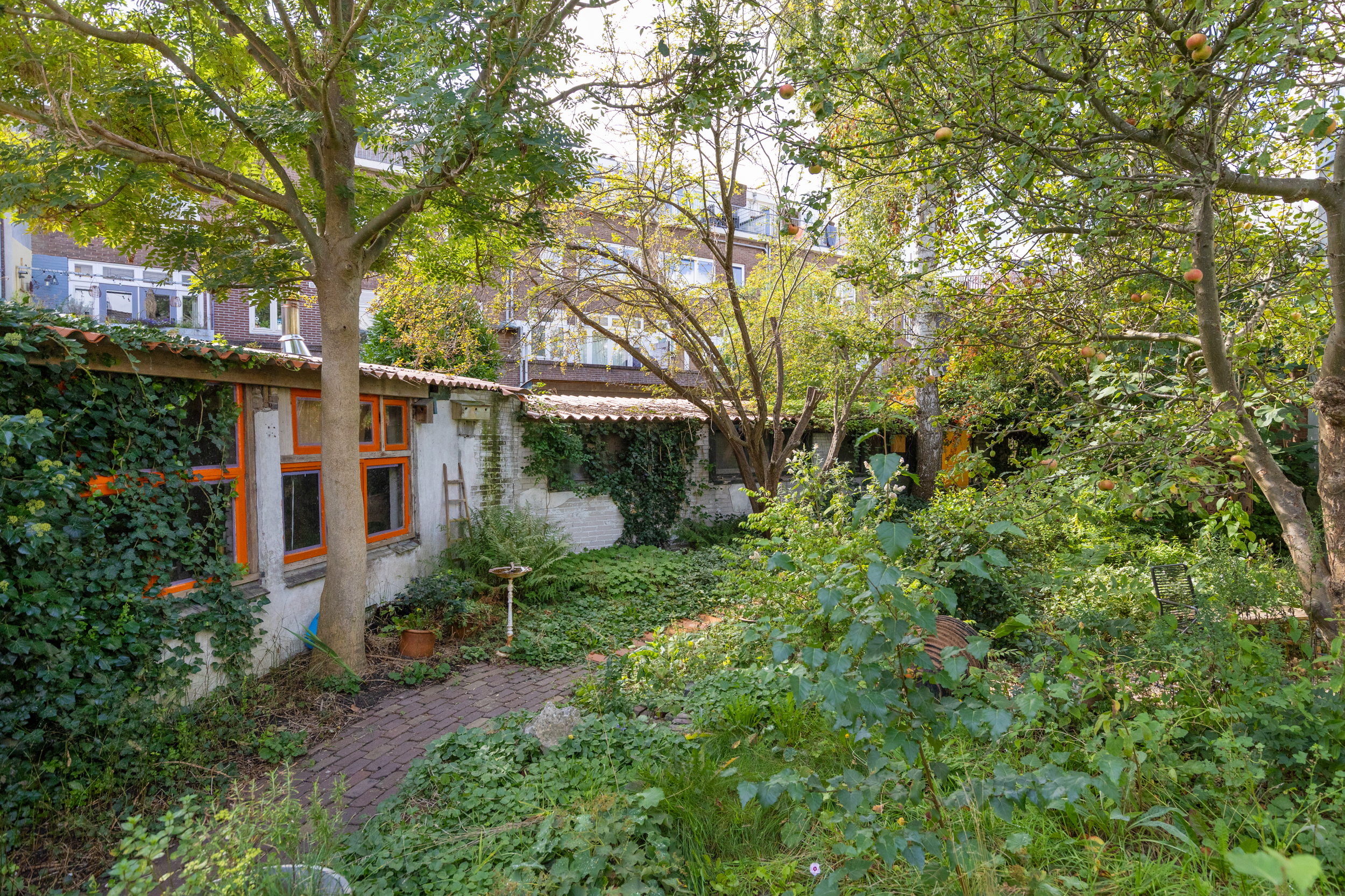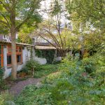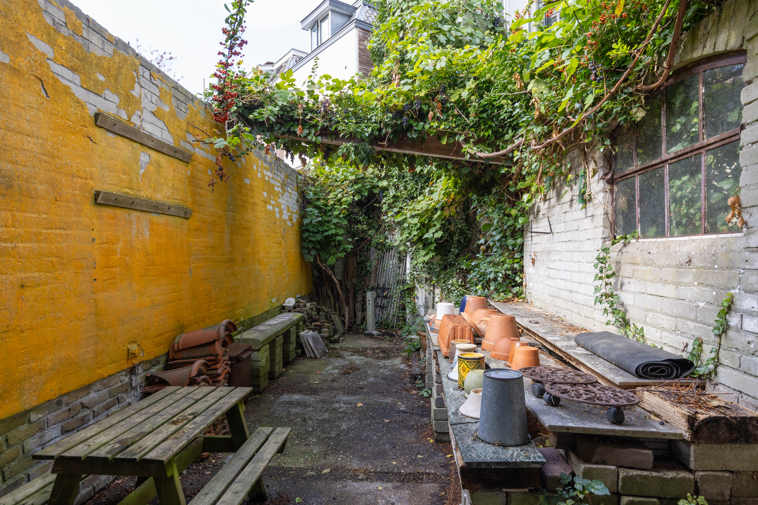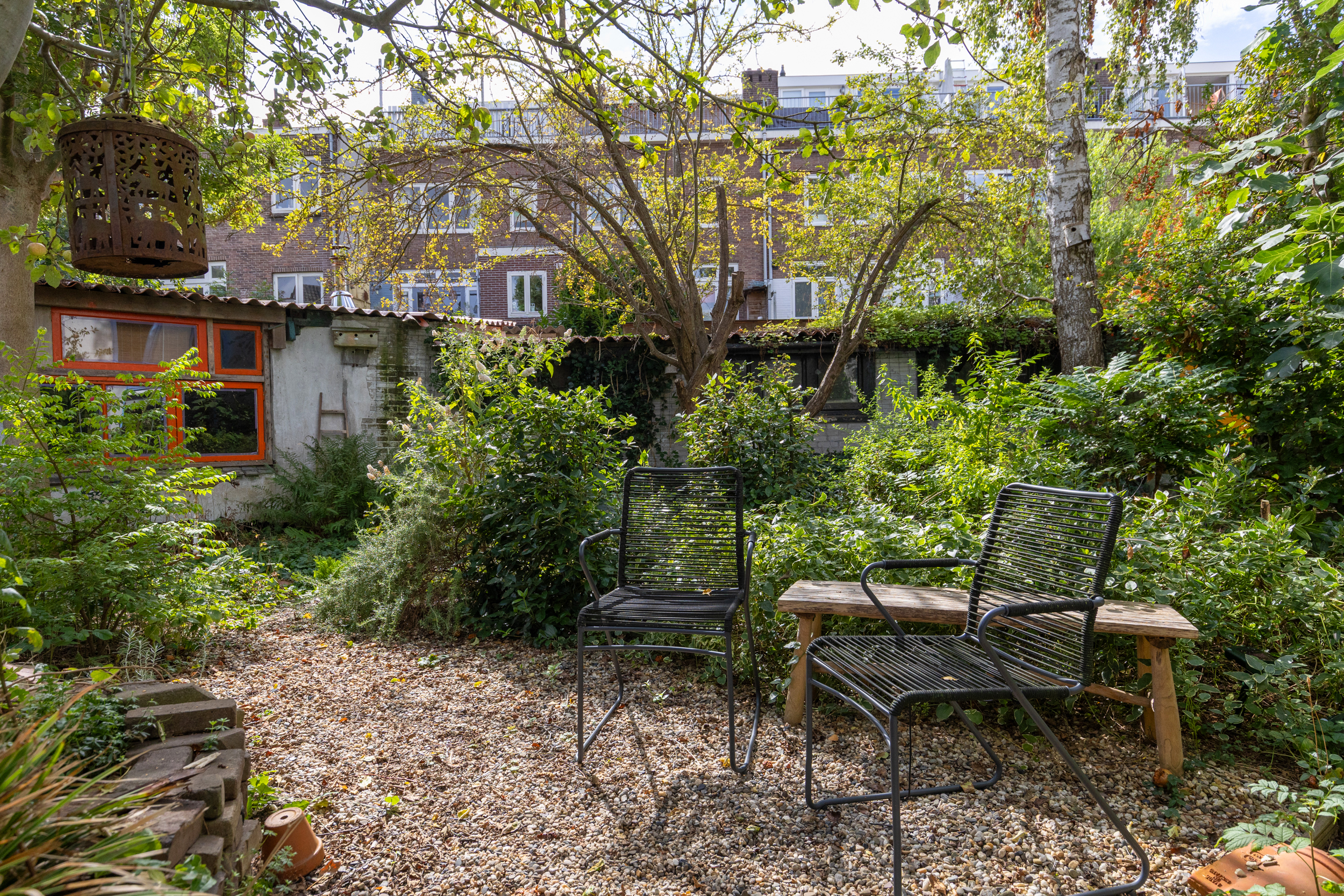 Wat de woning helemaal uniek maakt is de grote binnentuin met eigen opstallen, in totaal 350 m2, bereikbaar via een poort aan de straat. De boomrijke tuin, met o.a. James Grieve appels, vijgen, zwarte bessen en frambozen, ligt op het zuidwesten en heeft de hele dag zon. Zoals op de foto’s is te zien is een deel van de opstallen ingericht als een wel heel bijzondere chillplek.