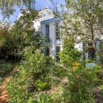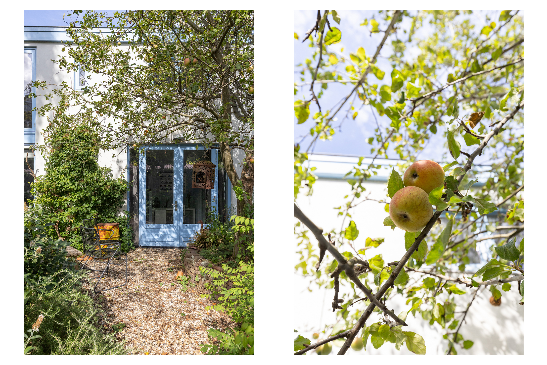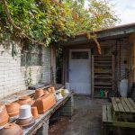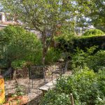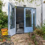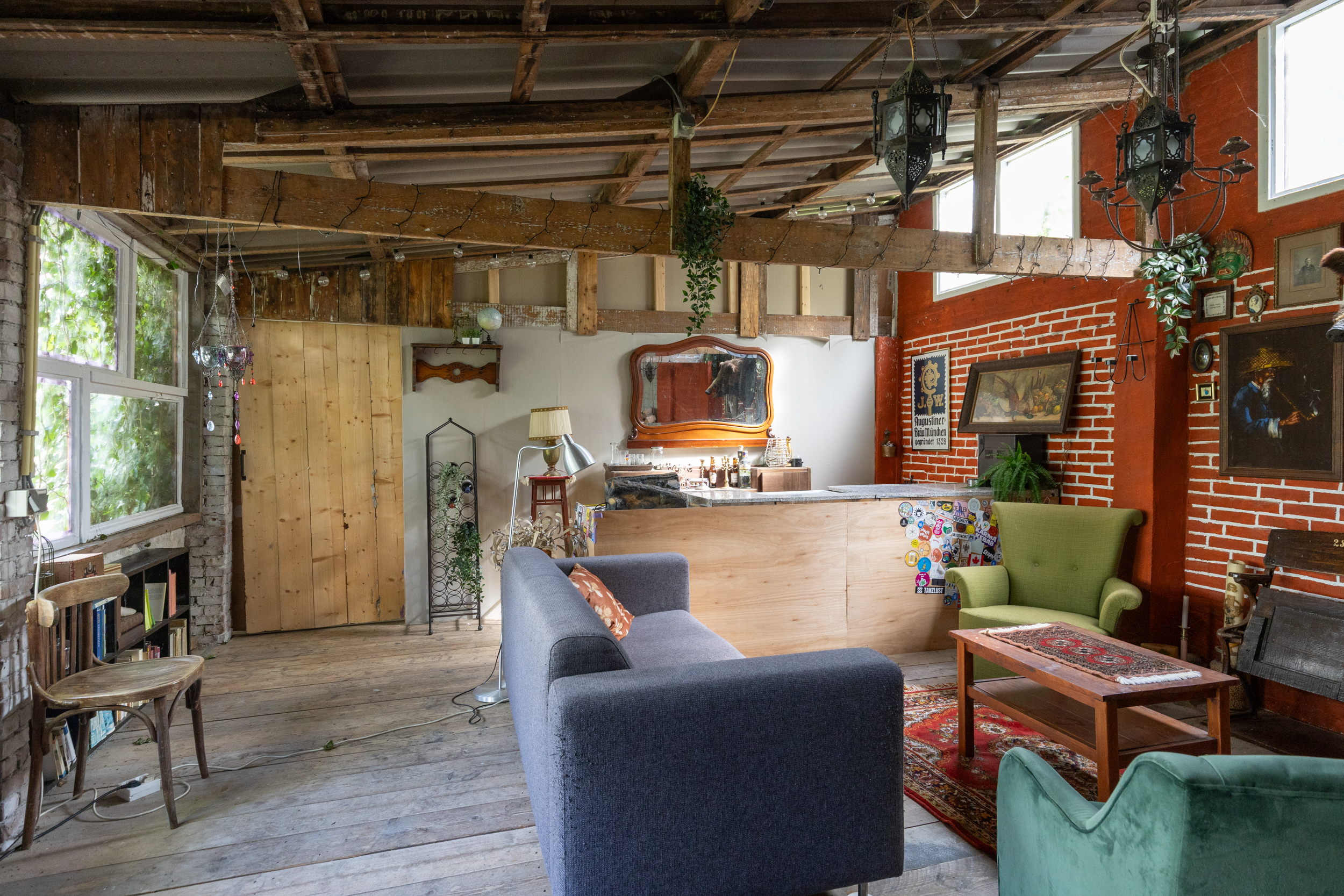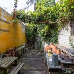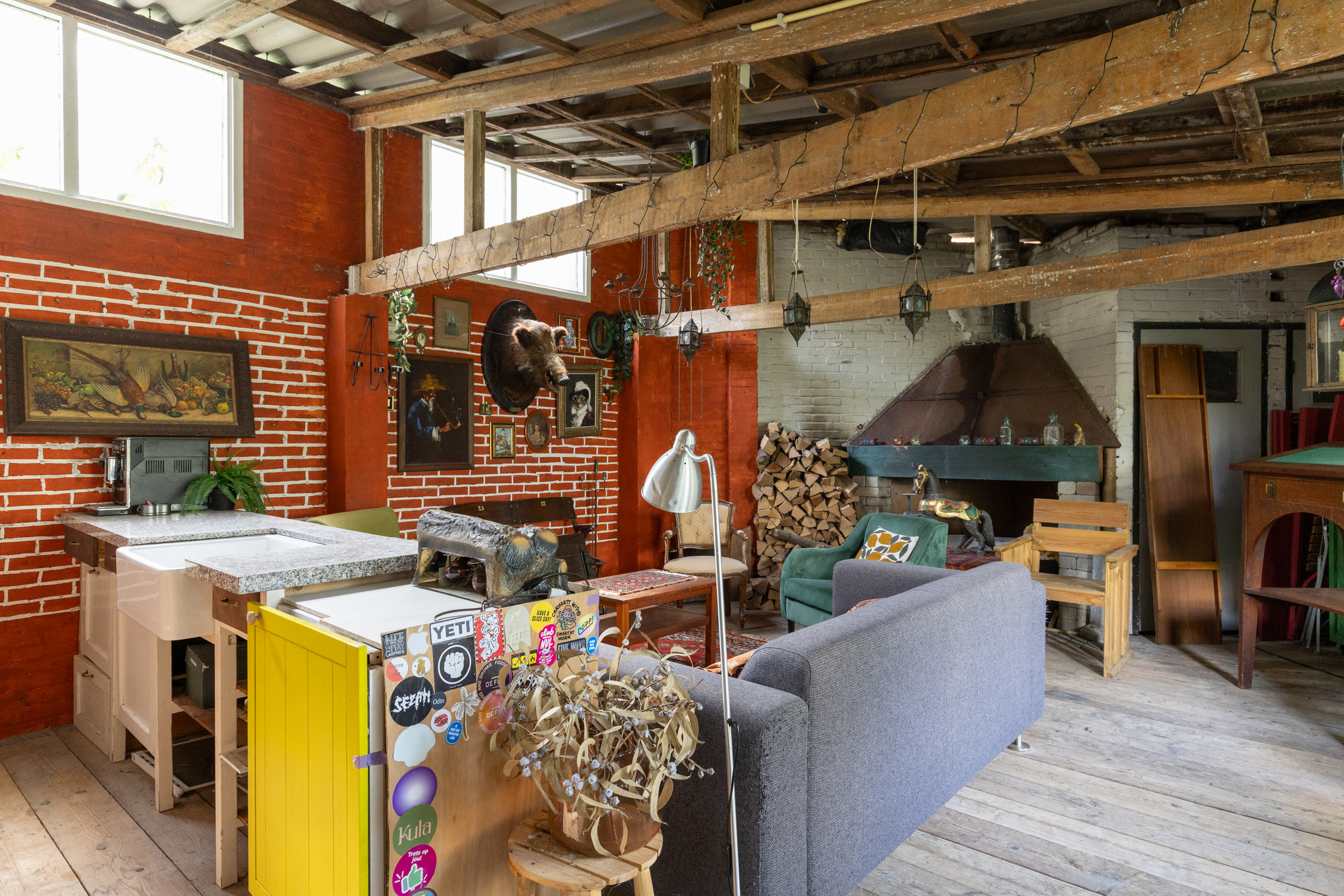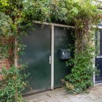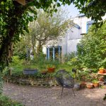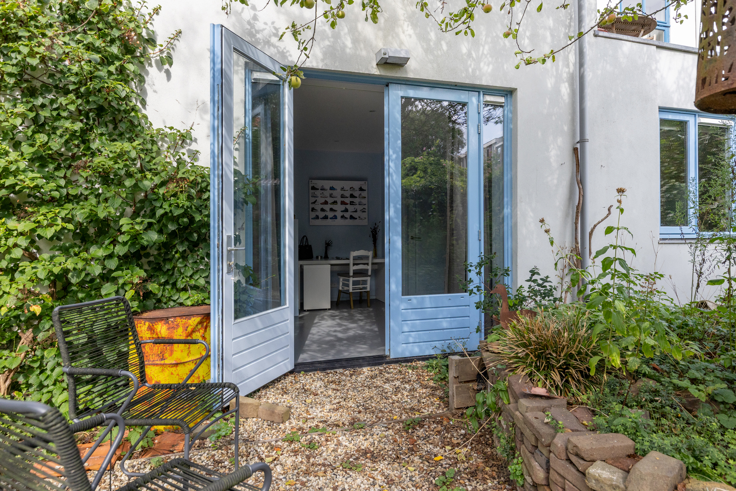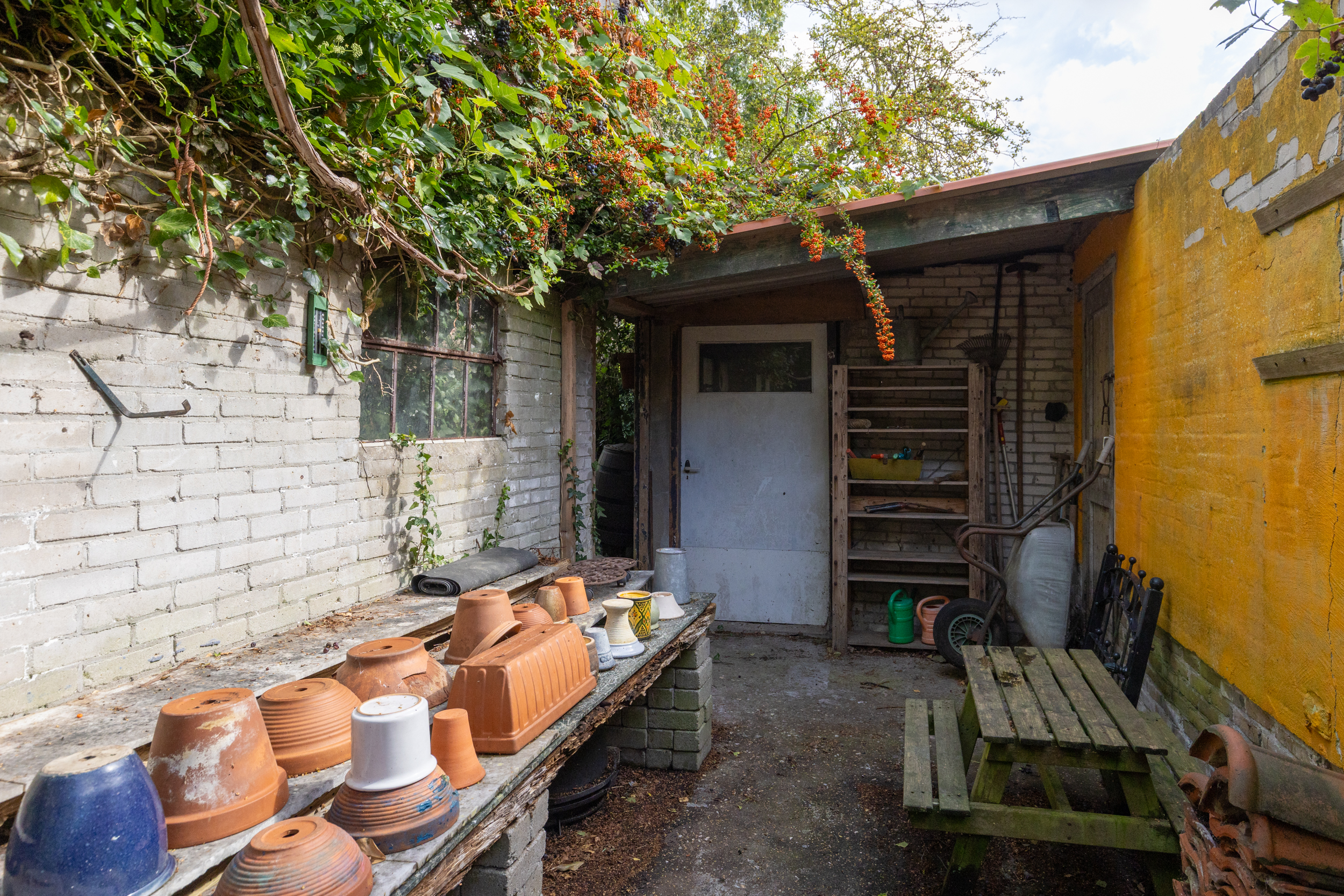 Wat de woning helemaal uniek maakt is de grote binnentuin met eigen opstallen, in totaal 350 m2, bereikbaar via een poort aan de straat. De boomrijke tuin, met o.a. James Grieve appels, vijgen, zwarte bessen en frambozen, ligt op het zuidwesten en heeft de hele dag zon. Zoals op de foto’s is te zien is een deel van de opstallen ingericht als een wel heel bijzondere chillplek.