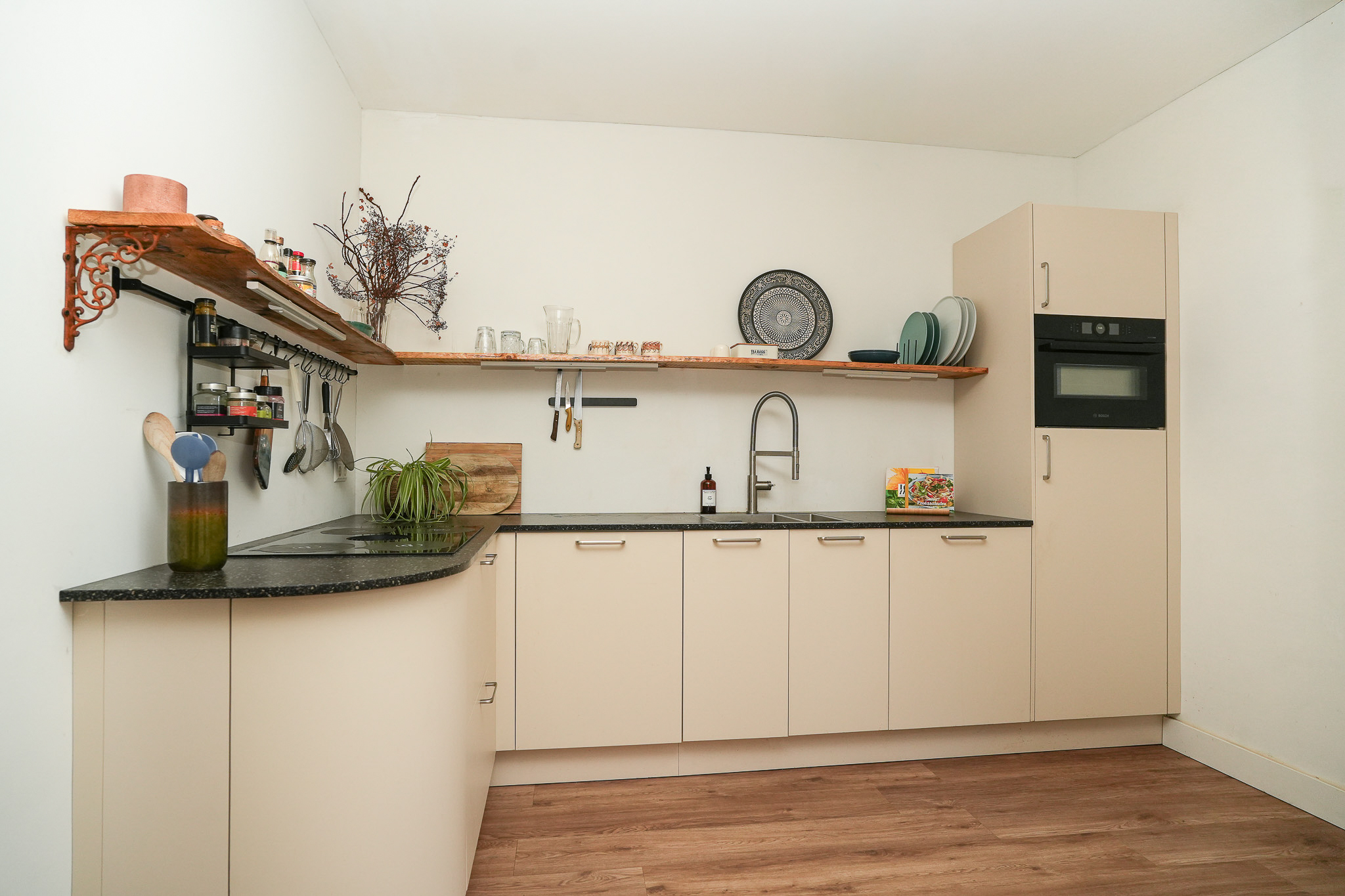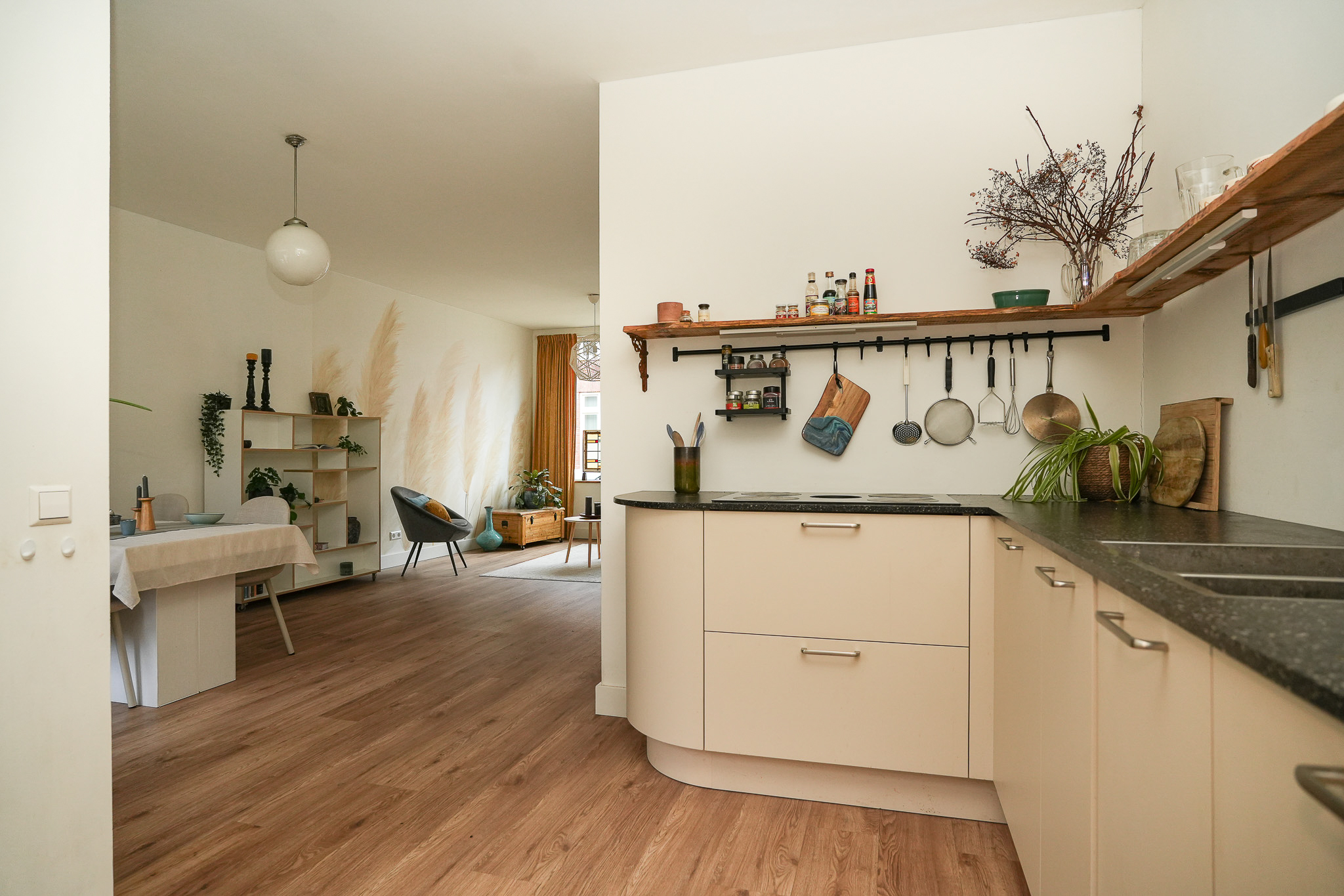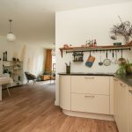 De doorzonwoonkamer is heerlijk licht en voelt direct ruim aan. Dankzij de grote raampartijen aan beide zijden geniet je hier de hele dag van natuurlijk licht. De open keuken sluit naadloos aan op het eetgedeelte, waardoor een fijne en gezellige leefruimte ontstaat. Tijdens het koken blijf je in contact met de rest van de leefruimte. De keuken is modern uitgevoerd en voorzien van een combi oven magnetron, koelkast, vriezer en een 4 pits inductiekookplaat met geïntegreerde afzuiging.