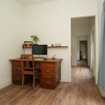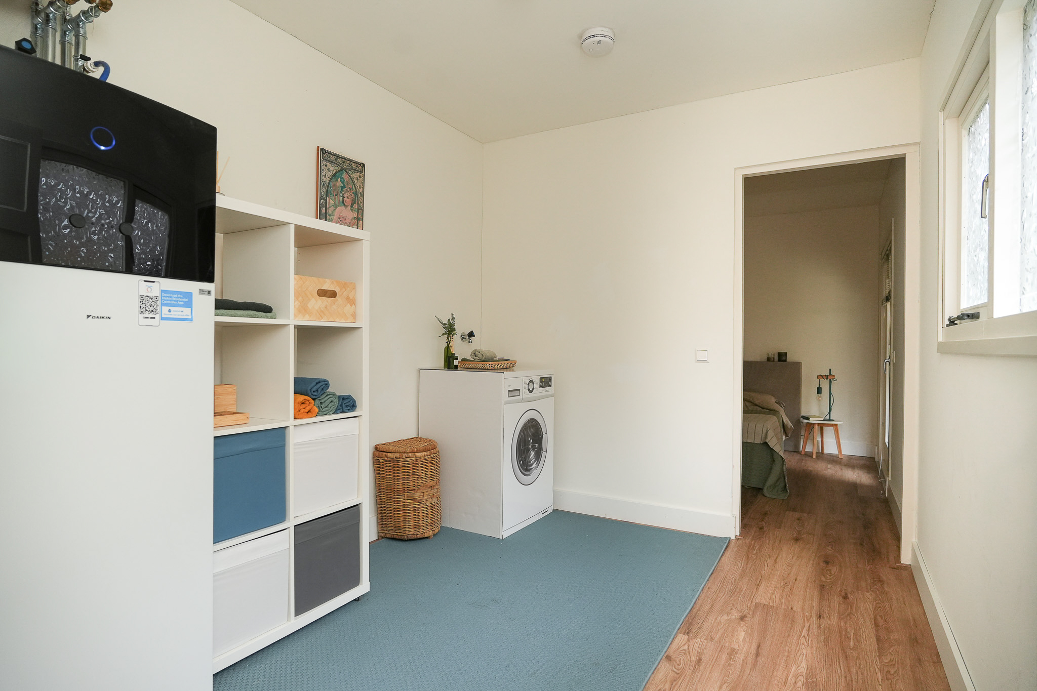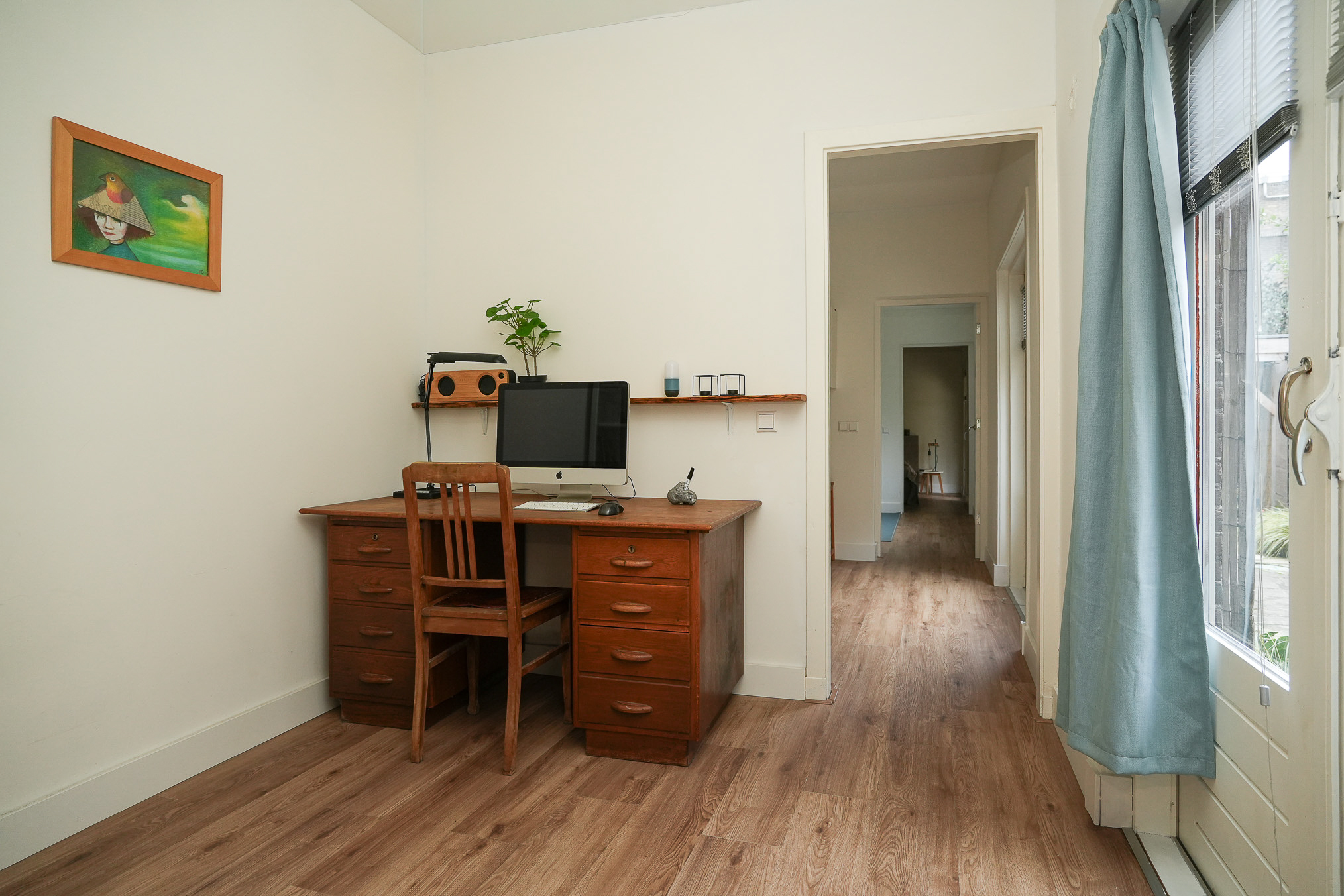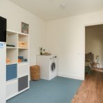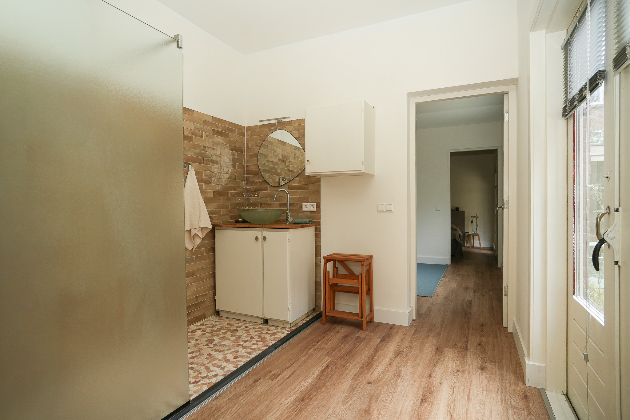 De werkkamer is ideaal als thuiswerkplek of logeerkamer. De badkamer is voorzien van een douche en wastafelmeubel en voelt dankzij de directe tuinverbinding extra licht en fris aan. Aansluitend bereik je de praktische tussenkamer die nu in gebruik is als wasruimte.