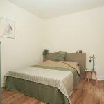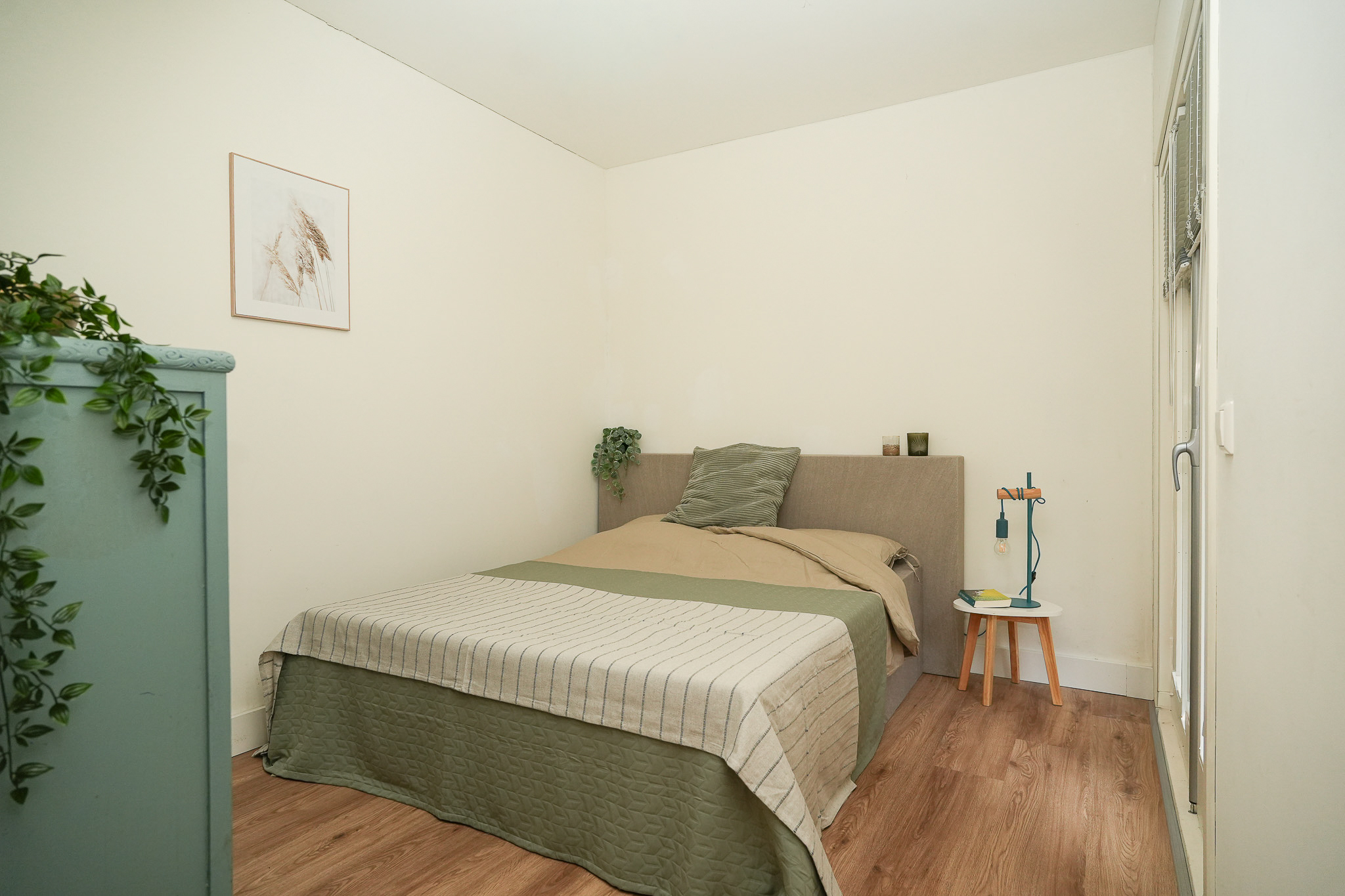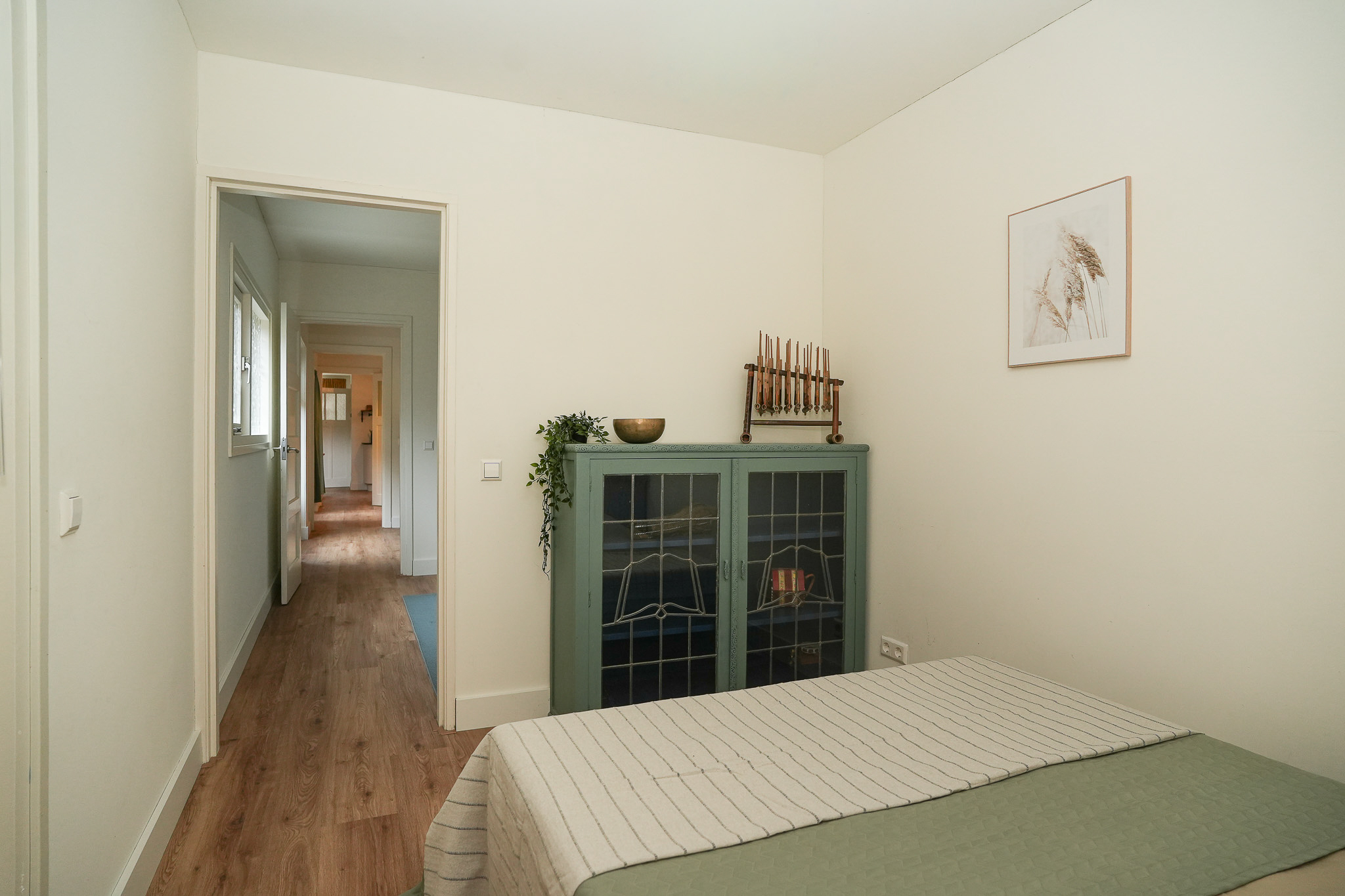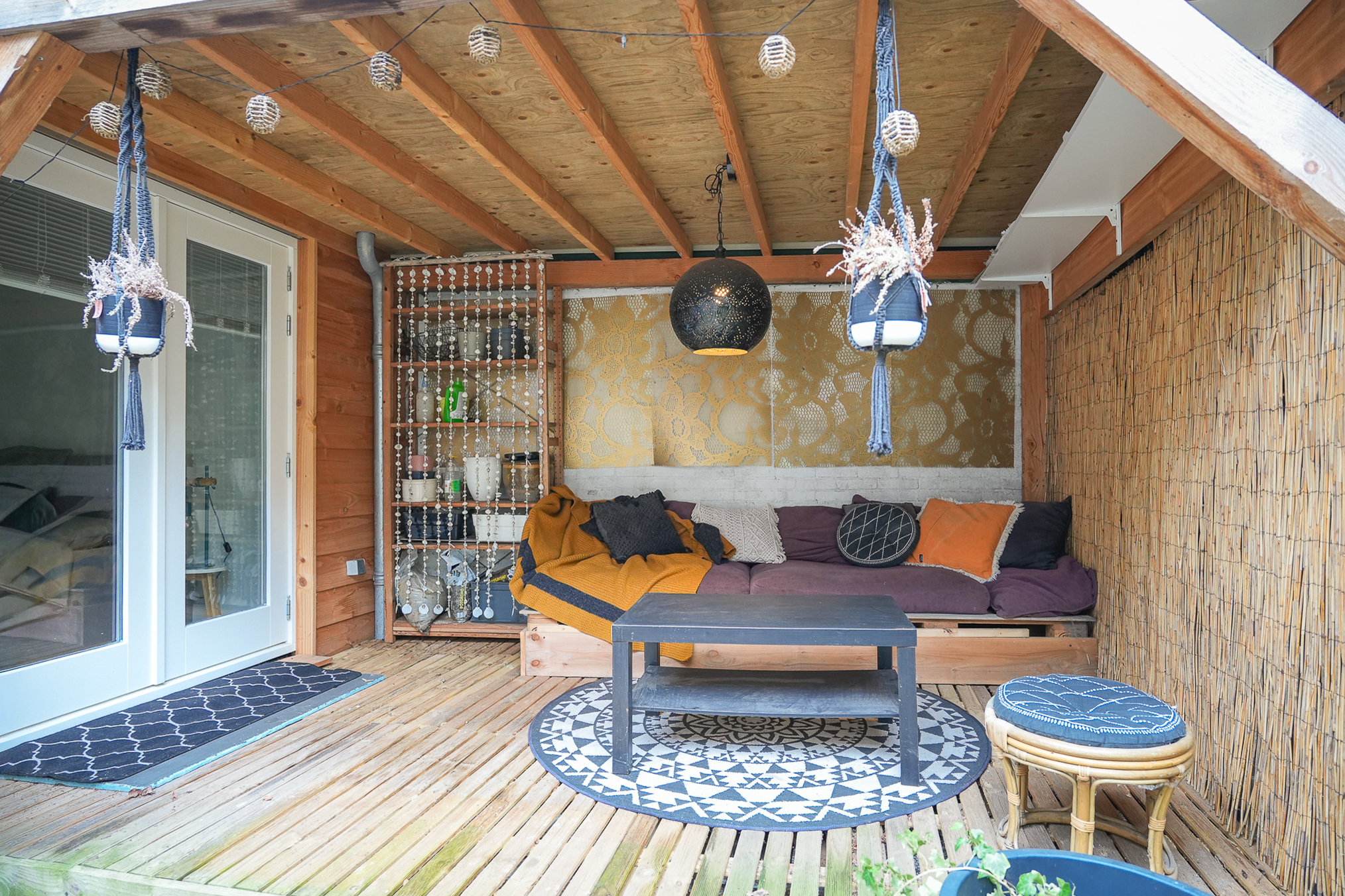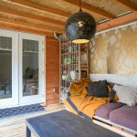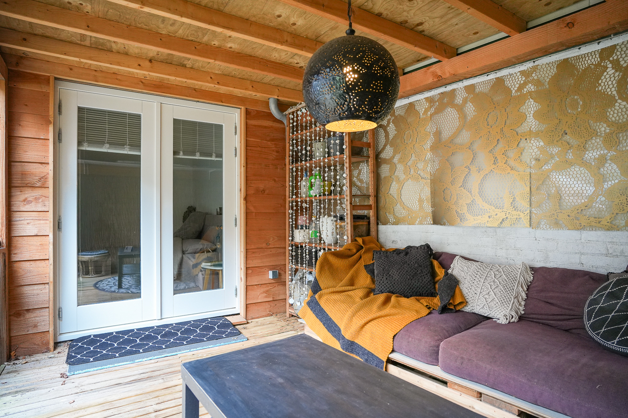 Helemaal achterin ligt de ruime slaapkamer met toegang tot de veranda. Word wakker, stap zo naar buiten en geniet van een kop koffie in de ochtendzon.