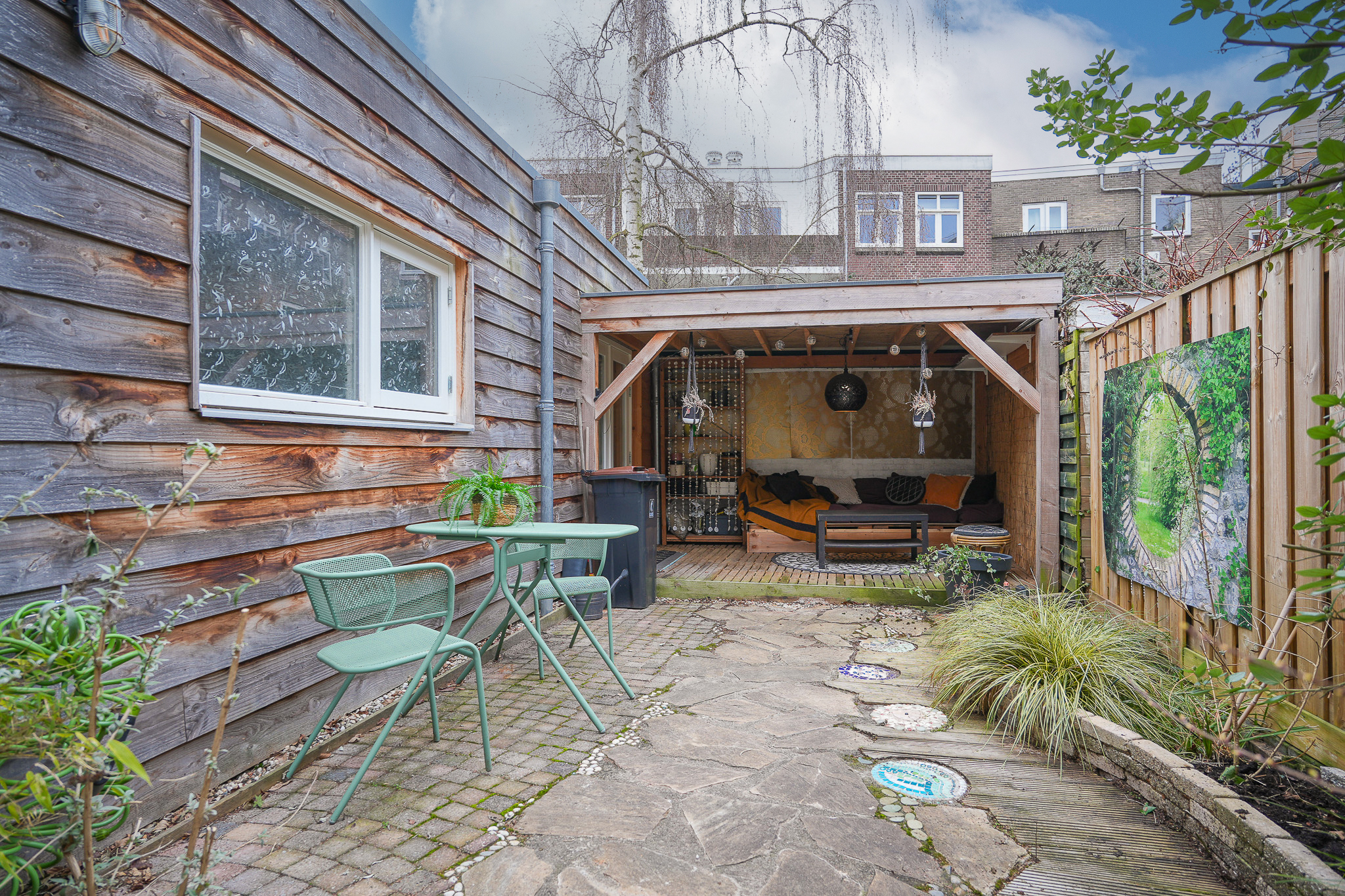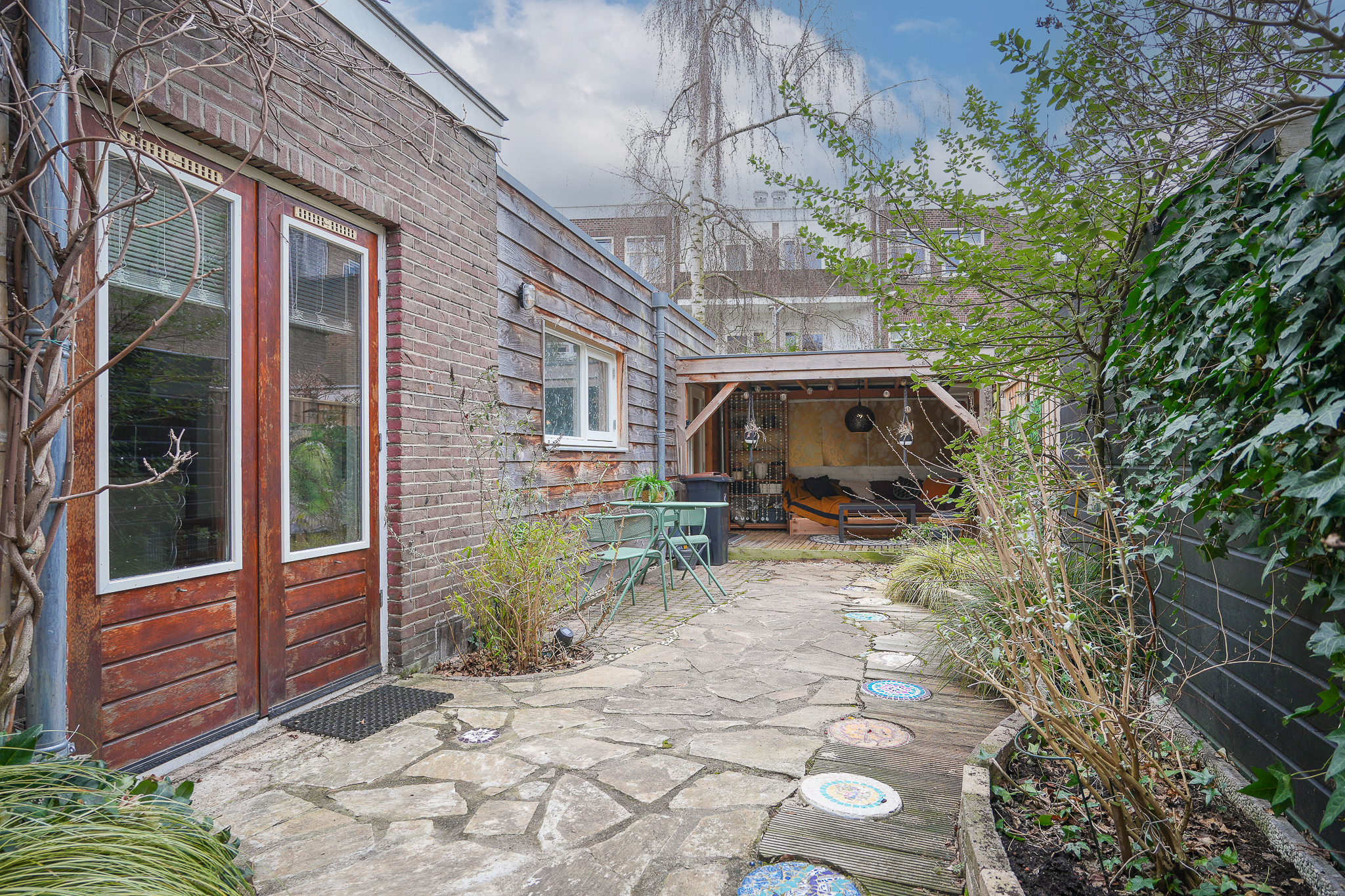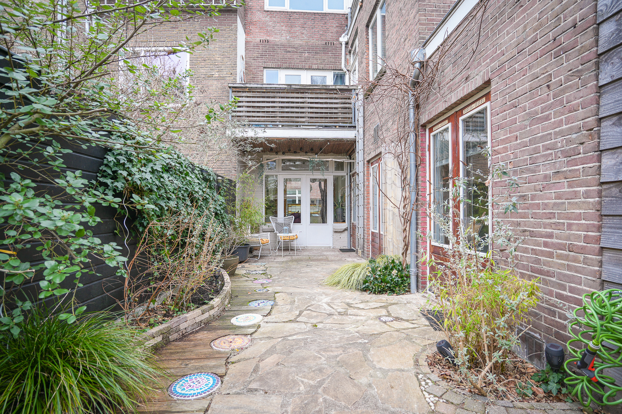 De tuin zelf is verzorgd en groen aangelegd met borders en meerdere fijne zitplekken. Direct aan het eetgedeelte bevindt zich een kleine overkapping, een gezellige plek om beschut buiten te zitten. Achter in de tuin vind je de veranda, een heerlijke plek om lange zomeravonden door te brengen.