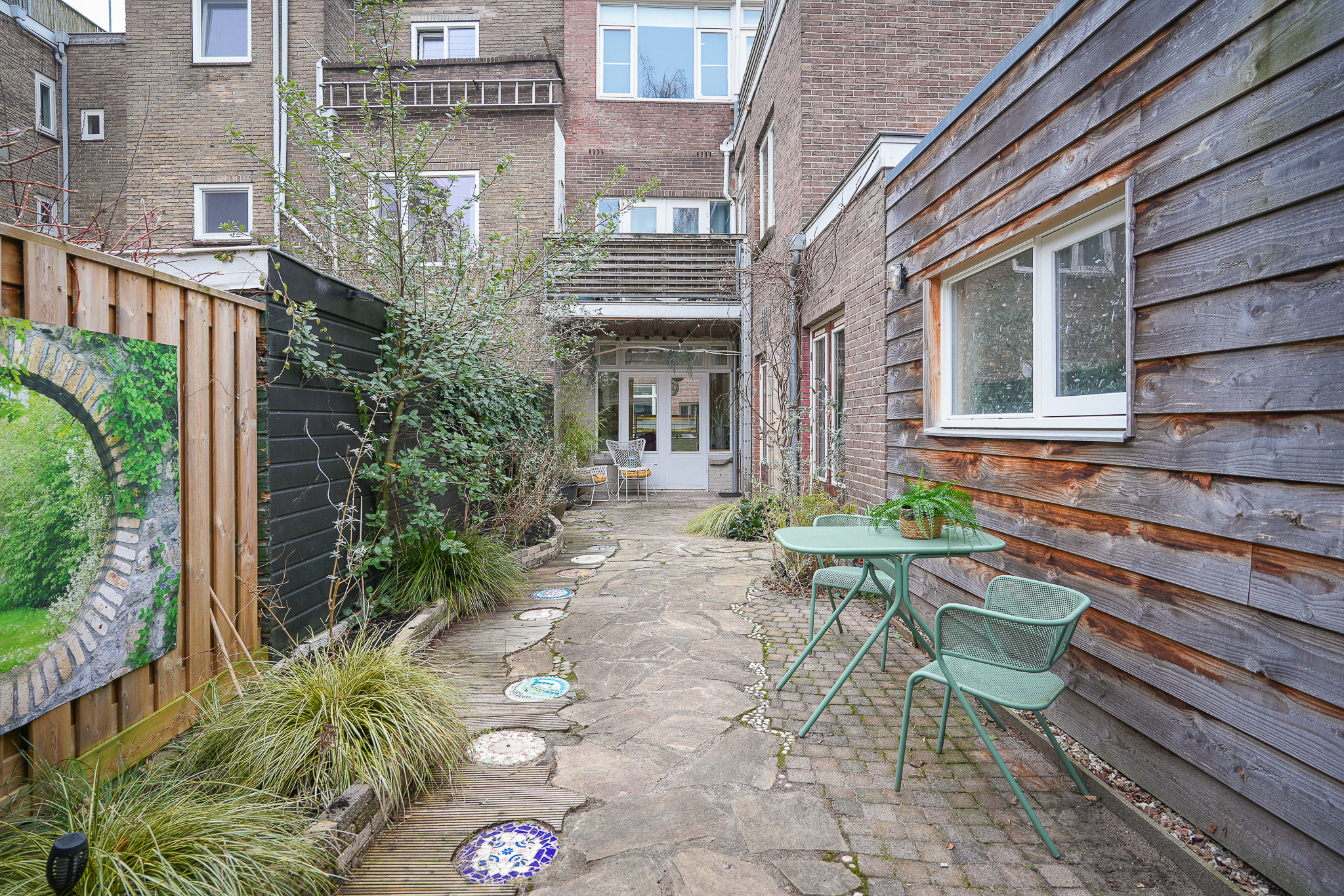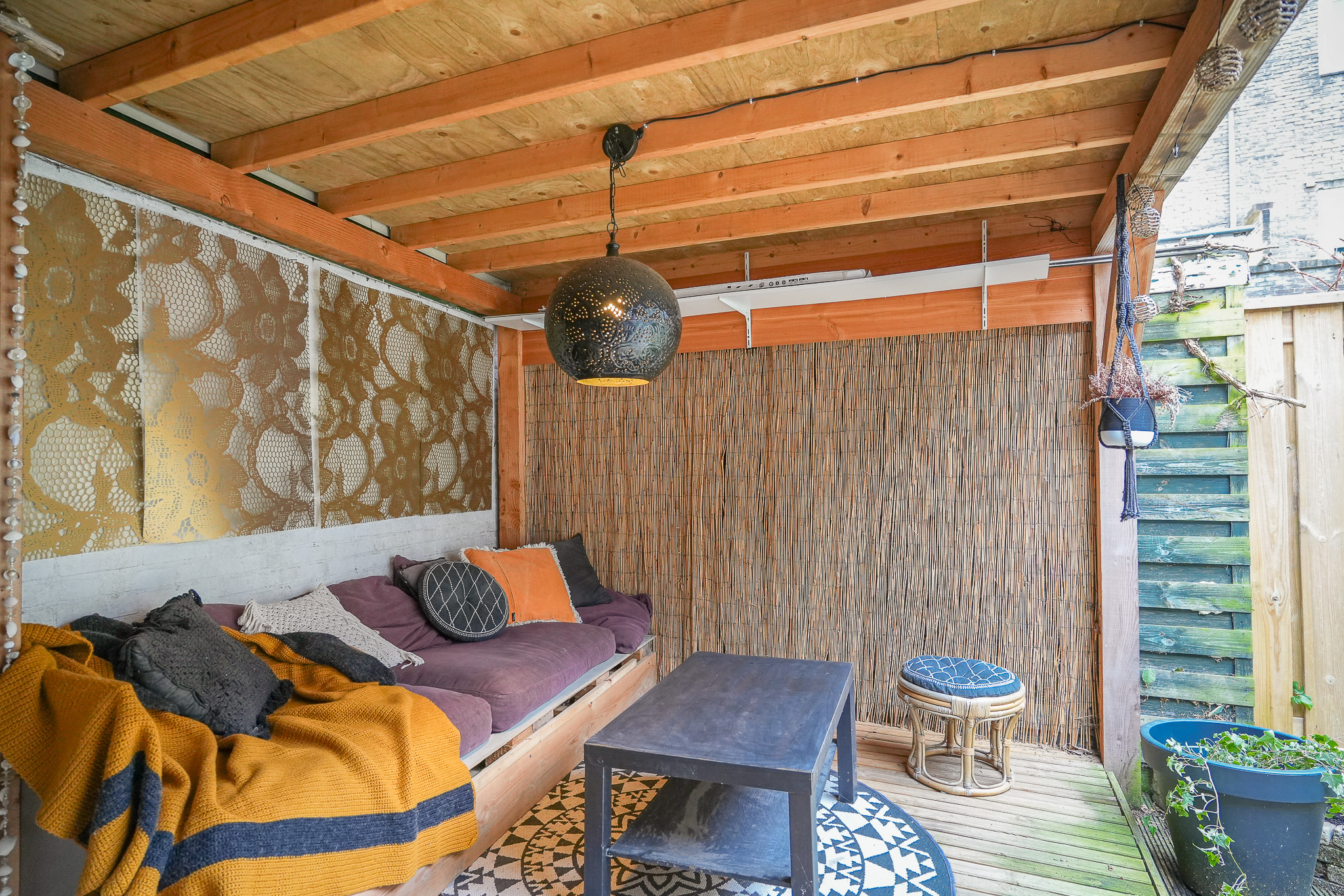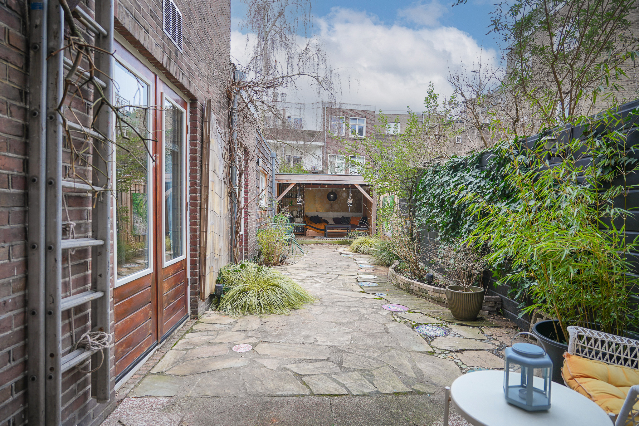 De tuin zelf is verzorgd en groen aangelegd met borders en meerdere fijne zitplekken. Direct aan het eetgedeelte bevindt zich een kleine overkapping, een gezellige plek om beschut buiten te zitten. Achter in de tuin vind je de veranda, een heerlijke plek om lange zomeravonden door te brengen.