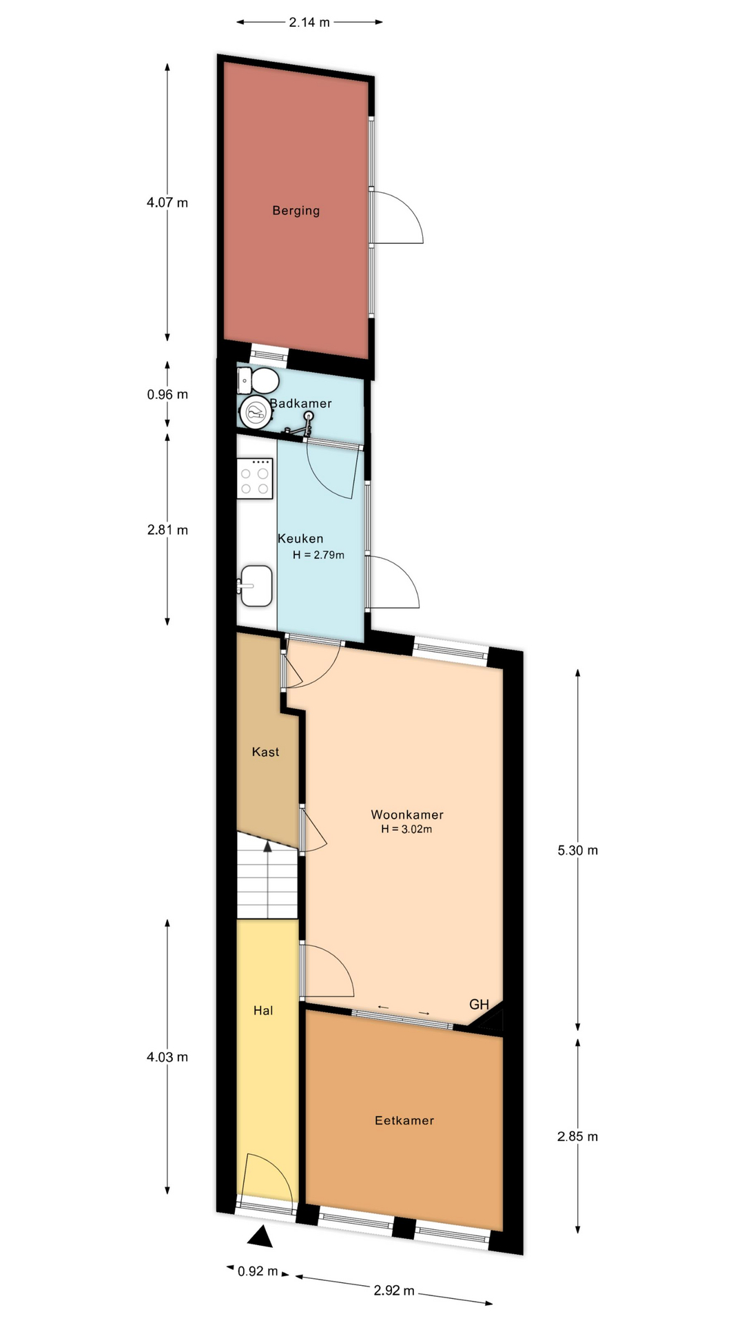 Je komt binnen in de hal met trapopgang en toegang tot de eetkamer aan de voorzijde. Via en suite deuren bereik je de woonkamer. De keuken aan de achterzijde is eenvoudig uitgevoerd en beschikt over een wasmachineaansluiting. Aansluitend vind je de badkamer met douche, toilet en een elektrische boiler. Vanuit de keuken heb je toegang tot de achtertuin op het noordoosten. Hier kun je ’s ochtends heerlijk in het zonnetje zitten. Achterin de tuin staat de berging, die eventueel gesloopt kan worden om een breder stuk tuin te realiseren.