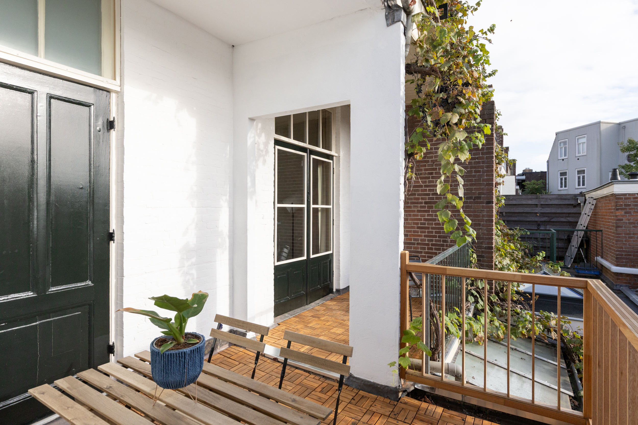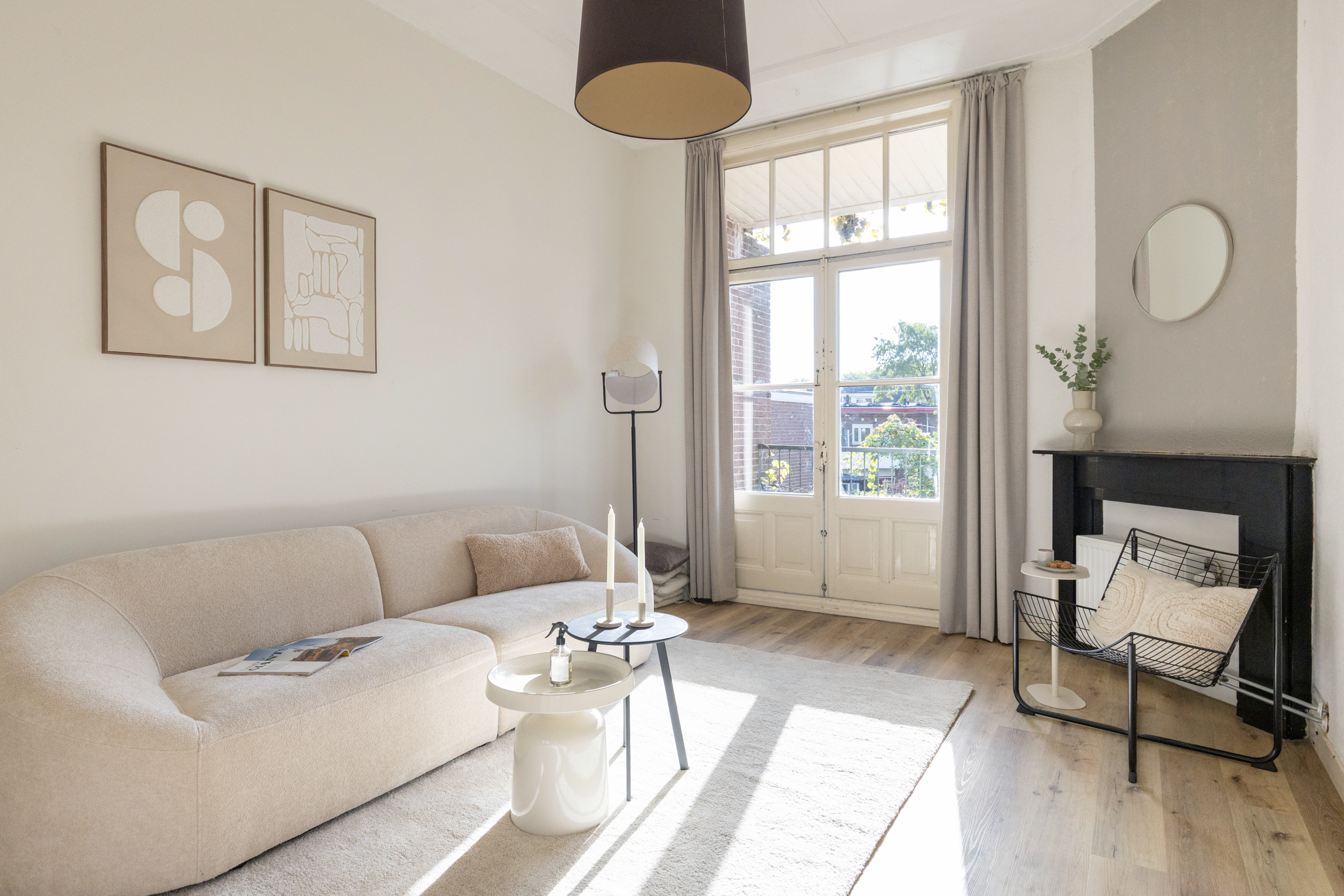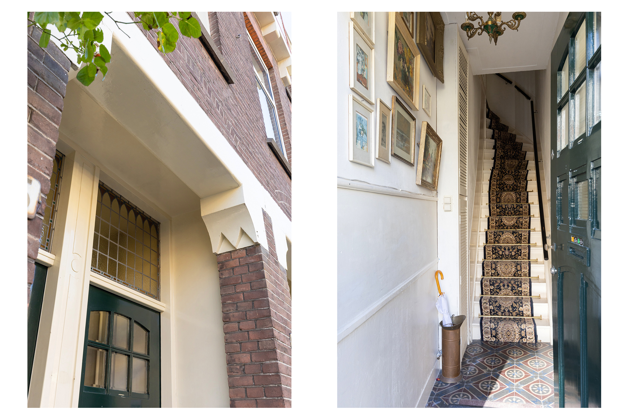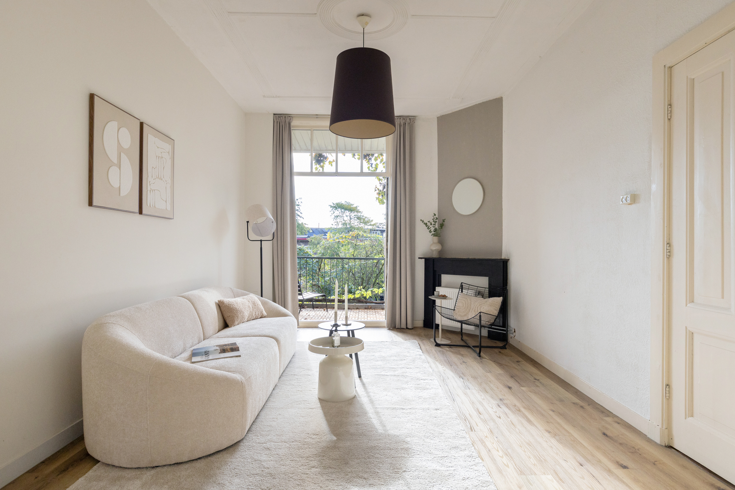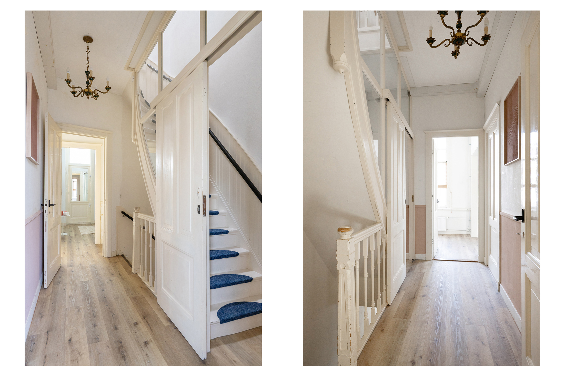 Via je eigen entree kom je op de eerste verdieping. De royale woonkamer is een echte eyecatcher, met sfeervolle ensuite-deuren en handige inbouwkasten. Zowel in de eetkamer als in de woonkamer vind je originele schouwen. Vanuit de woonkamer loop je via dubbele deuren door naar het ruime balkon op het westen. Een ideale plek om te genieten van de middag/avondzon. Ook de badkamer geeft toegang tot dit balkon.