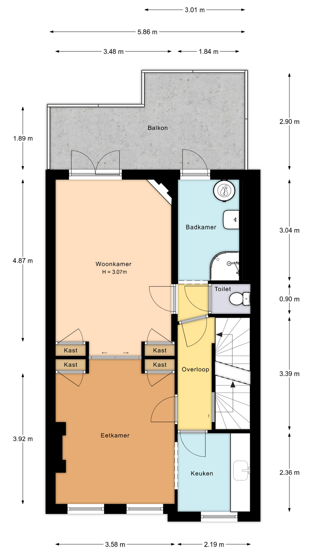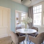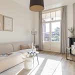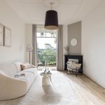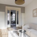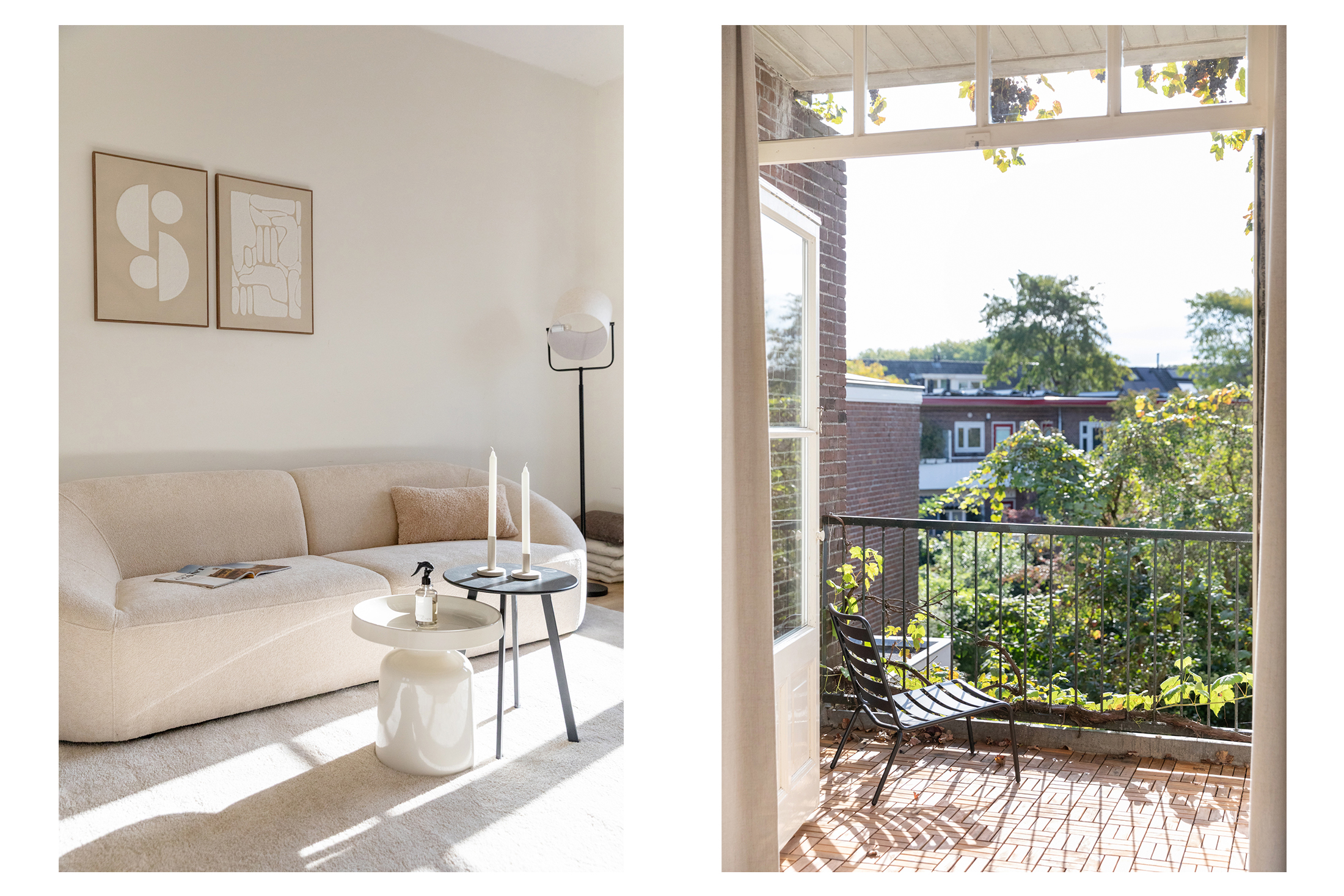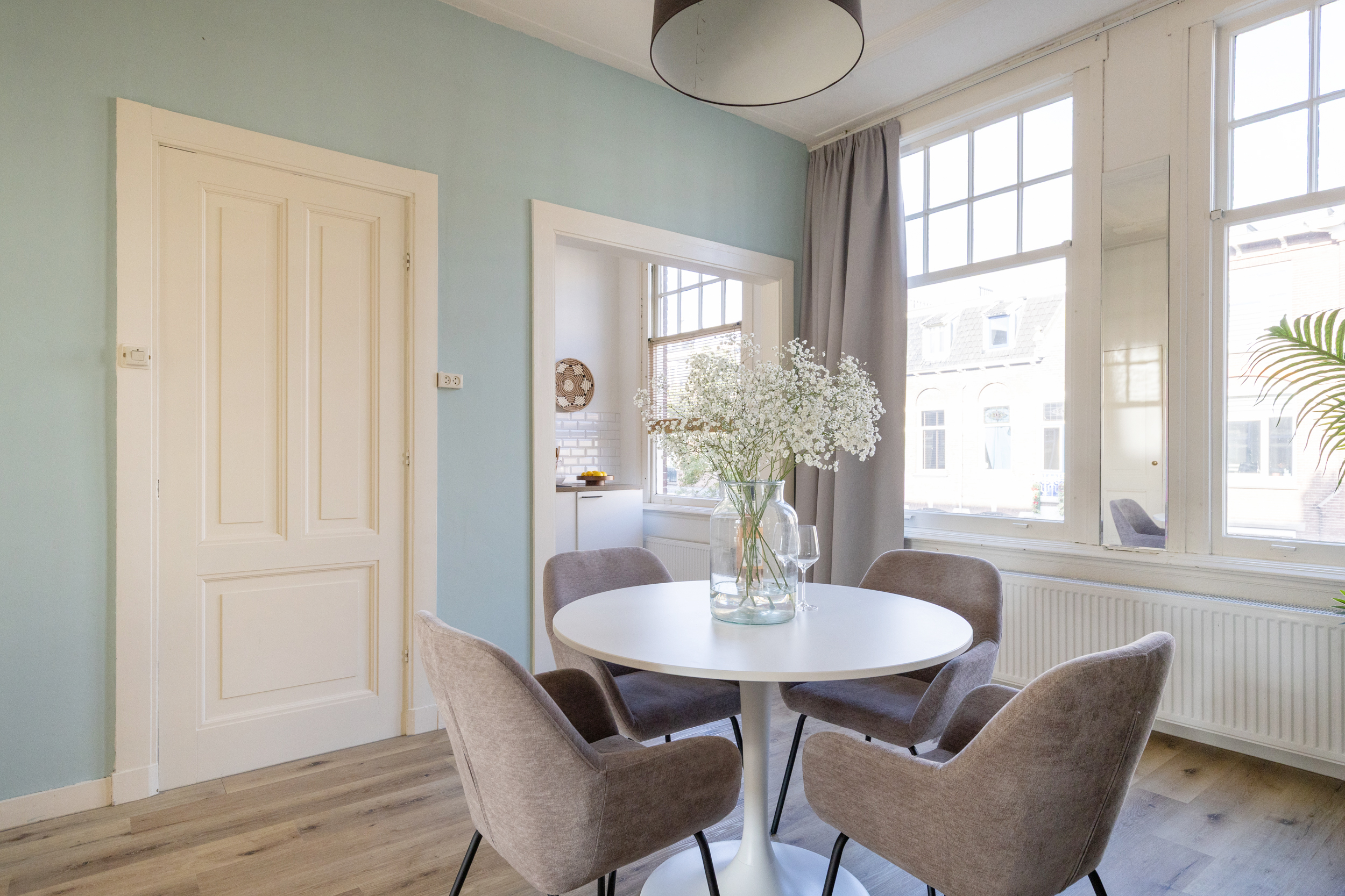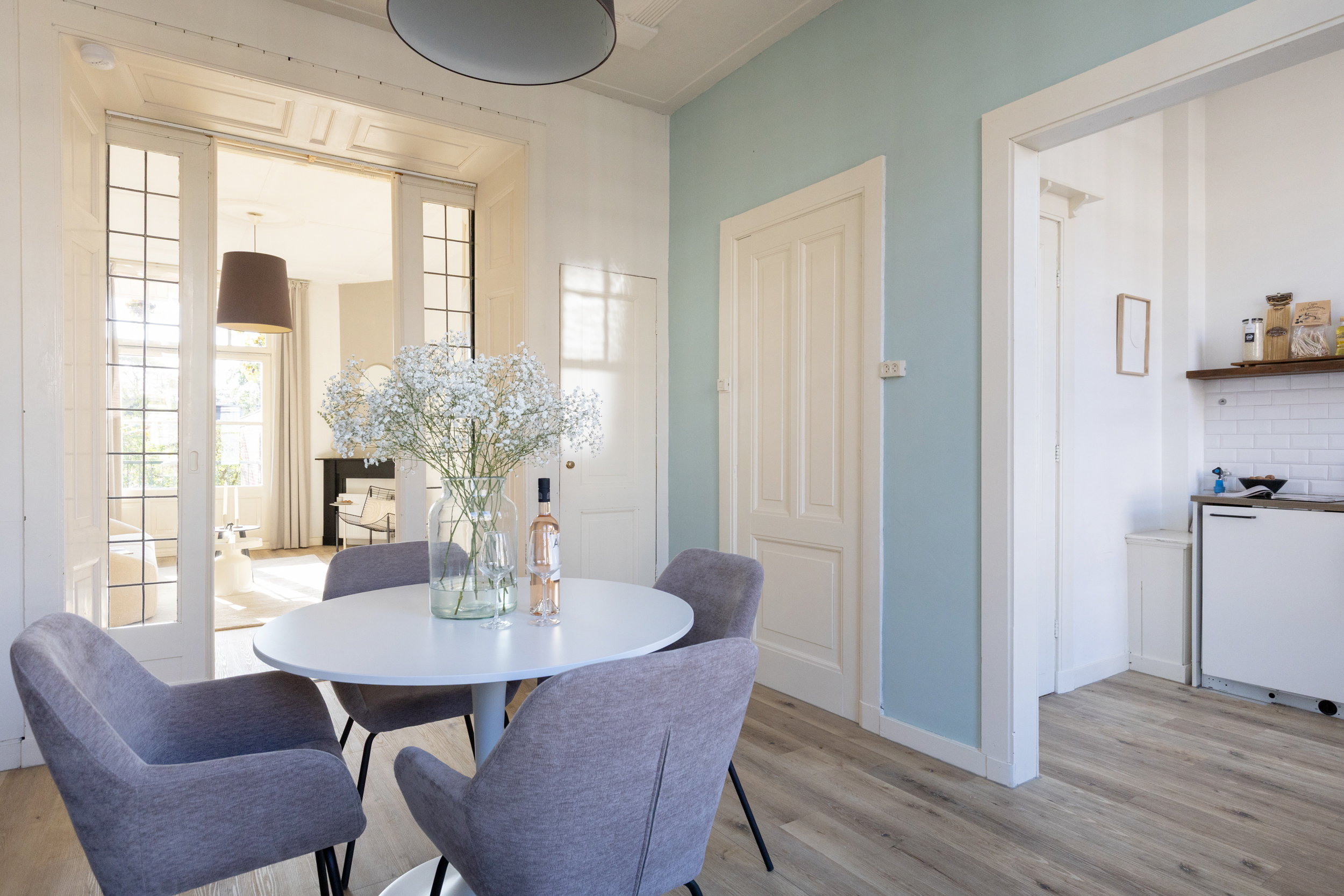 Via je eigen entree kom je op de eerste verdieping. De royale woonkamer is een echte eyecatcher, met sfeervolle ensuite-deuren en handige inbouwkasten. Zowel in de eetkamer als in de woonkamer vind je originele schouwen. Vanuit de woonkamer loop je via dubbele deuren door naar het ruime balkon op het westen. Een ideale plek om te genieten van de middag/avondzon. Ook de badkamer geeft toegang tot dit balkon.