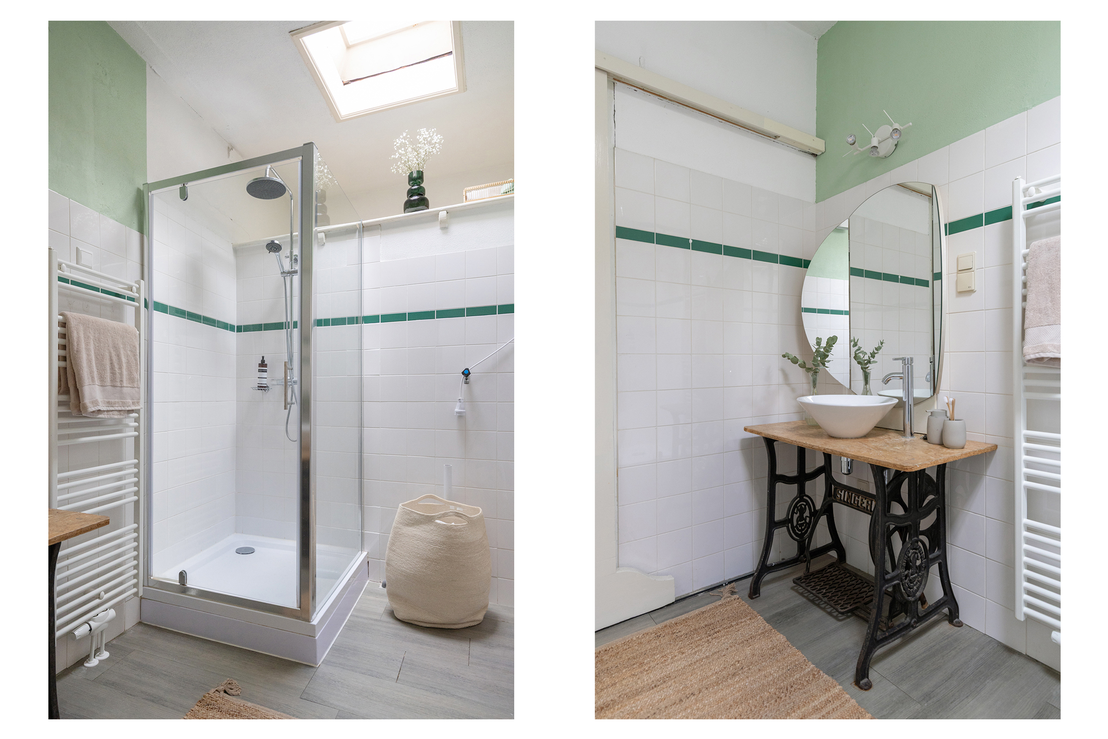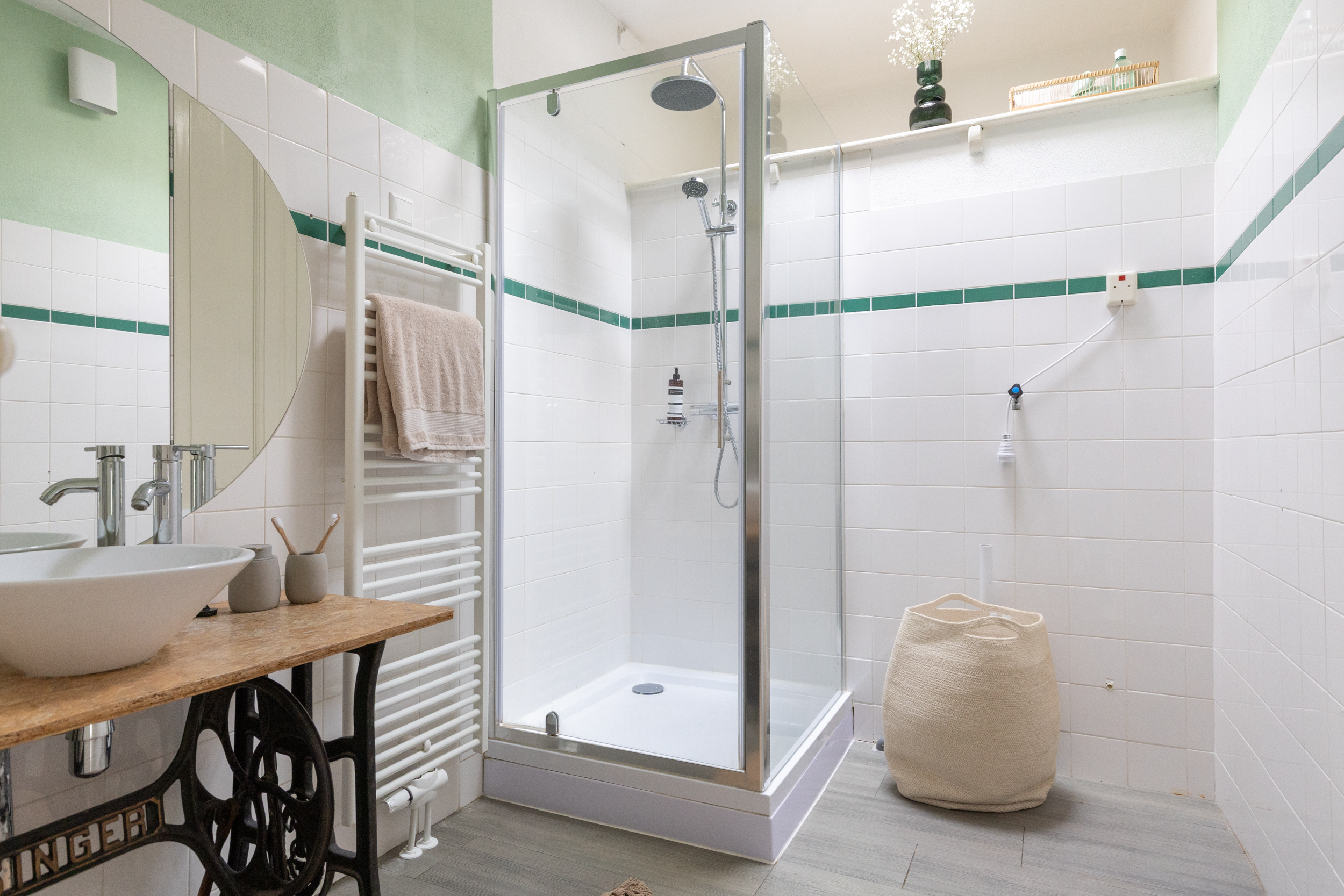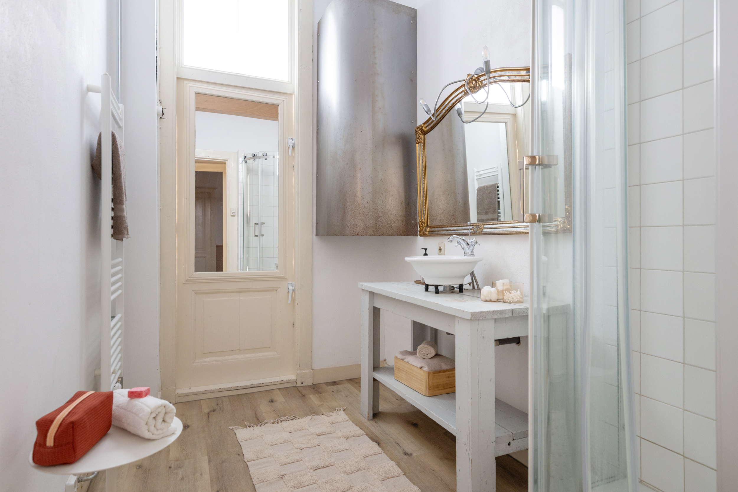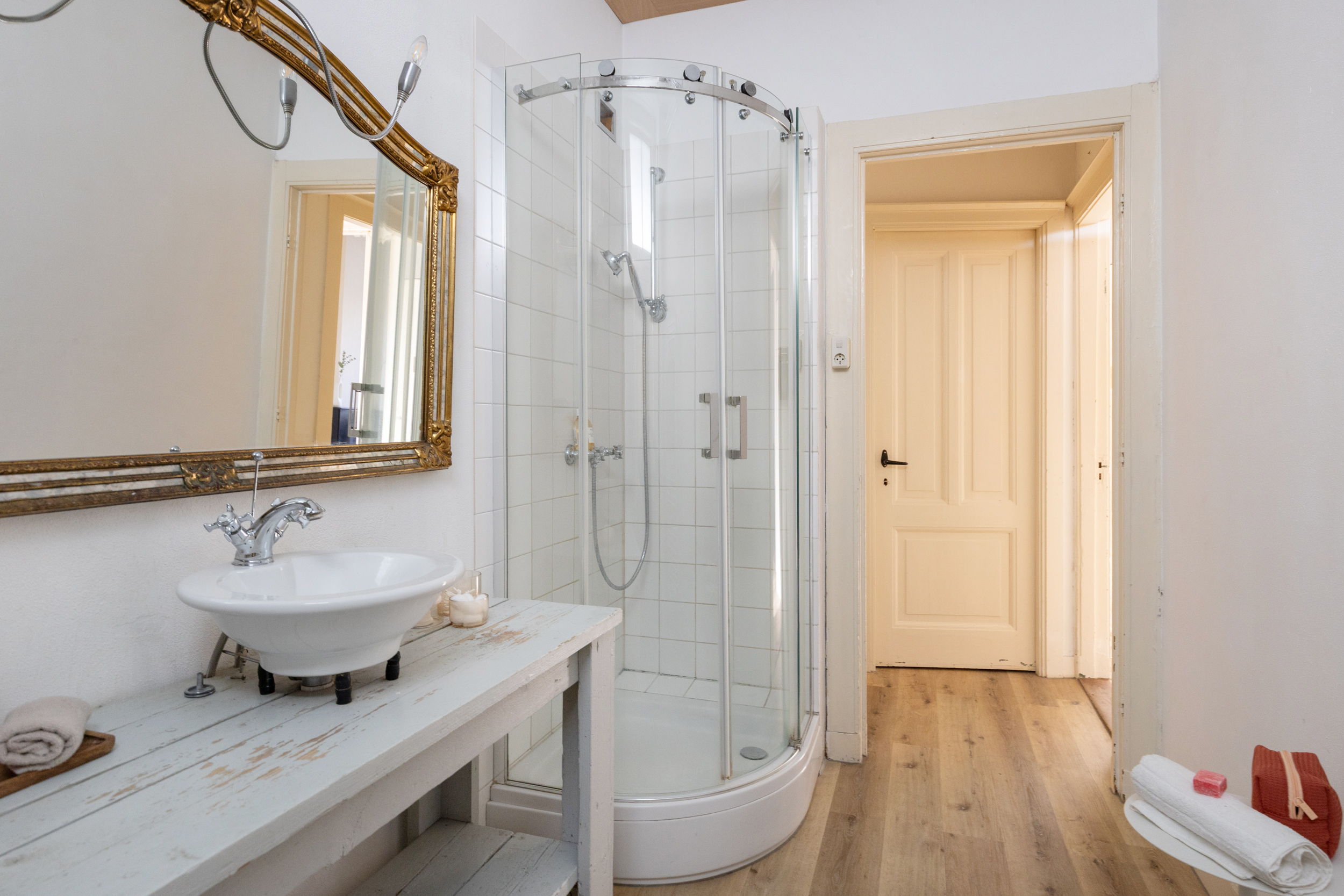 De tweede badkamer is ingericht met douche, wastafel, witgoedaansluiting en designradiator. Net als op de eerste verdieping is er ook hier een apart toilet. Indien wenselijk is deze woning, dankzij de dubbele voorzieningen, bijzonder geschikt om met twee personen of huishoudens te bewonen; ieder met voldoende privacy en eigen ruimte.